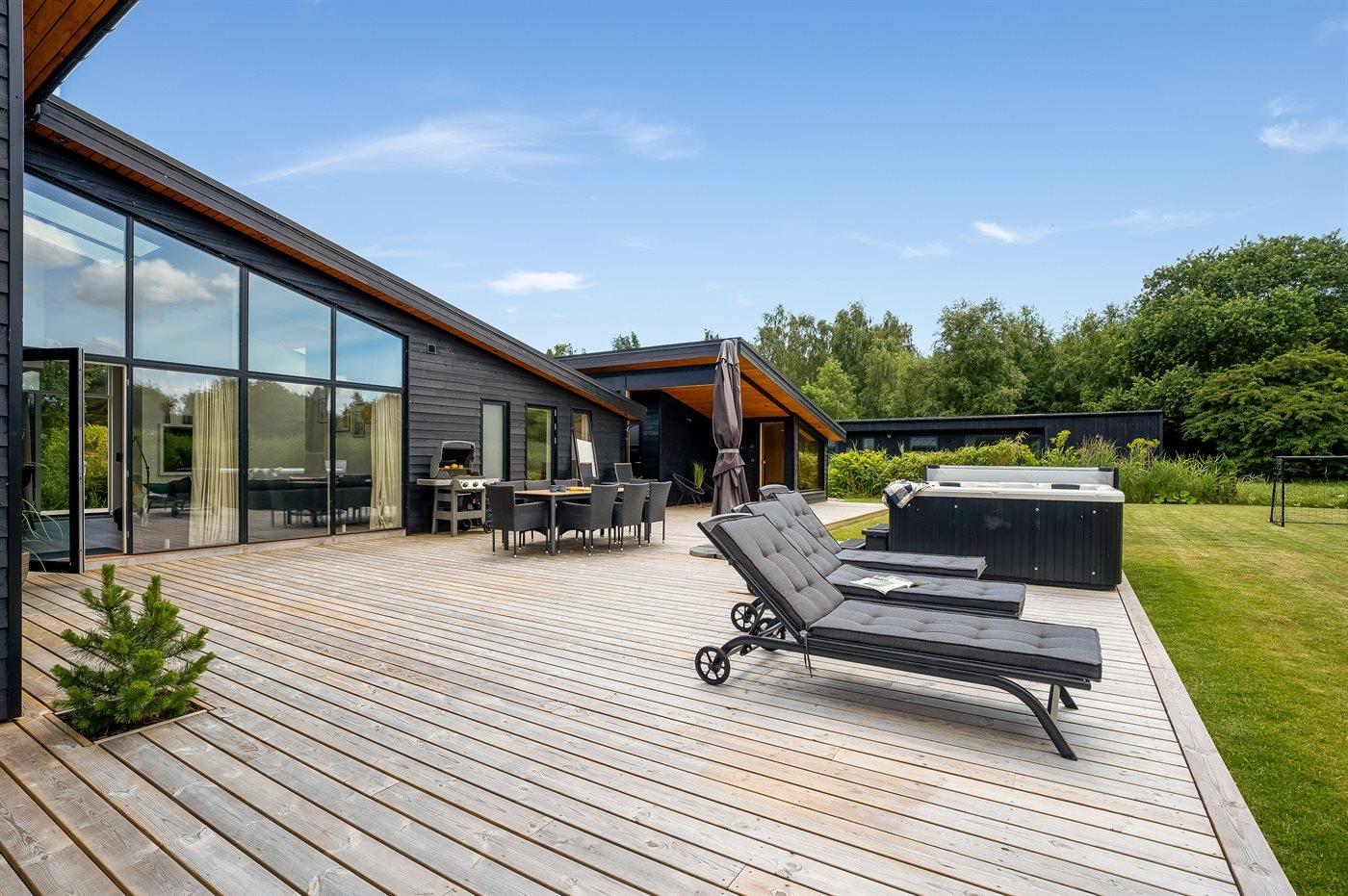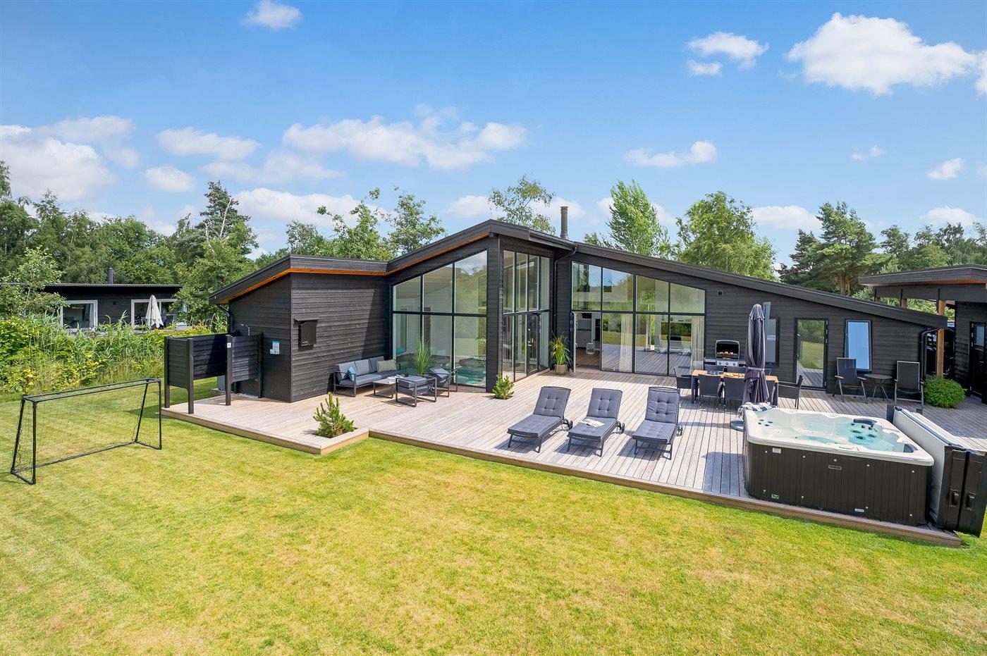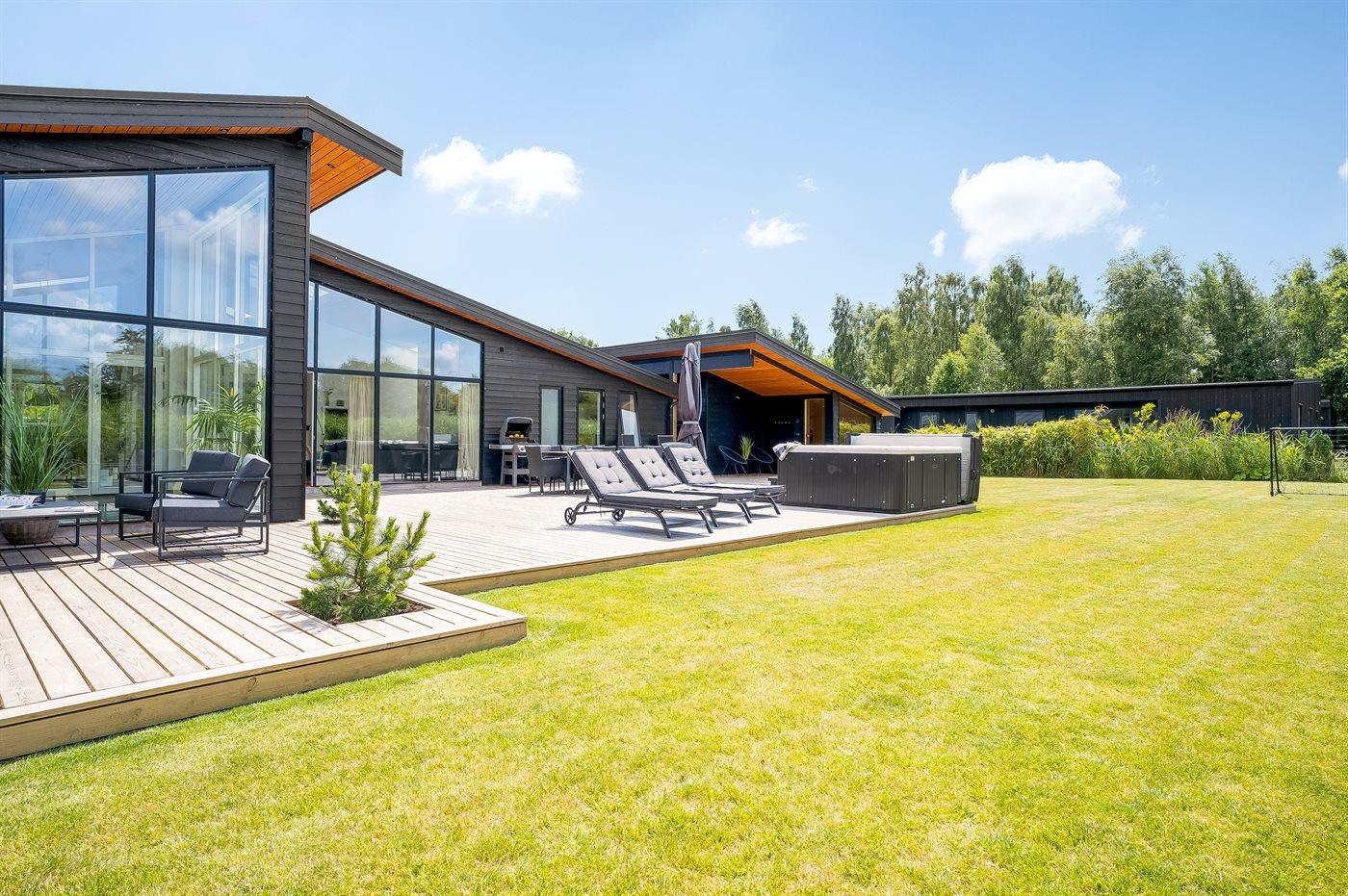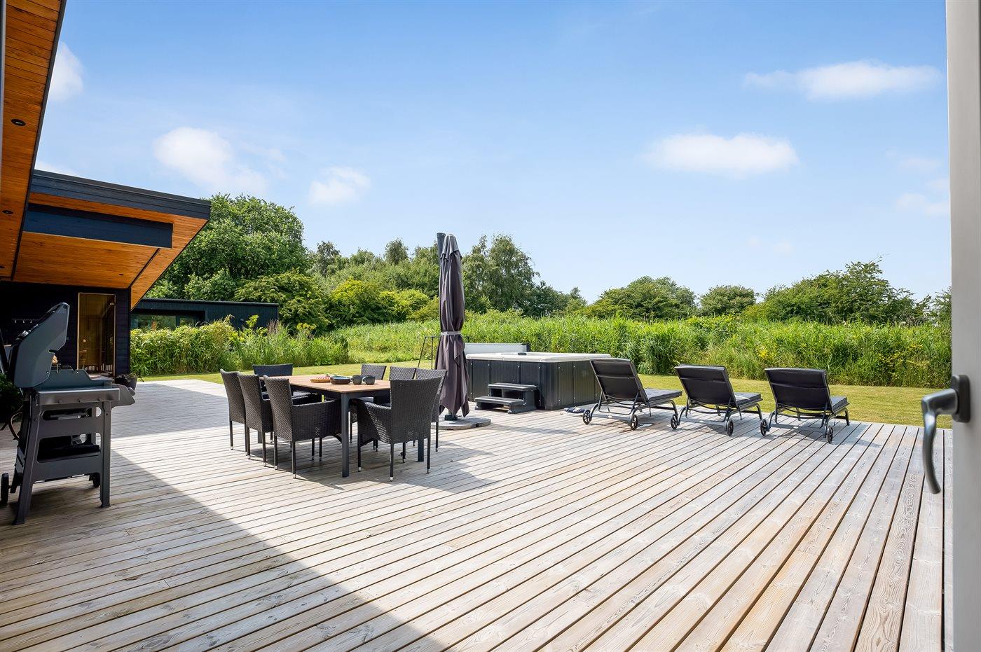 Fritidsbostaden ligger på en 940 m² stor anlagd trädgård. Avstånd till hav är 900 m. Närmeste affär ligger på ett avstånd av 400 m. Det finns en golfbana på ett avstånd av 2000 m. Till fritidsbostaden hör terrass. Dessutom finns det övertäckt terrass. Fotbollsmål. Avstånd till en lekplats er 1000 m. Utomhus sauna. Utomhus dusch. Det finns grill til förfogande. Det finns carport till förfogande. Det finns uttag för att ladda elbil vid huset. CEE kontakt. Med 11 kW laddningseffekt. P-plats på tomten.