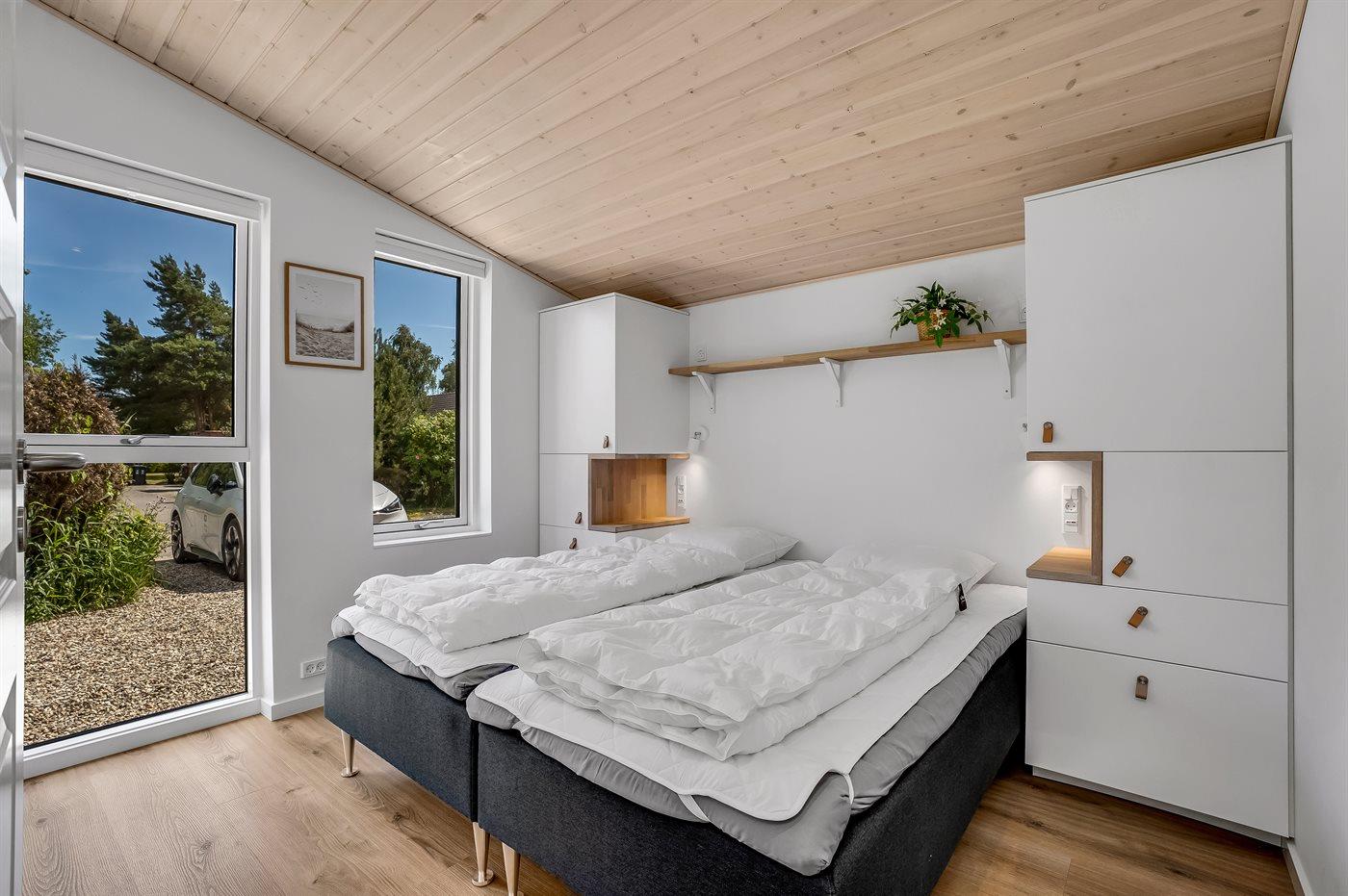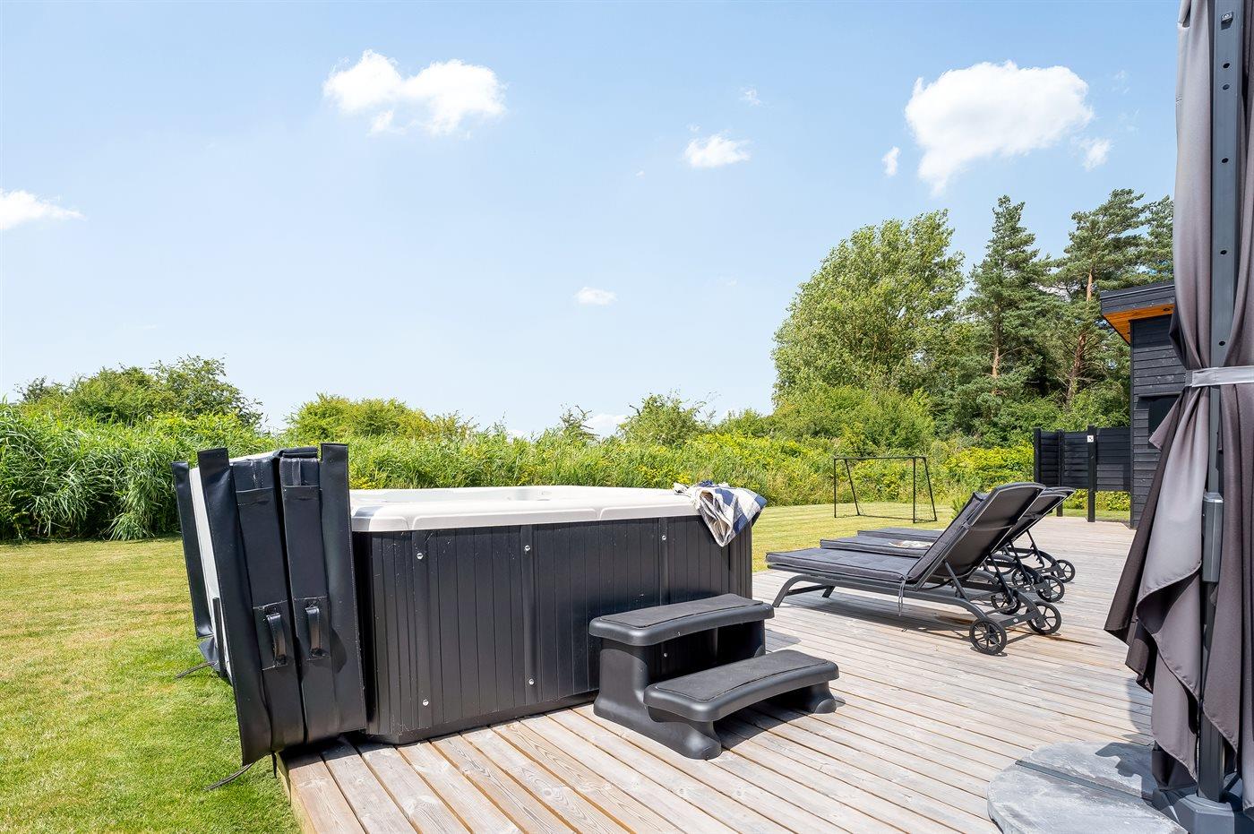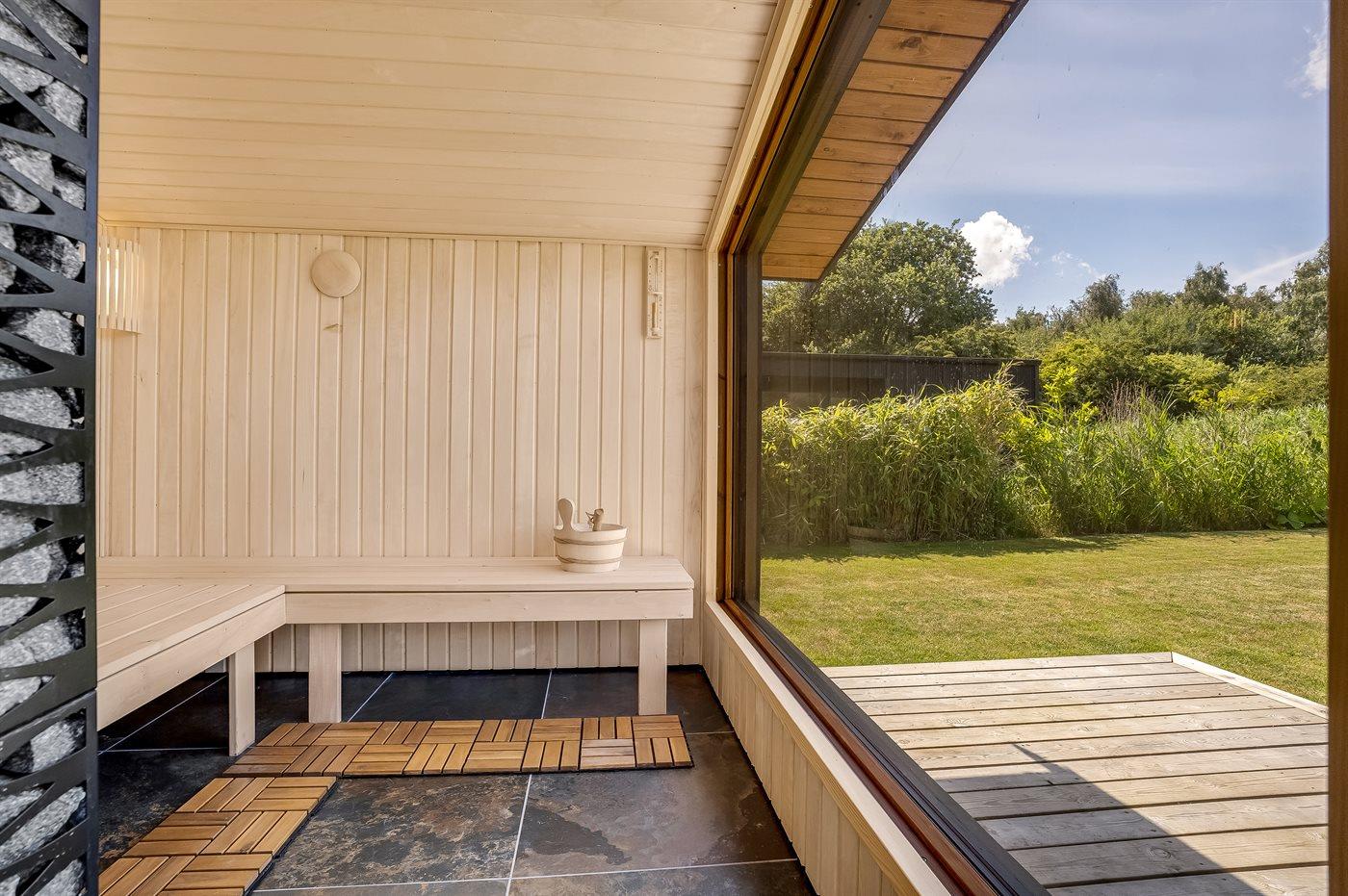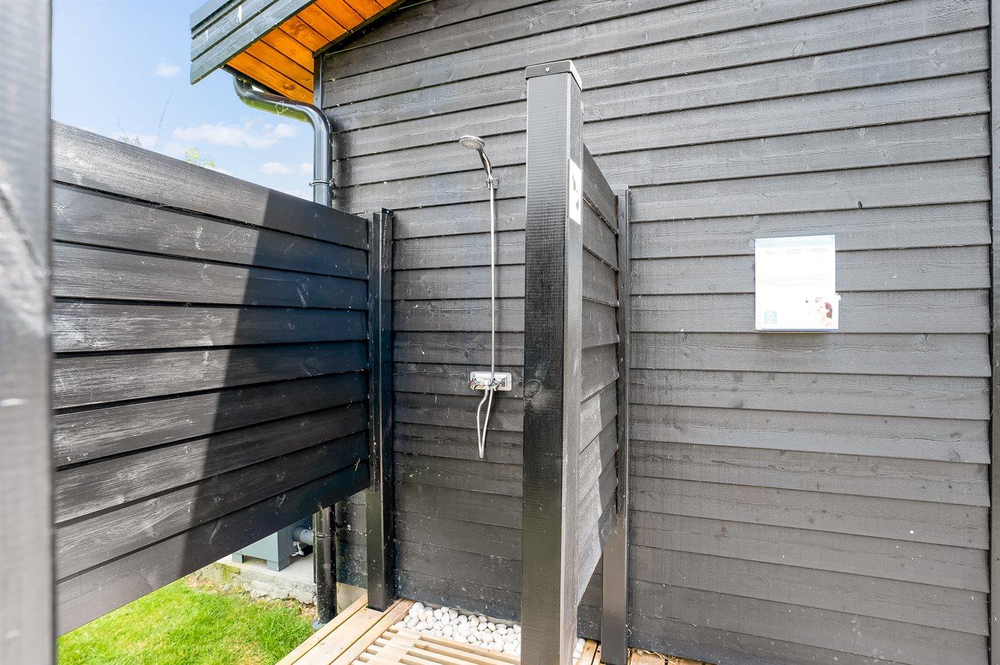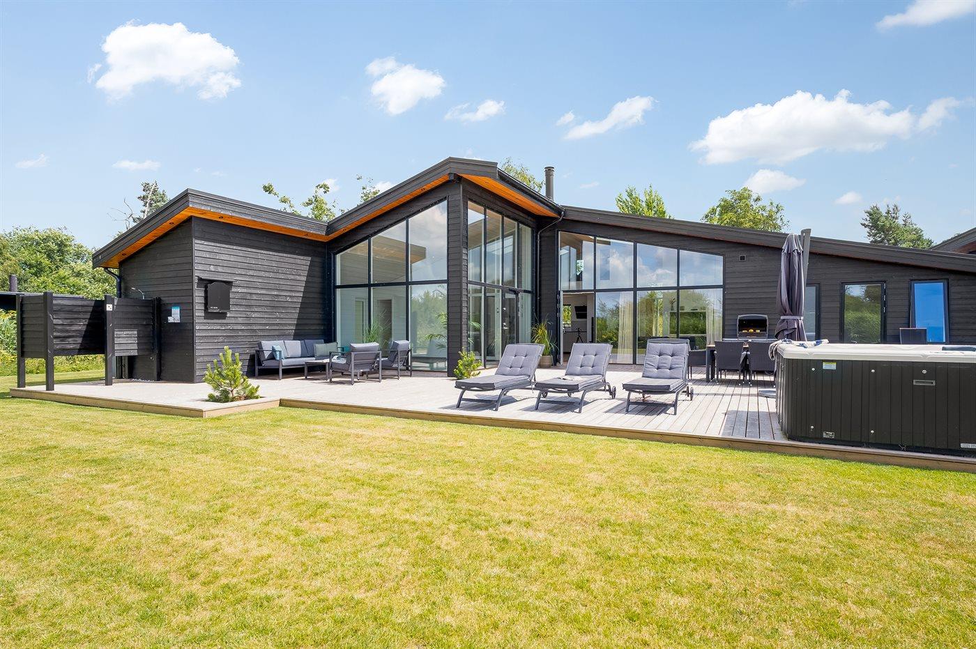 Fritidsbostaden ligger på en 940 m² stor anlagd trädgård. Avstånd till hav är 900 m. Närmeste affär ligger på ett avstånd av 400 m. Det finns en golfbana på ett avstånd av 2000 m. Till fritidsbostaden hör terrass. Dessutom finns det övertäckt terrass. Fotbollsmål. Avstånd till en lekplats er 1000 m. Utomhus sauna. Utomhus dusch. Det finns grill til förfogande. Det finns carport till förfogande. Det finns uttag för att ladda elbil vid huset. CEE kontakt. Med 11 kW laddningseffekt. P-plats på tomten.