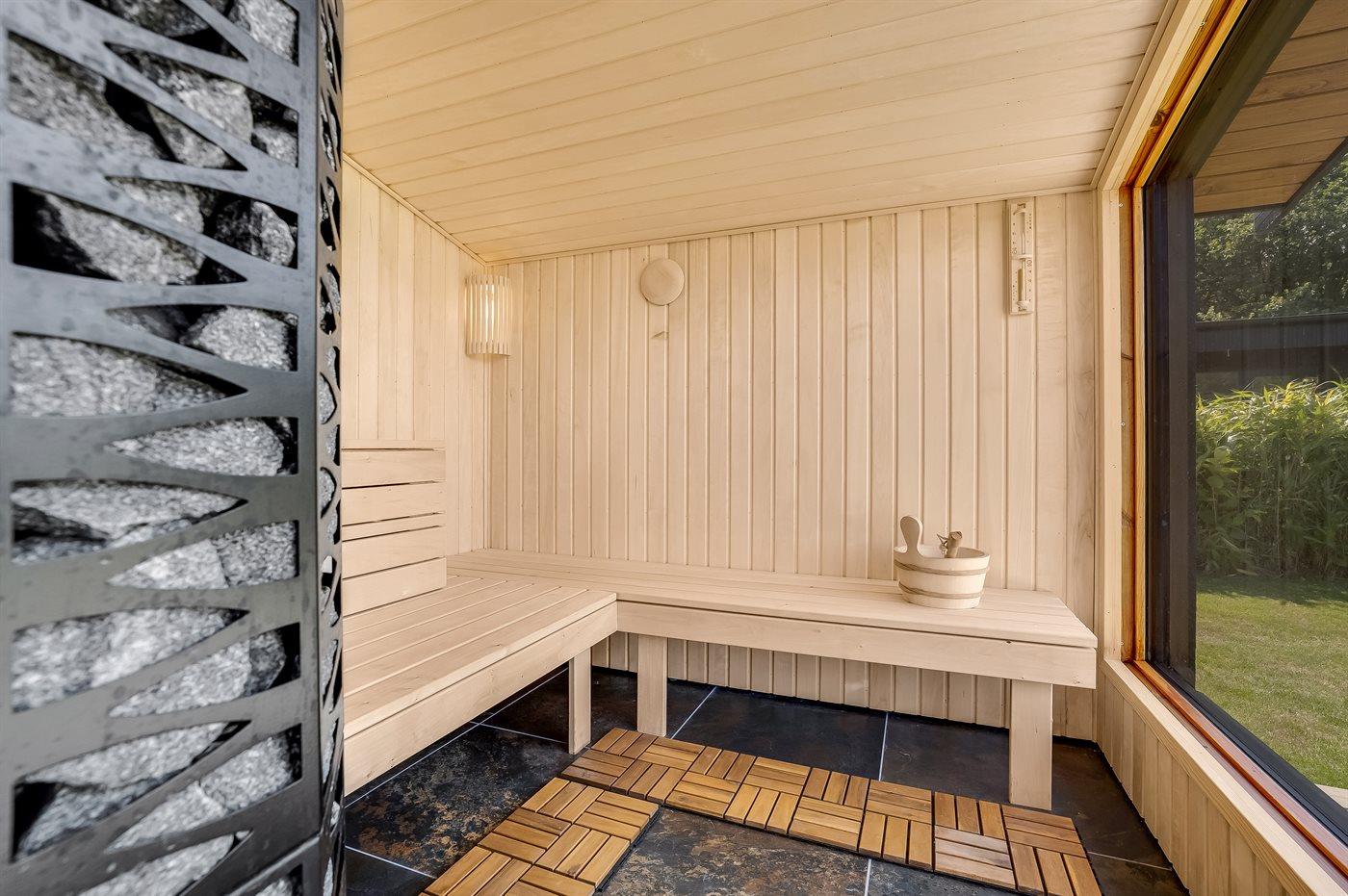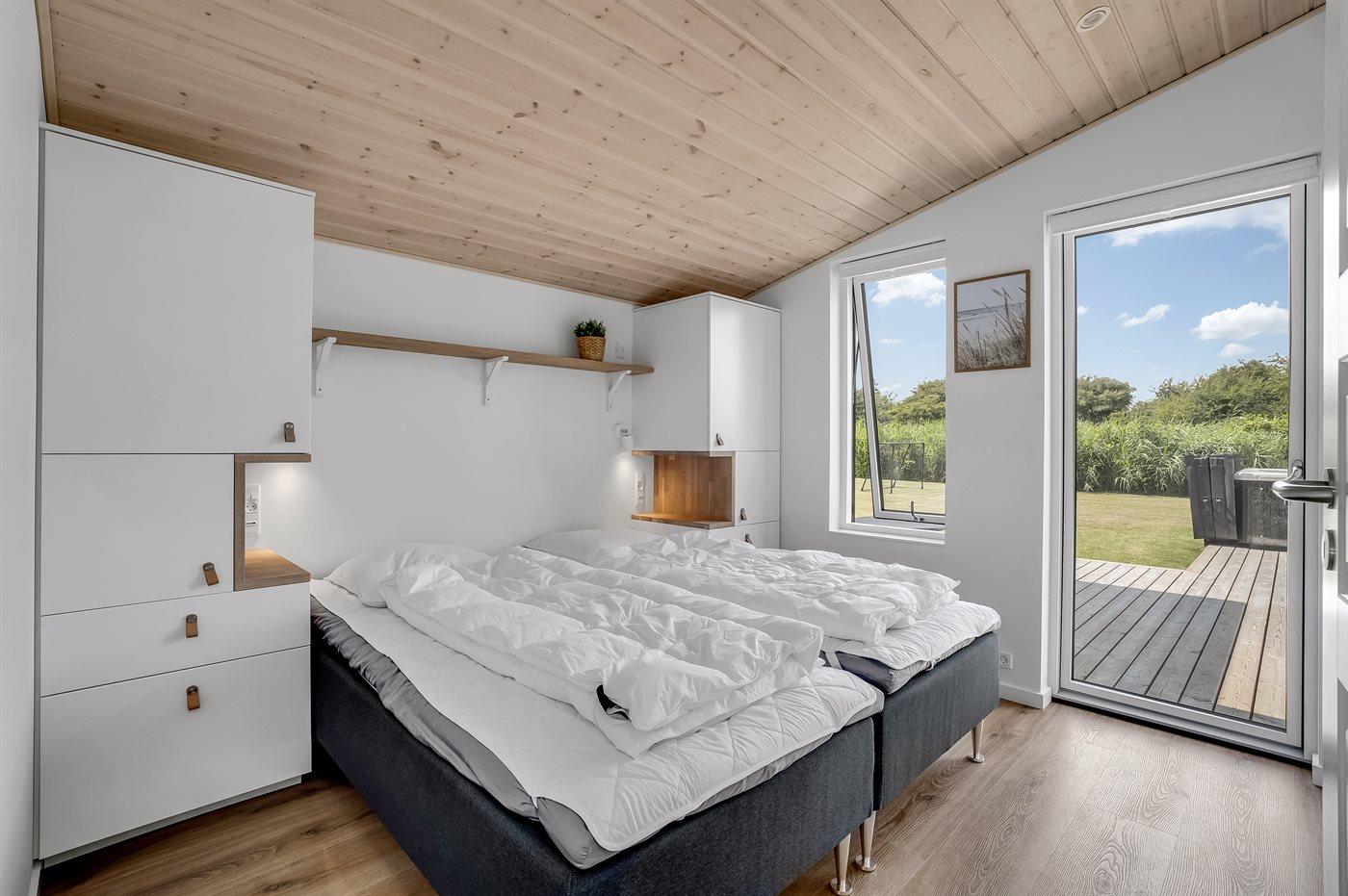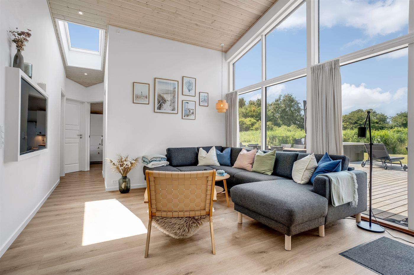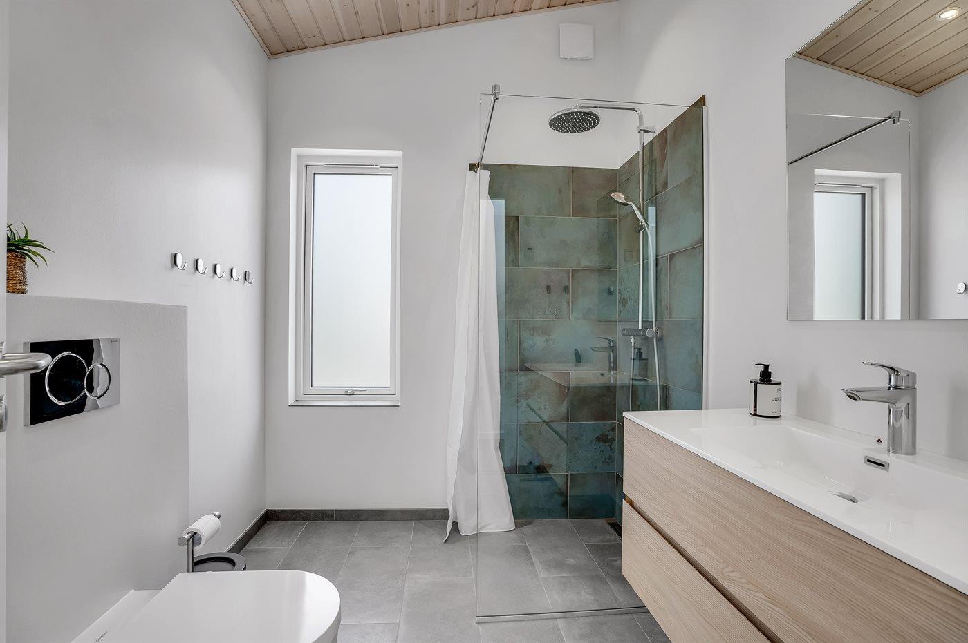 Fritidsbostaden ligger på en 940 m² stor anlagd trädgård. Avstånd till hav är 900 m. Närmeste affär ligger på ett avstånd av 400 m. Det finns en golfbana på ett avstånd av 2000 m. Till fritidsbostaden hör terrass. Dessutom finns det övertäckt terrass. Fotbollsmål. Avstånd till en lekplats er 1000 m. Utomhus sauna. Utomhus dusch. Det finns grill til förfogande. Det finns carport till förfogande. Det finns uttag för att ladda elbil vid huset. CEE kontakt. Med 11 kW laddningseffekt. P-plats på tomten.