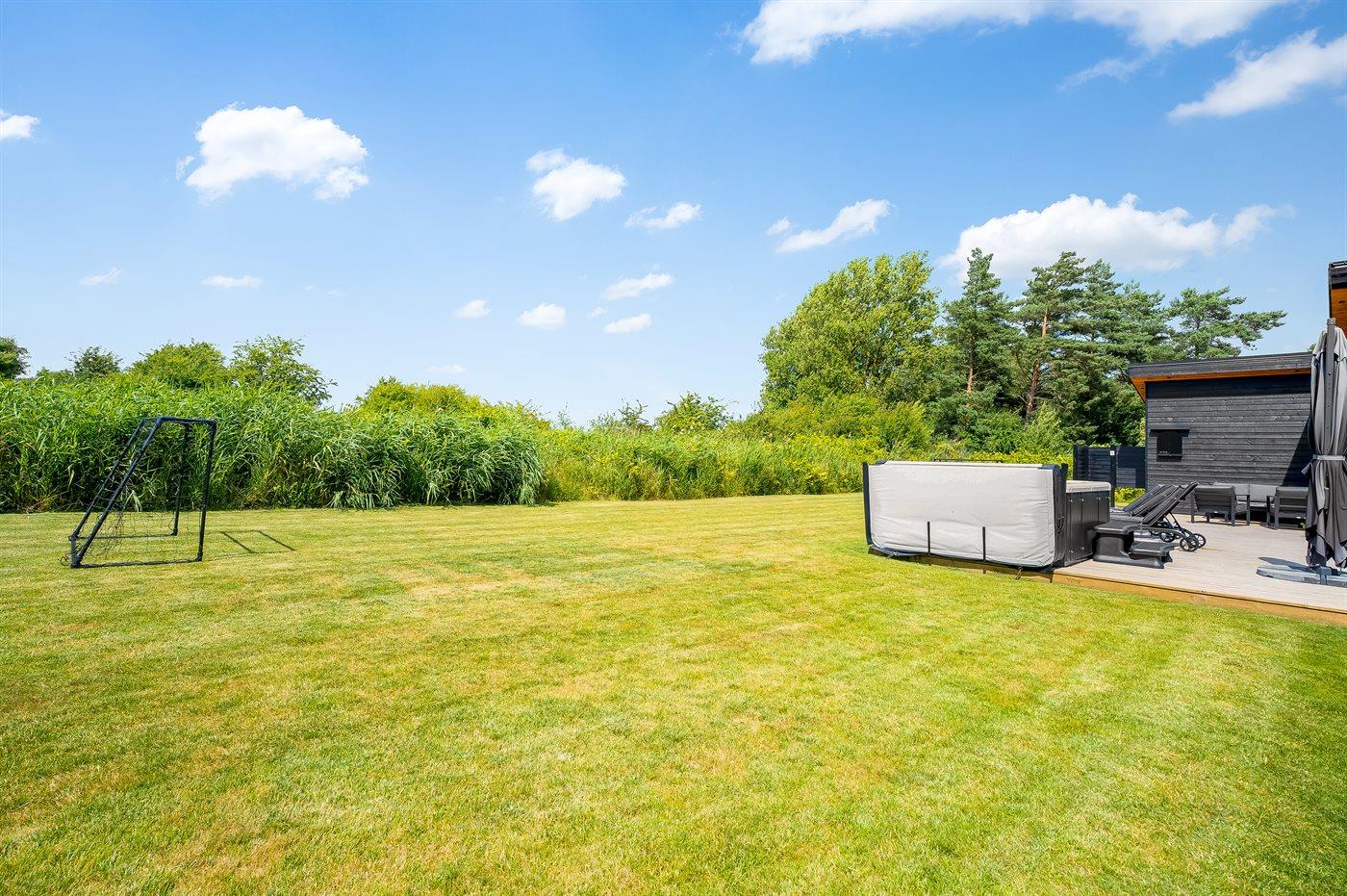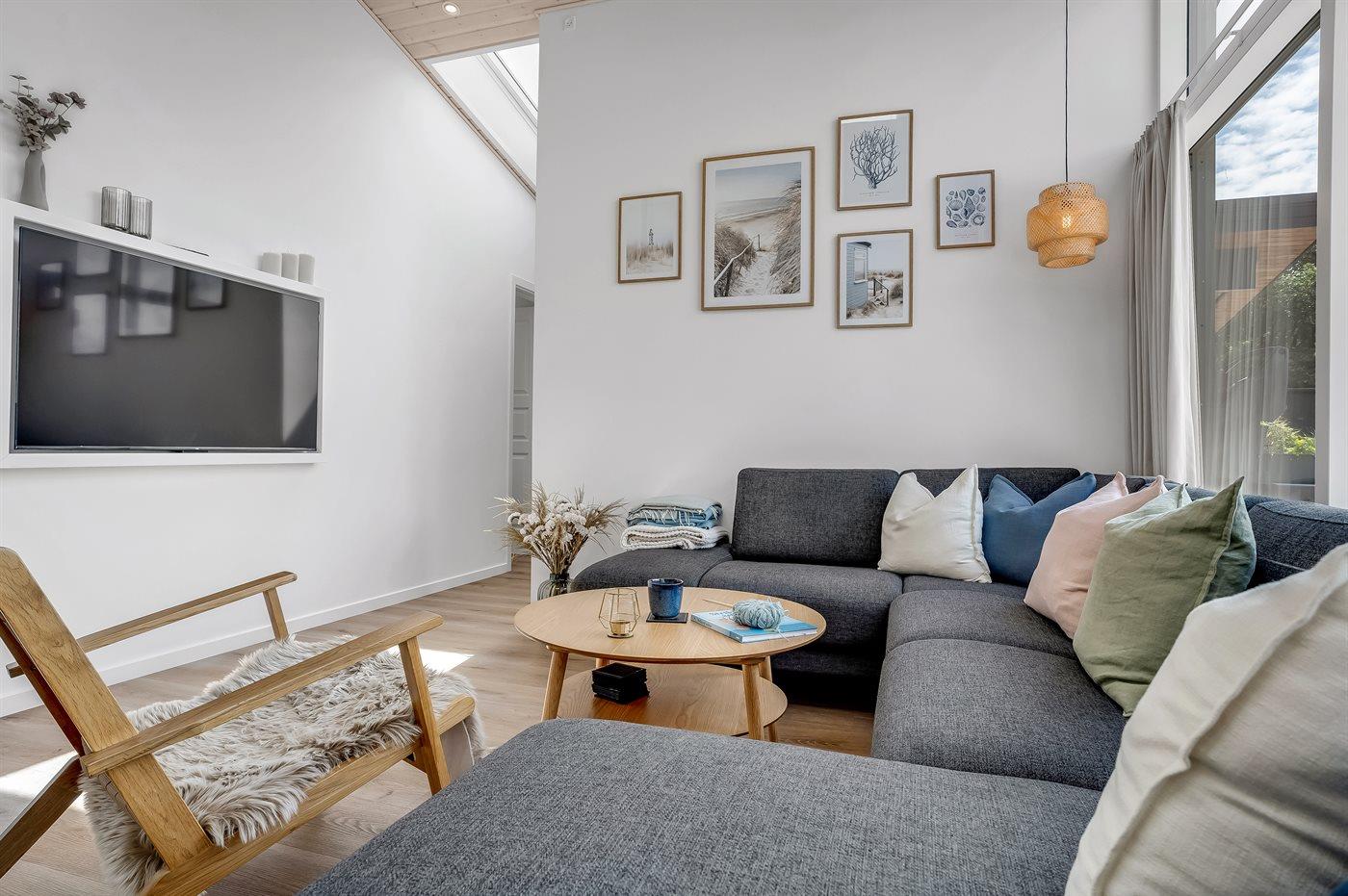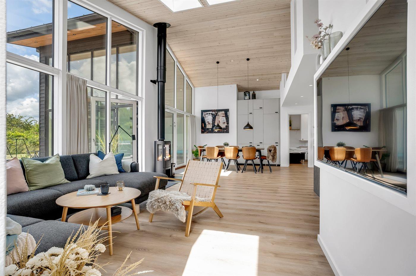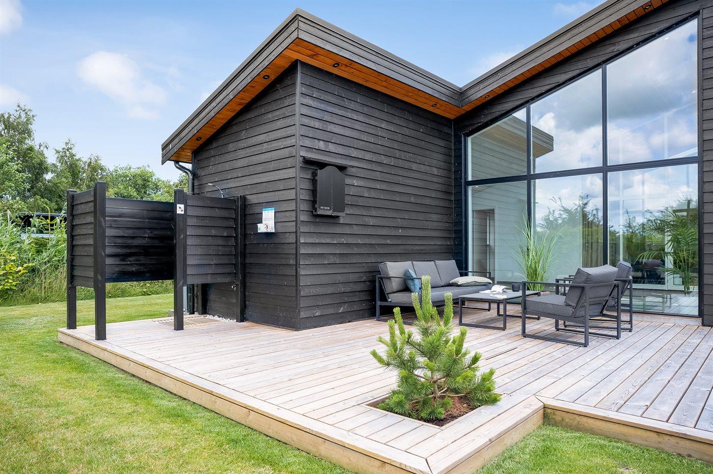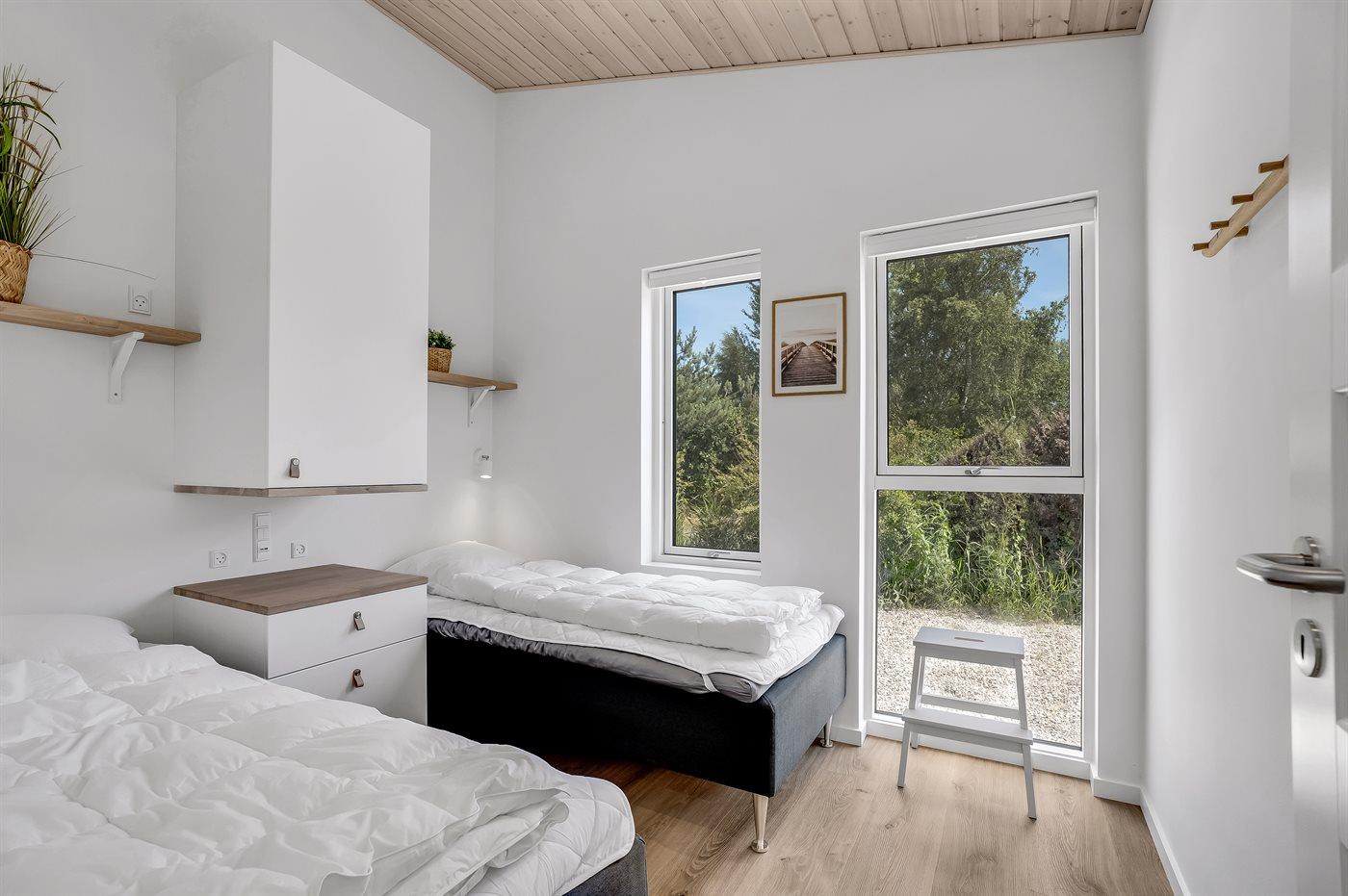 Fritidsbostaden ligger på en 940 m² stor anlagd trädgård. Avstånd till hav är 900 m. Närmeste affär ligger på ett avstånd av 400 m. Det finns en golfbana på ett avstånd av 2000 m. Till fritidsbostaden hör terrass. Dessutom finns det övertäckt terrass. Fotbollsmål. Avstånd till en lekplats er 1000 m. Utomhus sauna. Utomhus dusch. Det finns grill til förfogande. Det finns carport till förfogande. Det finns uttag för att ladda elbil vid huset. CEE kontakt. Med 11 kW laddningseffekt. P-plats på tomten.