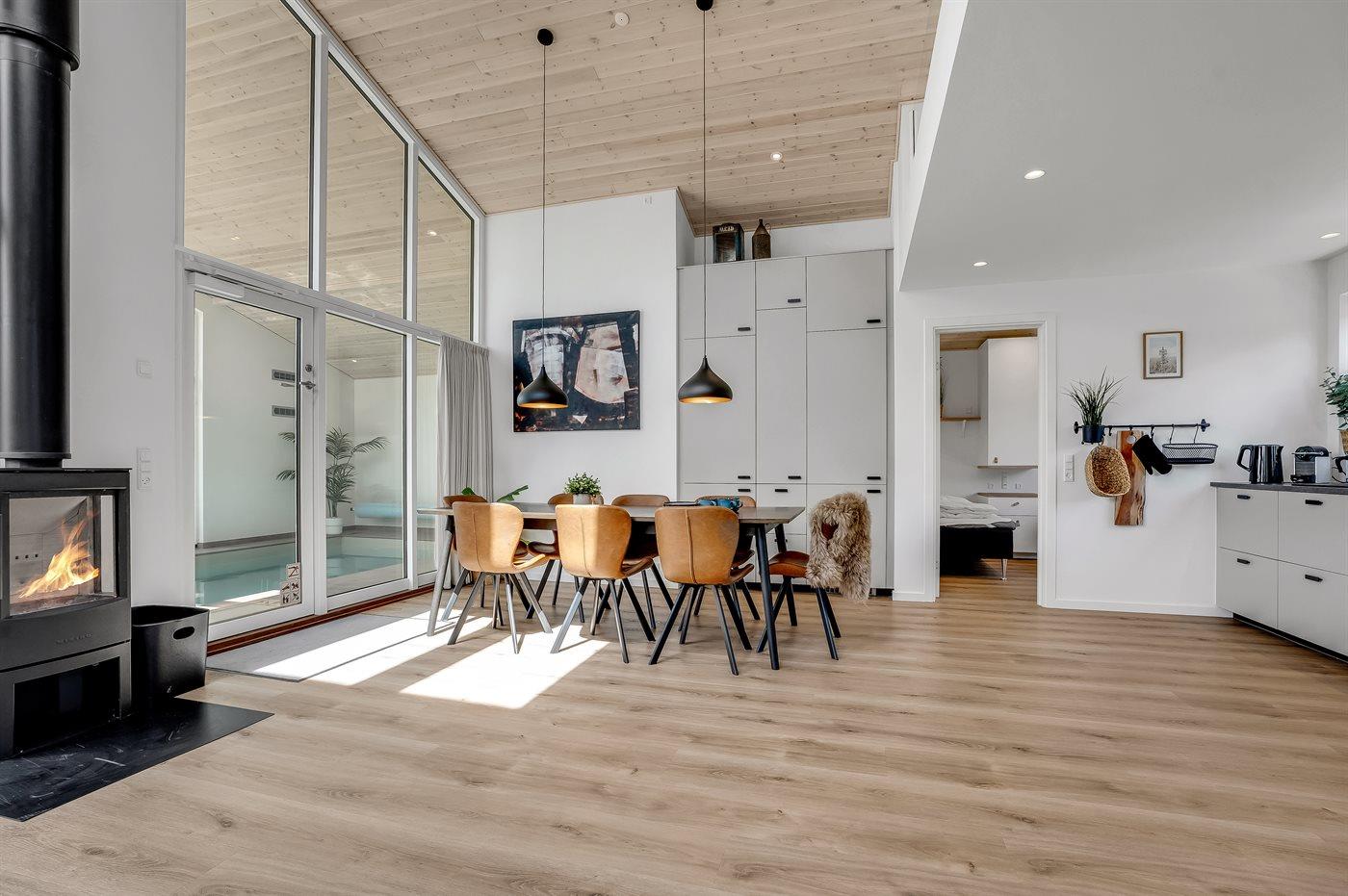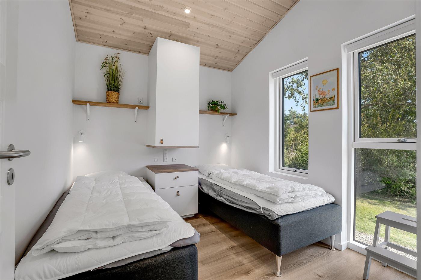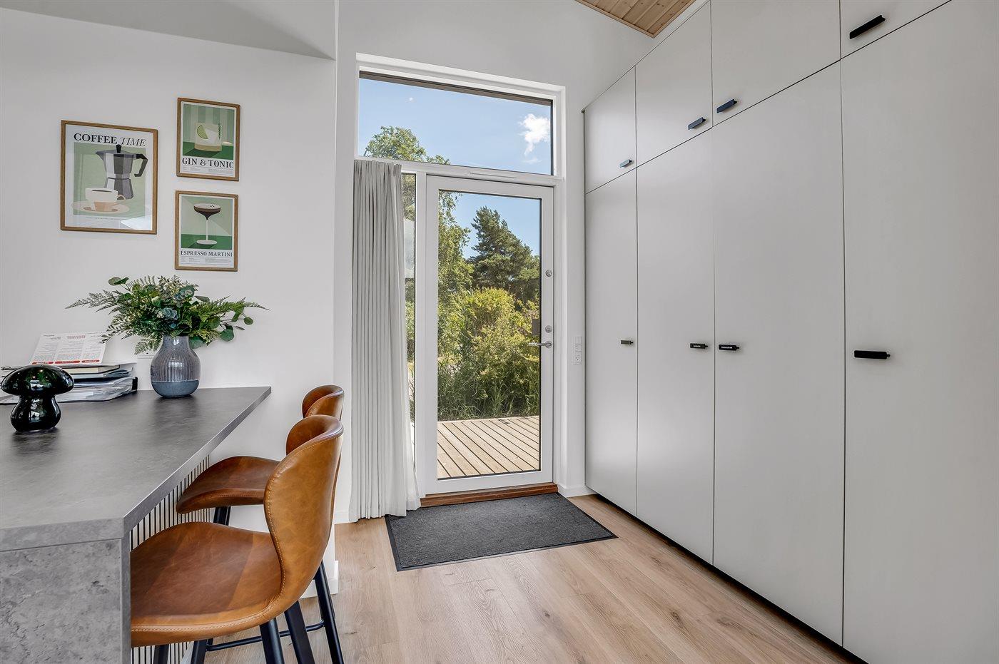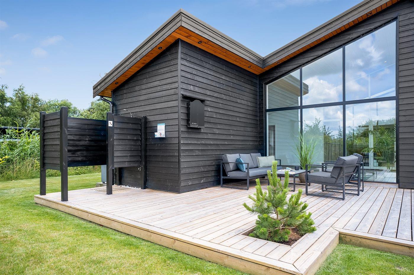 Fritidsbostaden ligger på en 940 m² stor anlagd trädgård. Avstånd till hav är 900 m. Närmeste affär ligger på ett avstånd av 400 m. Det finns en golfbana på ett avstånd av 2000 m. Till fritidsbostaden hör terrass. Dessutom finns det övertäckt terrass. Fotbollsmål. Avstånd till en lekplats er 1000 m. Utomhus sauna. Utomhus dusch. Det finns grill til förfogande. Det finns carport till förfogande. Det finns uttag för att ladda elbil vid huset. CEE kontakt. Med 11 kW laddningseffekt. P-plats på tomten.