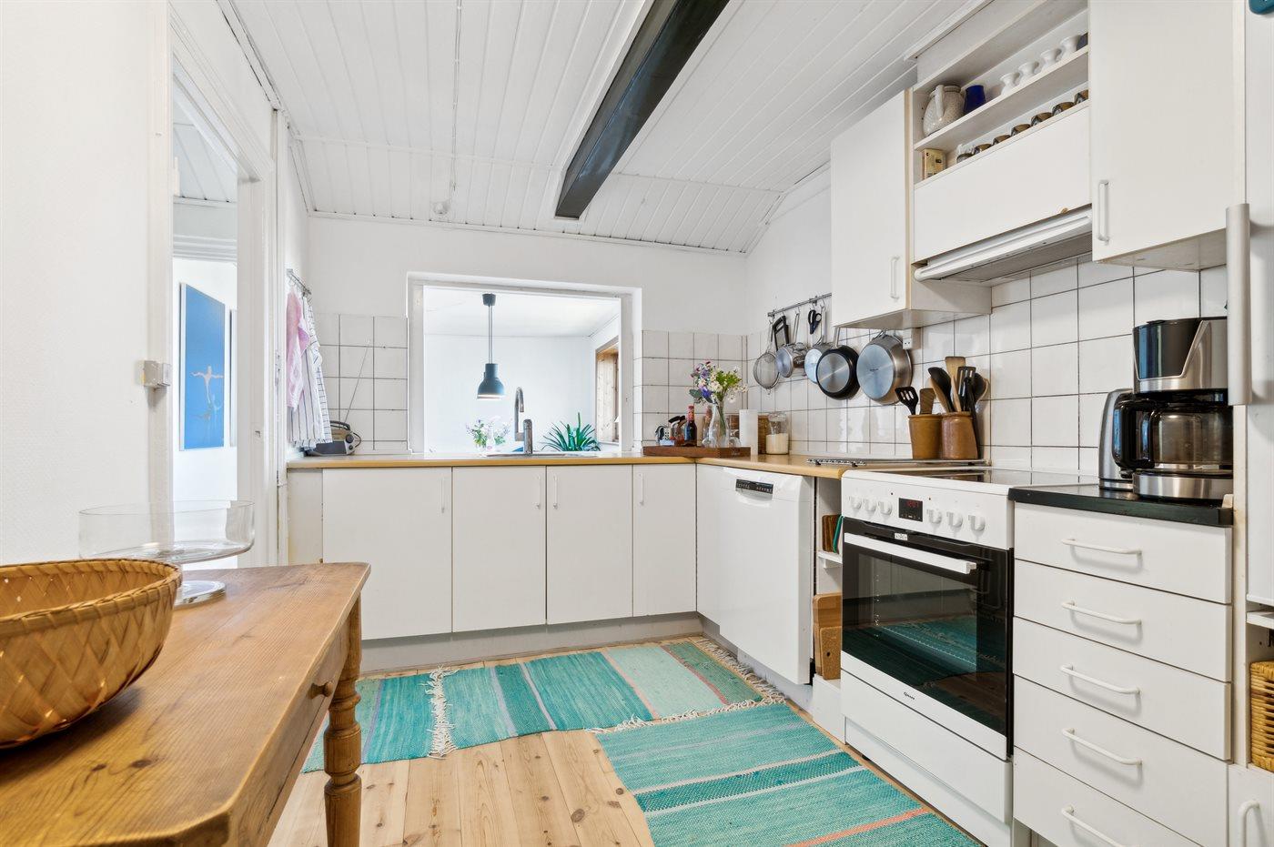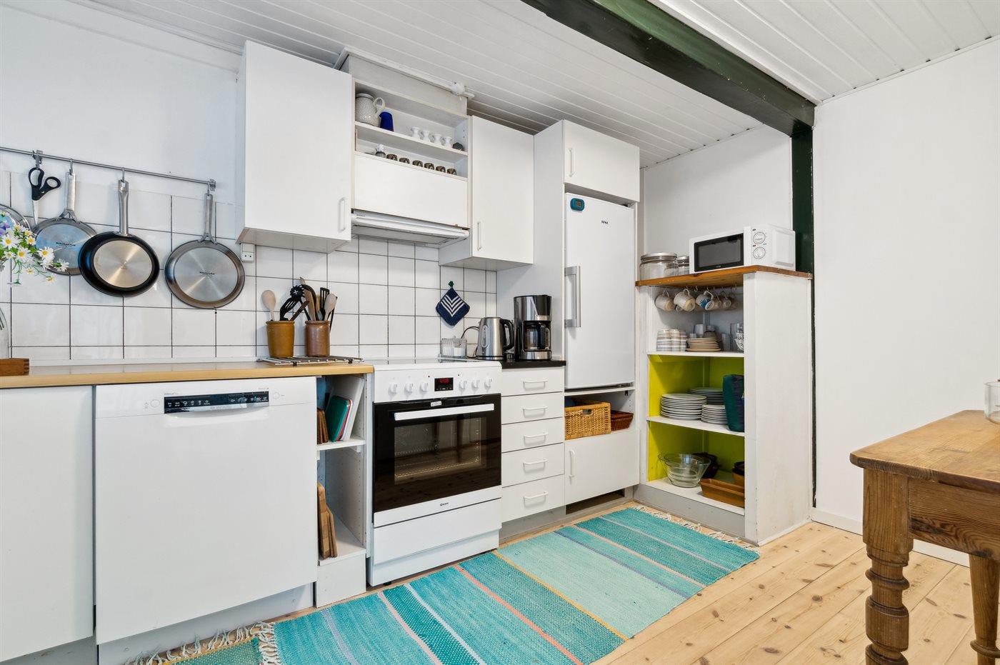 Köket är utrustad med 1 kylskåp Det finns 4 el. värmeplattor, varmluftsugn, mikrovågsugn samt diskmaskin.