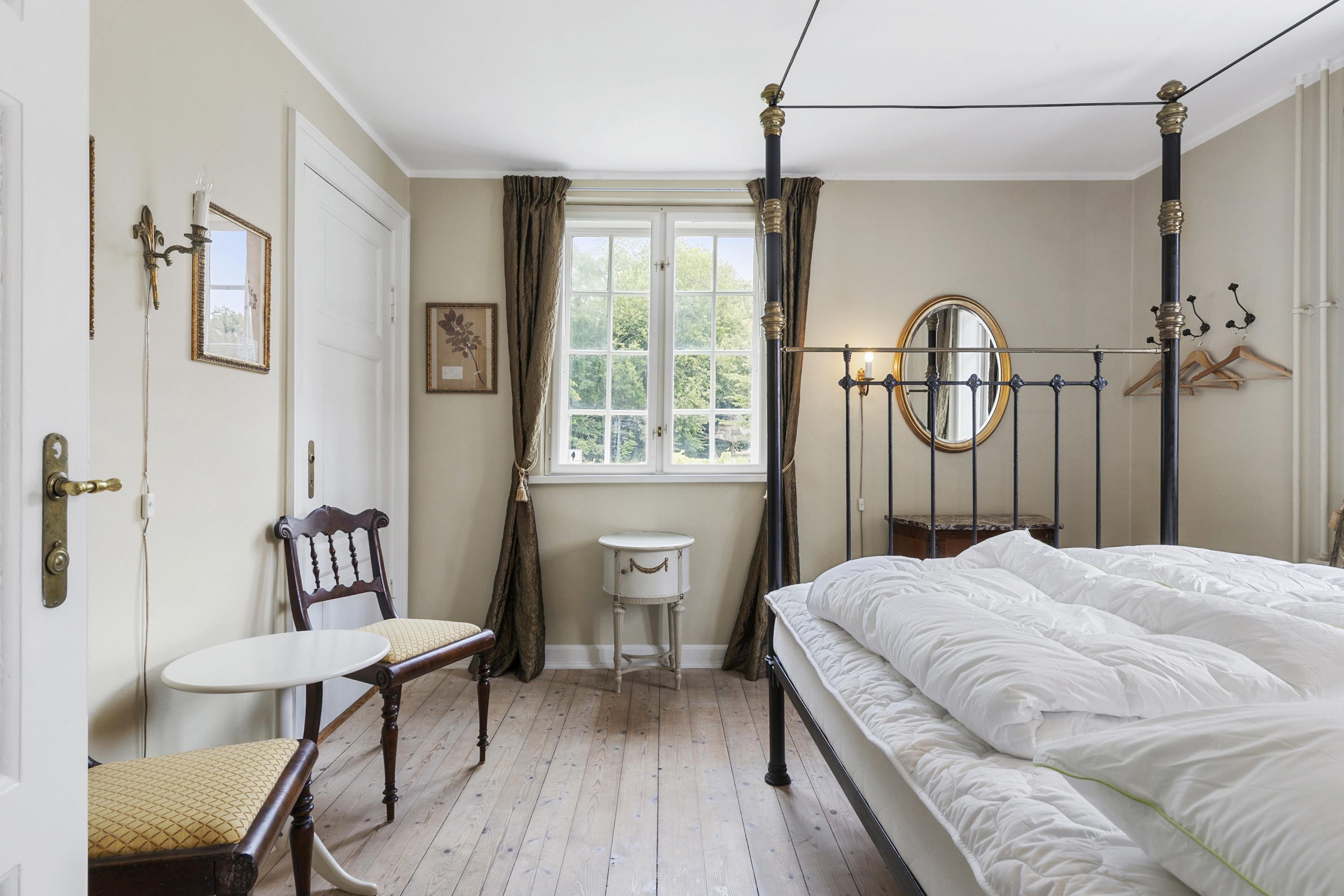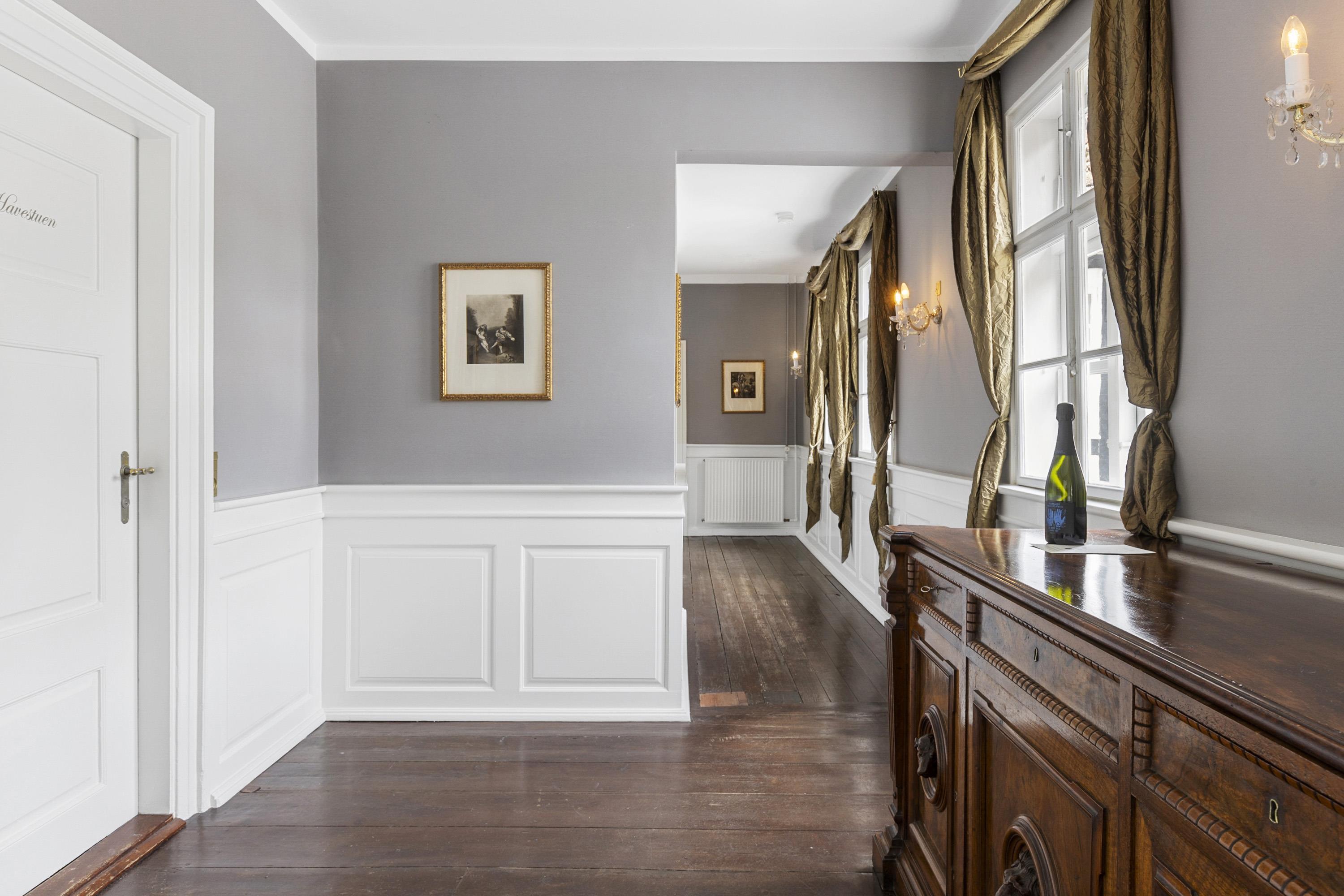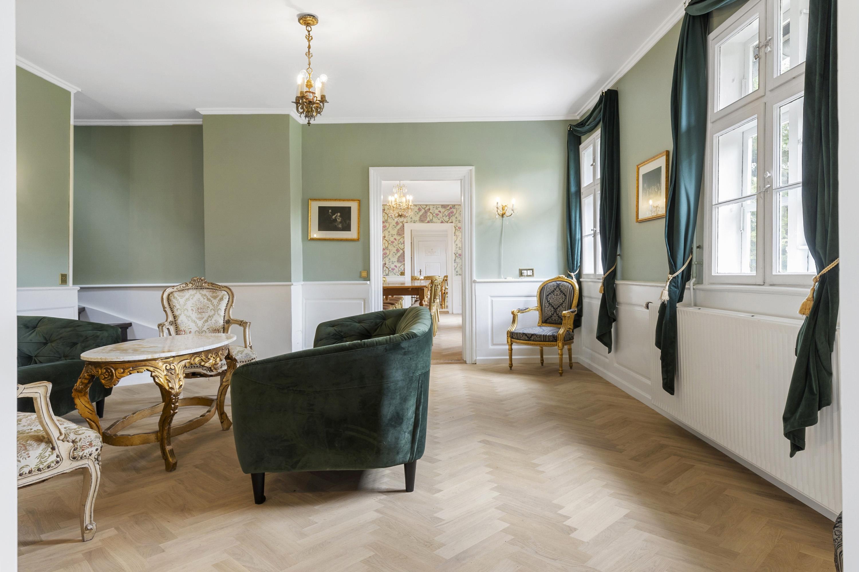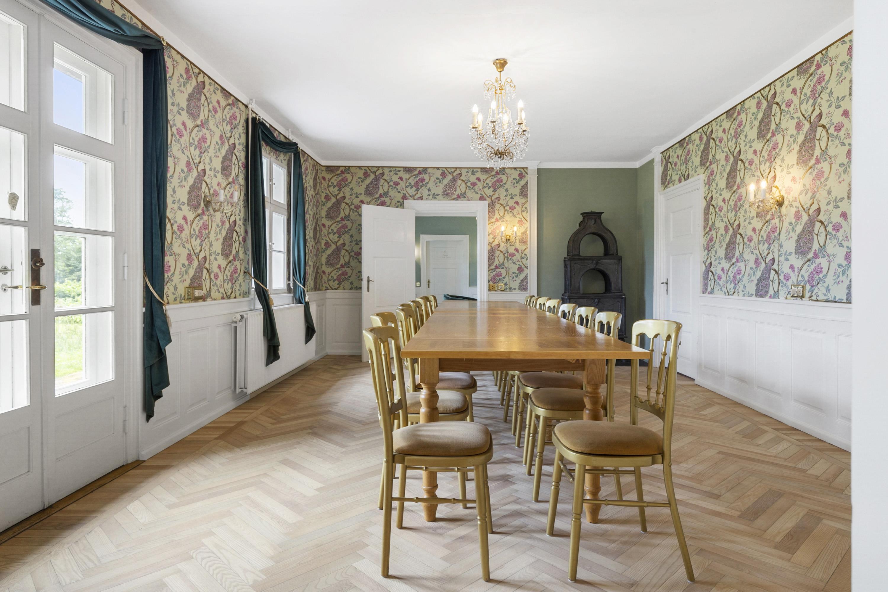 Once you have taken in the surrounding nature and the beautiful buildings, the experience continues inside the manor. Here awaits an interior that could be described as a consistent and complete ‘manor look’. Furniture, colours, and décor offer elegant solutions worthy of the beautiful building and its long history. This applies both to common areas and individual rooms. Everywhere, you sense the connectivity in design and, not least, respect for the manor. From the checkered floor in the kitchen to the rustic plank floors and furniture with Rococo and Empire touches. The details are many, beautiful, and inspiring, whether you are hosting a party or discussing business.