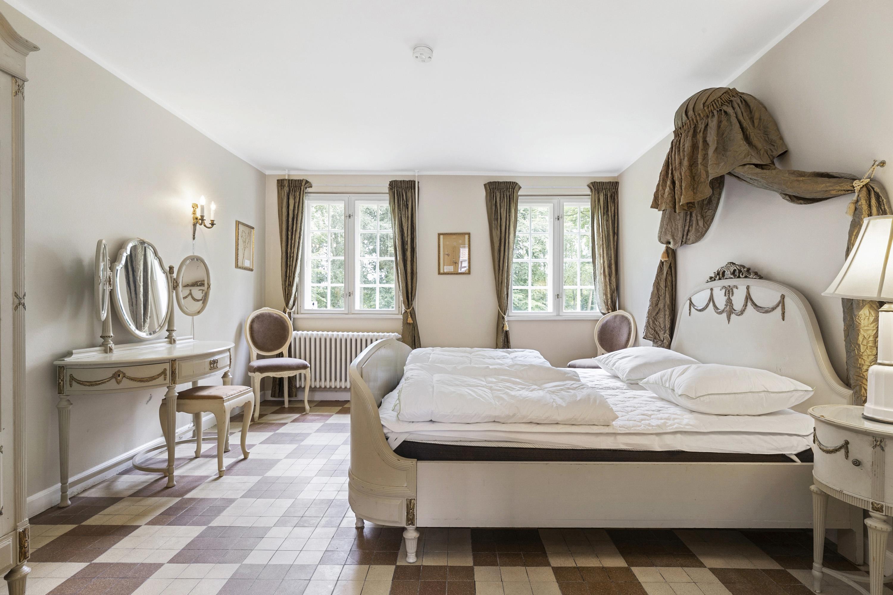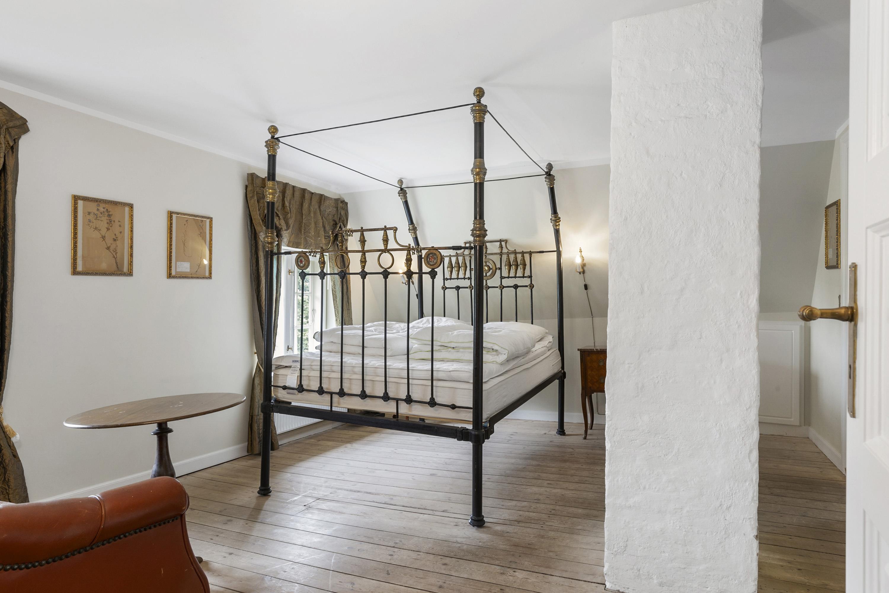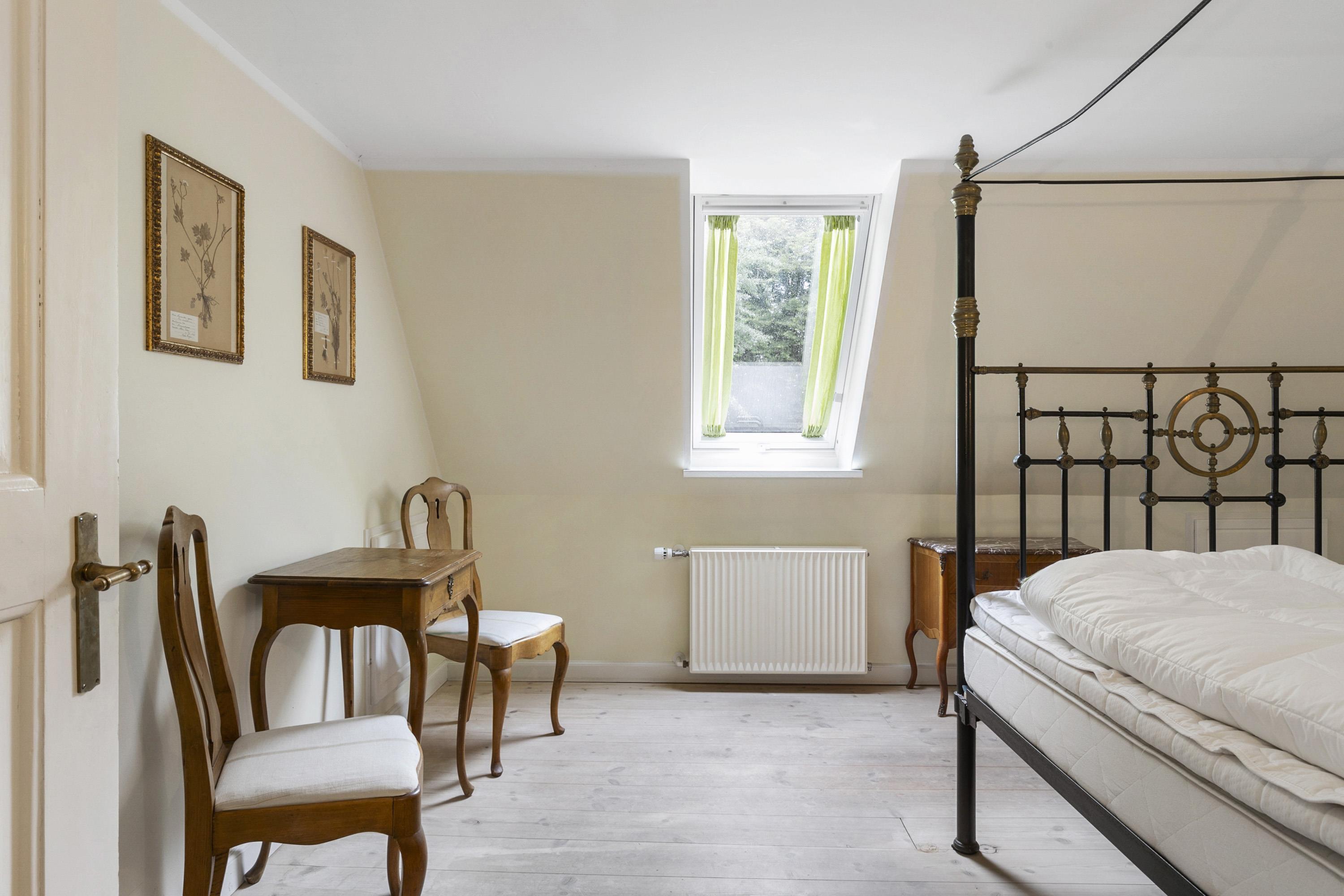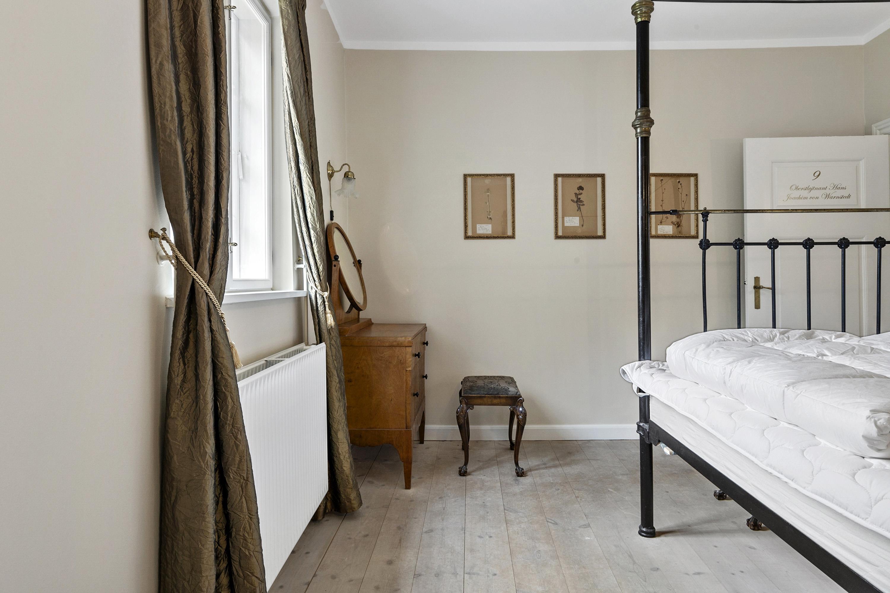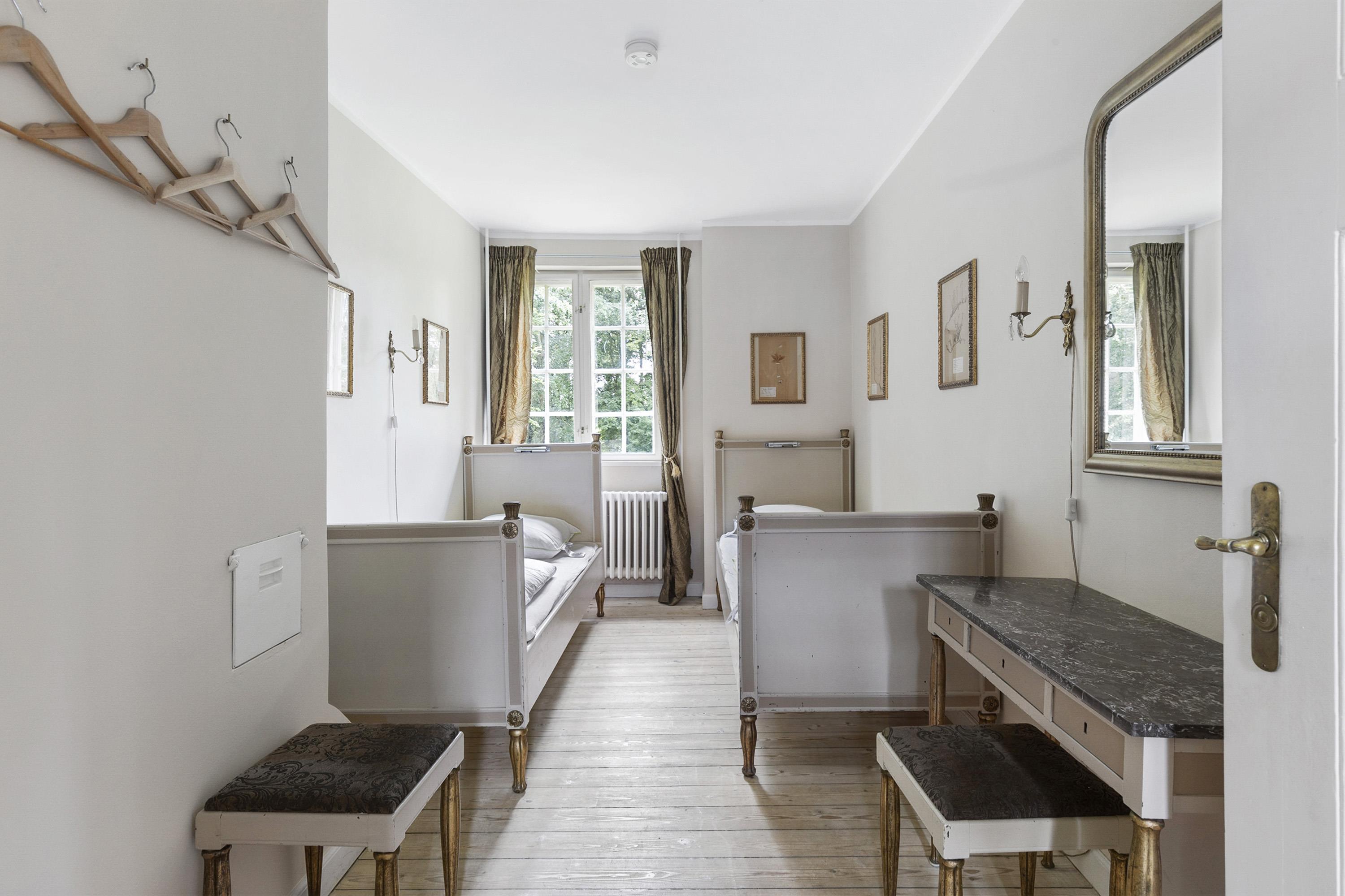 Once you have taken in the surrounding nature and the beautiful buildings, the experience continues inside the manor. Here awaits an interior that could be described as a consistent and complete ‘manor look’. Furniture, colours, and décor offer elegant solutions worthy of the beautiful building and its long history. This applies both to common areas and individual rooms. Everywhere, you sense the connectivity in design and, not least, respect for the manor. From the checkered floor in the kitchen to the rustic plank floors and furniture with Rococo and Empire touches. The details are many, beautiful, and inspiring, whether you are hosting a party or discussing business.