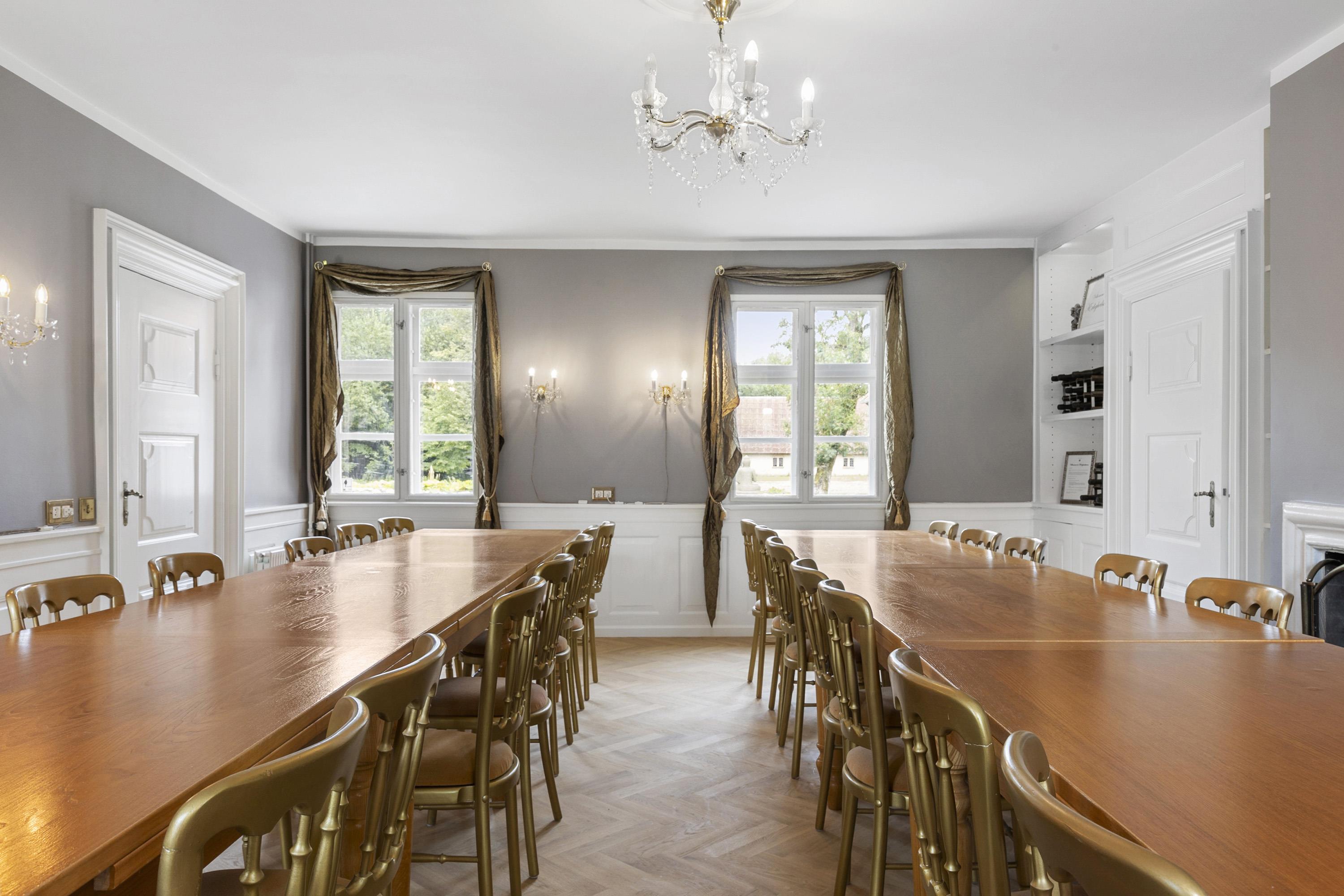 If you want to explore all of Manor Jerstrup, then 1000 m2 is what is waiting for you. In other words, there is plenty of space to host the perfect event or a successful family vacation. The extensive space is divided into 18 rooms, which are exclusively and individually decorated in the aforementioned manor style. In 17 of the rooms, you have your own bathroom. There is also the possibility to add two extra beds if needed. You will find rooms both on the ground floor and on the first floor. When you and your group are not in your rooms, there are both spacious and beautiful common areas. For example, the extremely cosy conservatory, which can accommodate 32 people. This is a flexible room that can be used in various ways. The conservatory can be integrated into the dining room or used for a buffet setup, a coffee room, a conference room, or similar. Both these rooms are also beautifully furnished, and from the conservatory, there is access to the large natural garden, where you will find a nice spot for breaks, good conversations, and small, informal negotiations. On the ground floor, there is also a large modern country kitchen with all the necessary facilities such as three refrigerators and an industrial dishwasher. Additionally, there are two living rooms, which can be used for anything from meetings to cosy gatherings.