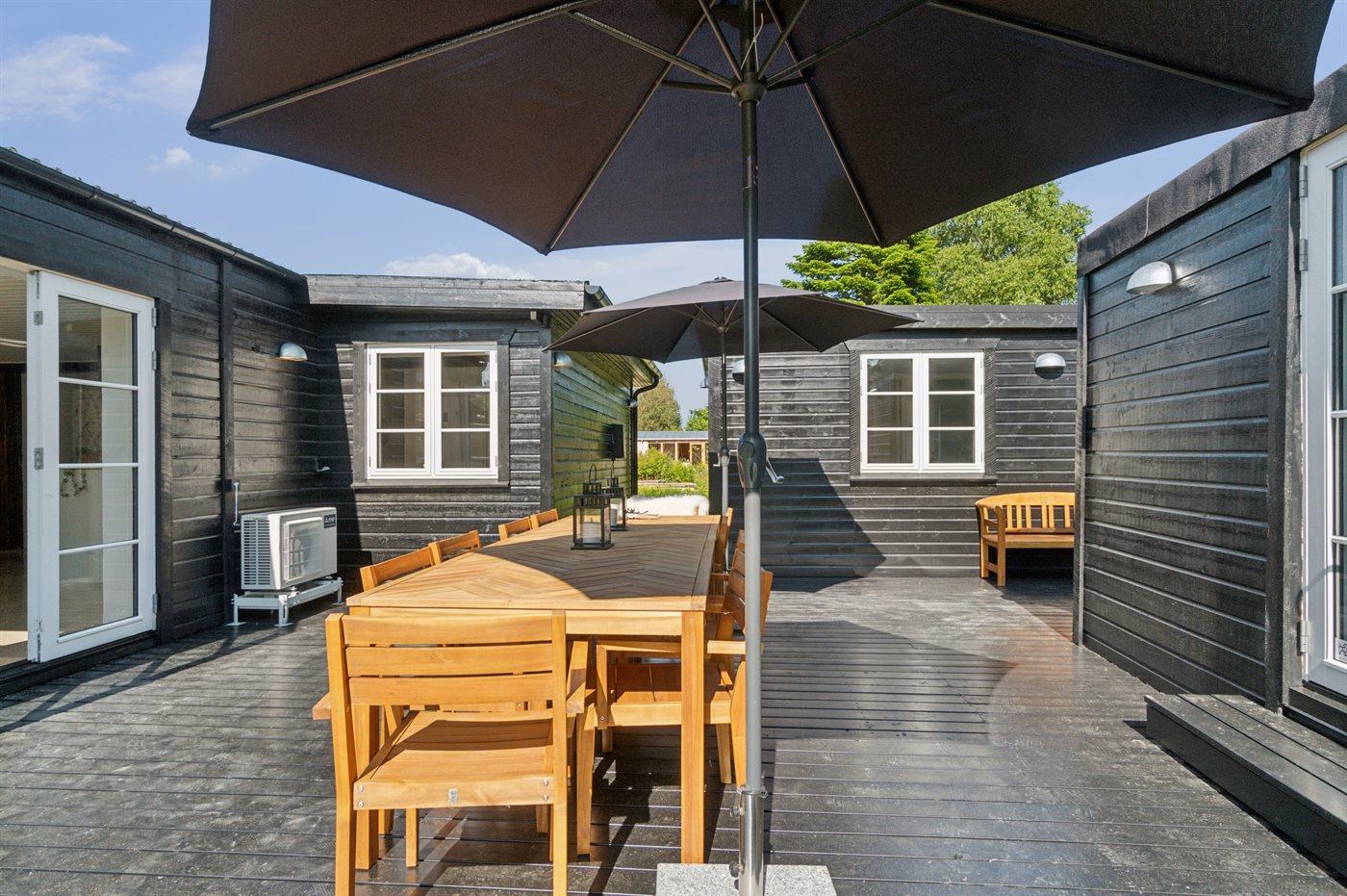 Fritidsbostaden ligger på en 1256 m² stor anlagd trädgård. Avstånd till hav är 2500 m. Närmeste affär ligger på ett avstånd av 2600 m. Det finns en golfbana på ett avstånd av 1700 m. Till fritidsbostaden hör 185 m² terrass. Det finns grill til förfogande. Det finns uttag för att ladda elbil vid huset. Kontakt typ 2. Med 13,8 kW laddningseffekt. P-plats på tomten.