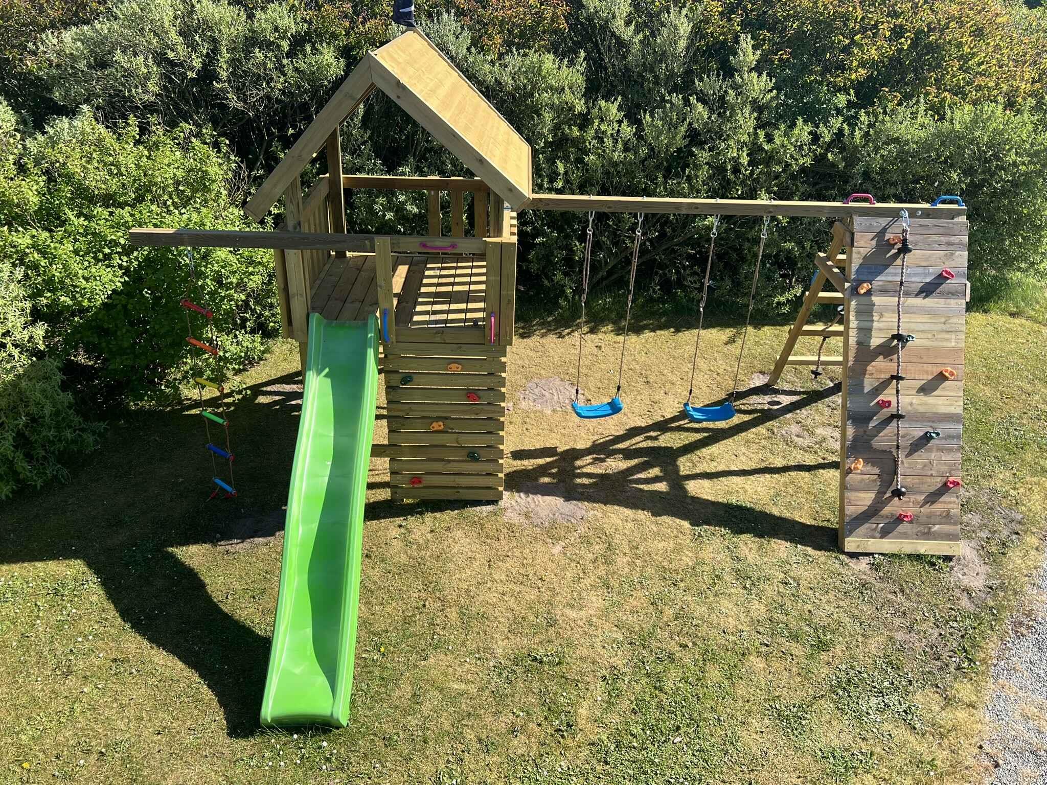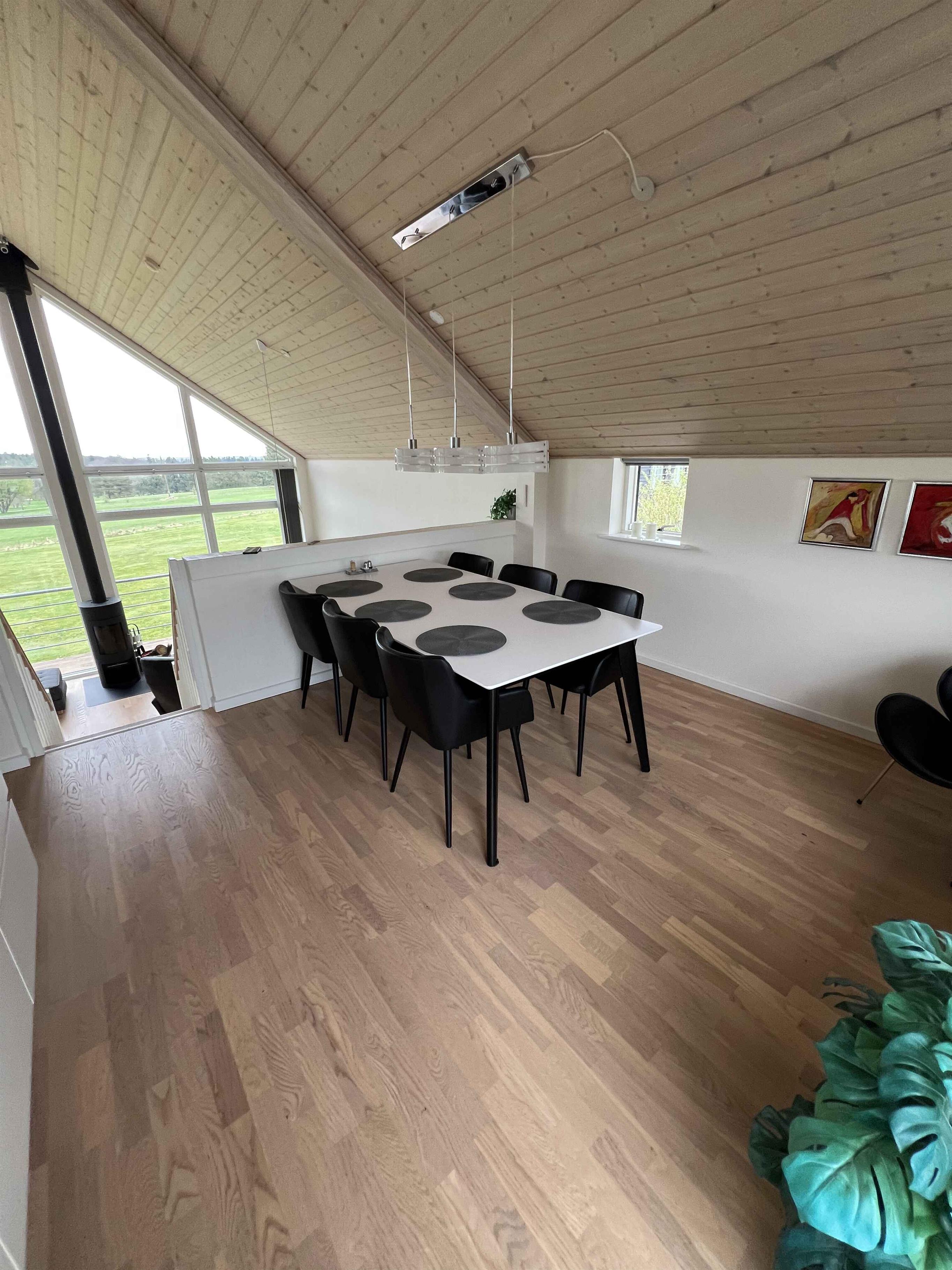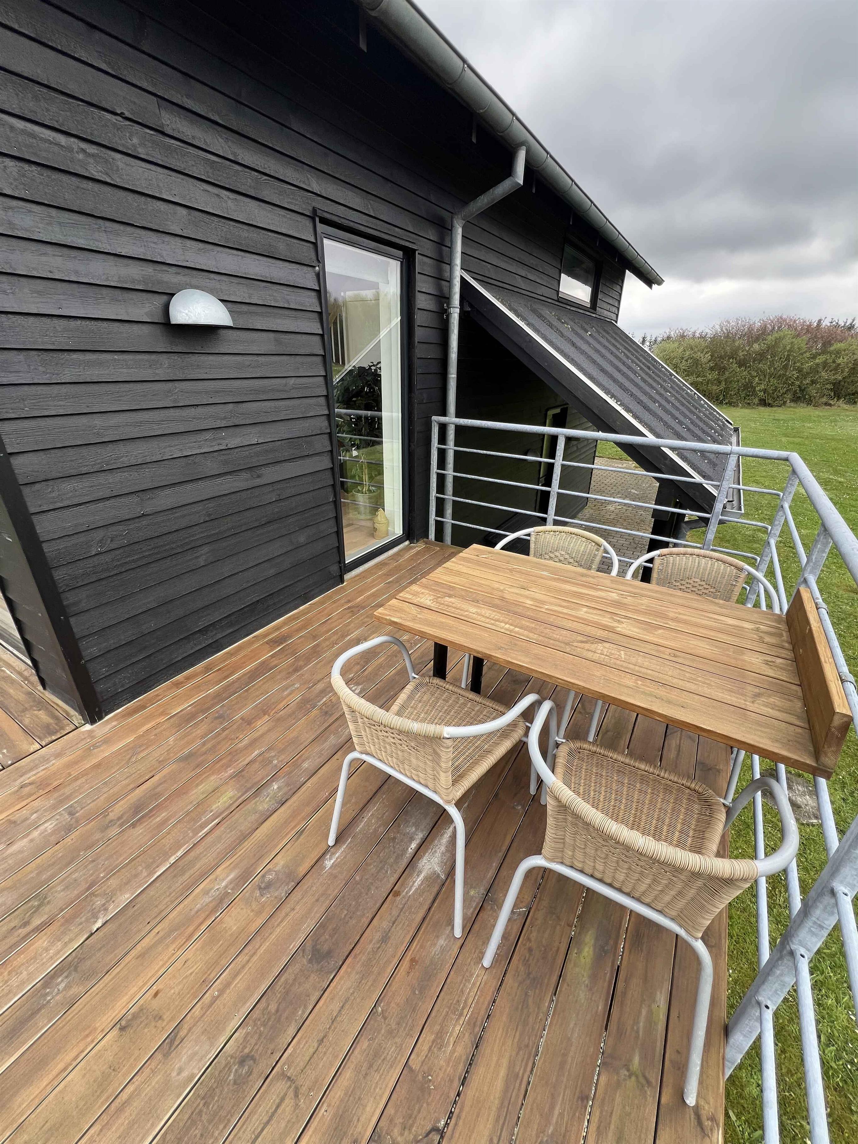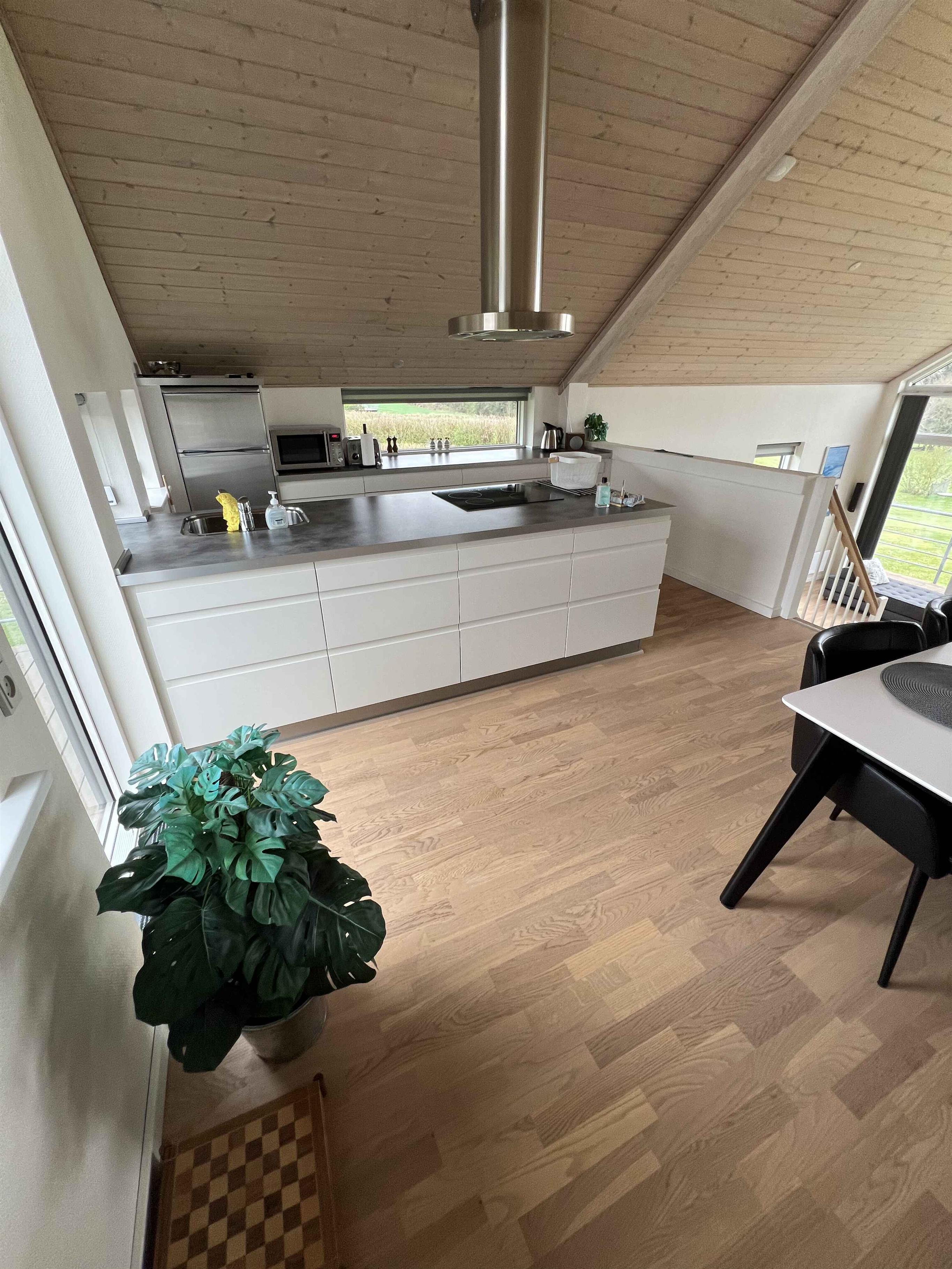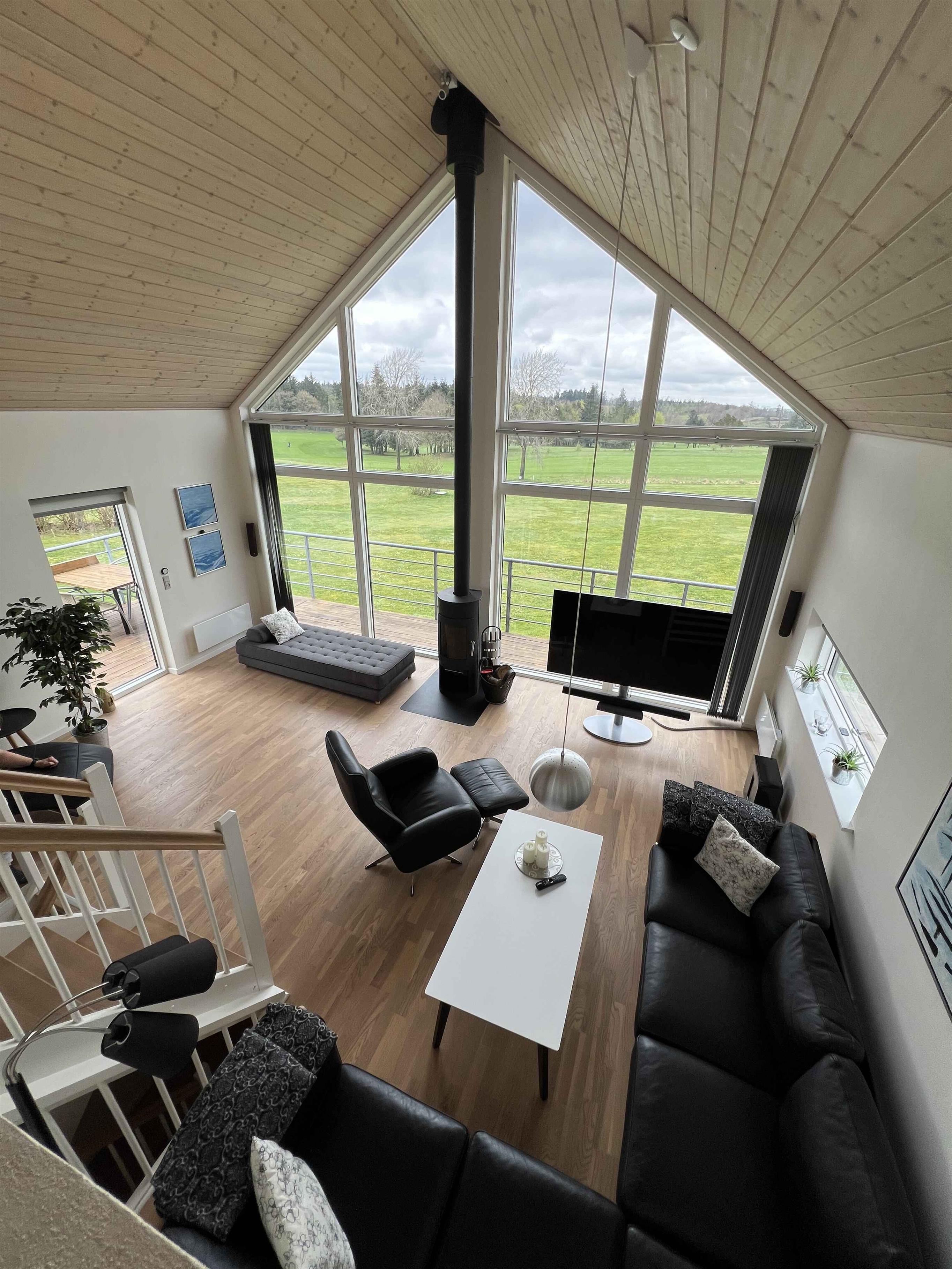 This holiday home is something special. Built on four split levels, it offers a different sense of space than the classic summer house. Here, there’s room, views, and calm – perfect for a holiday where all ages can relax and enjoy something new. The house measures 134 m² and has three bedrooms with a total of six beds. Several cozy living areas allow for both gathering and quiet corners. The layout is practical and functional – ideal for families or friends on holiday. The main living room features a wood-burning stove and connects openly with the kitchen. It’s the perfect place to spend evenings together while the fire crackles and light pours in through large windows. A heat pump and internet are available. Outside, multiple terraces unfold on different levels, letting you find sun, shelter, or shade depending on the time of day. From here, you can enjoy peaceful, open views while children play in the tower, on the swings, or with a ball. There’s a charging station for electric cars, making it easy to bring your vehicle and explore the area. The surroundings offer peaceful, scenic nature with walking trails, birdlife, and wide-open landscapes. A well-regarded golf course is nearby – ideal for a game or simply soaking in the calm atmosphere. Though the sea lies 36 km away, the nearby landscape opens up experiences beyond the beach. Go fishing, cycling, visit small towns or farm shops – or simply unplug and enjoy the quiet. This is a holiday home made for slow days. With both views and variation – inside and out – it stands out from the rest.