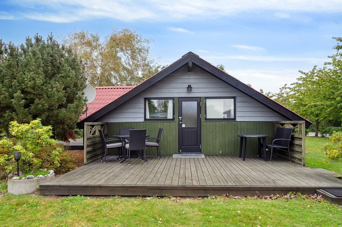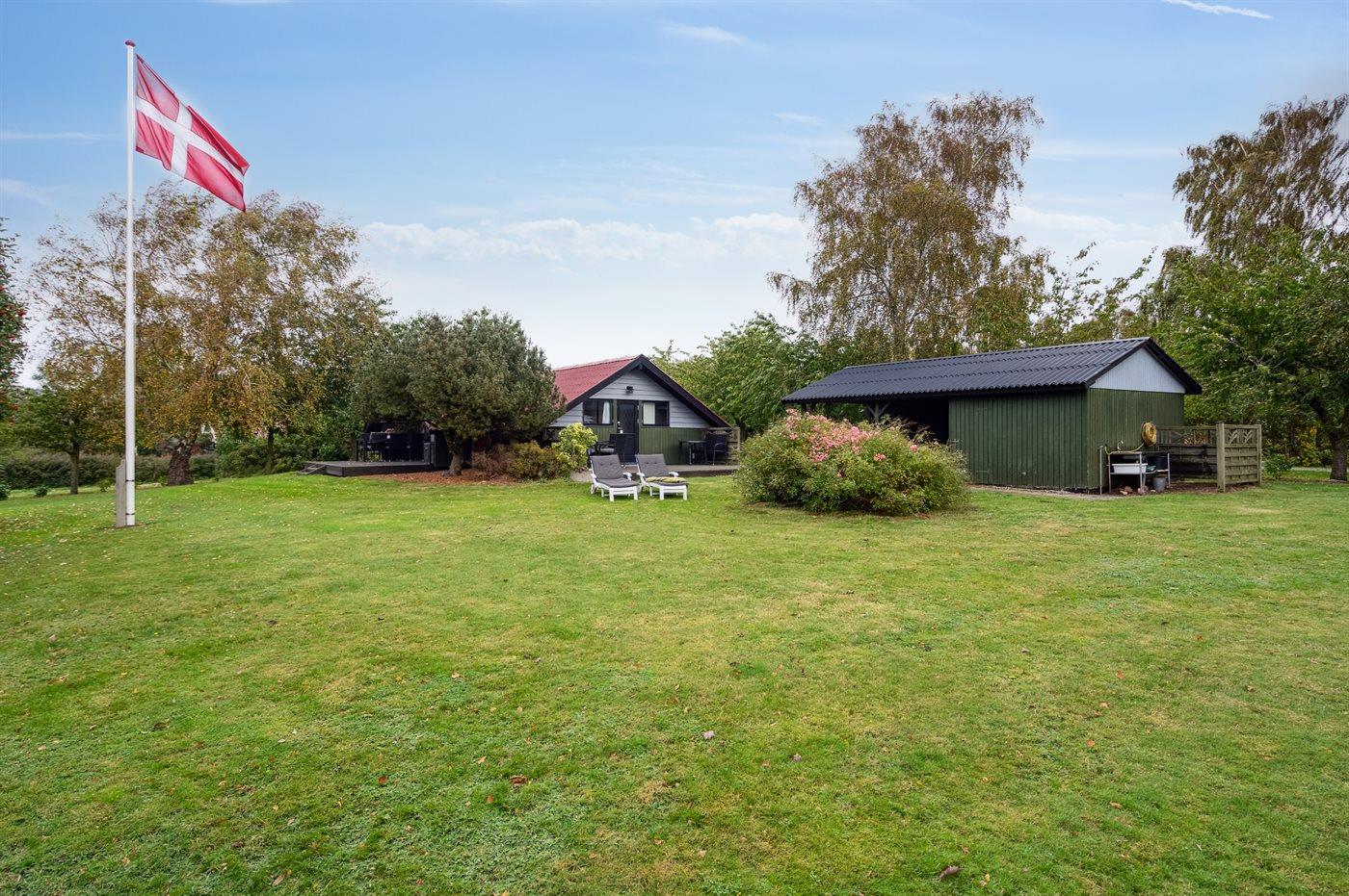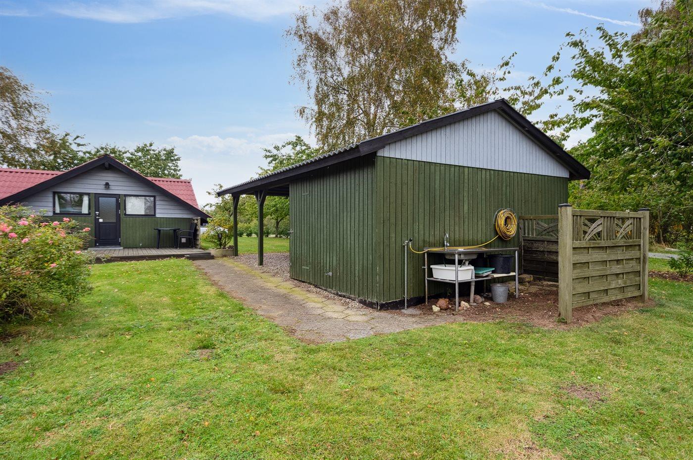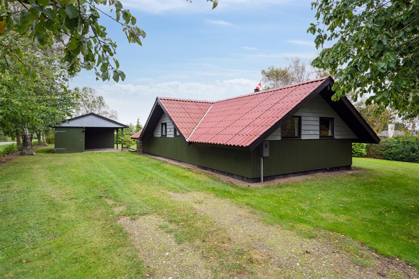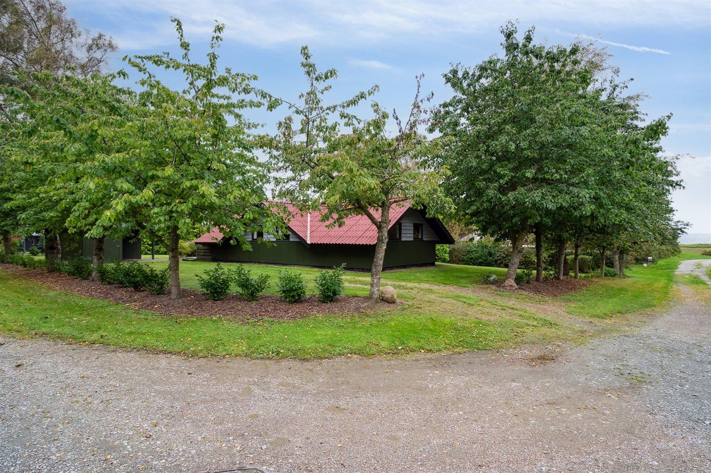 Fritidsbostaden ligger på en 1450 m² stor anlagd trädgård. Avstånd till hav är 100 m. Närmeste affär ligger på ett avstånd av 2500 m. Till fritidsbostaden hör 40 m² terrass. Dessutom finns det 10 m² övertäckt terrass. Redskapsutrymmet. Gunga. Sandlåda. Det finns carport till förfogande.