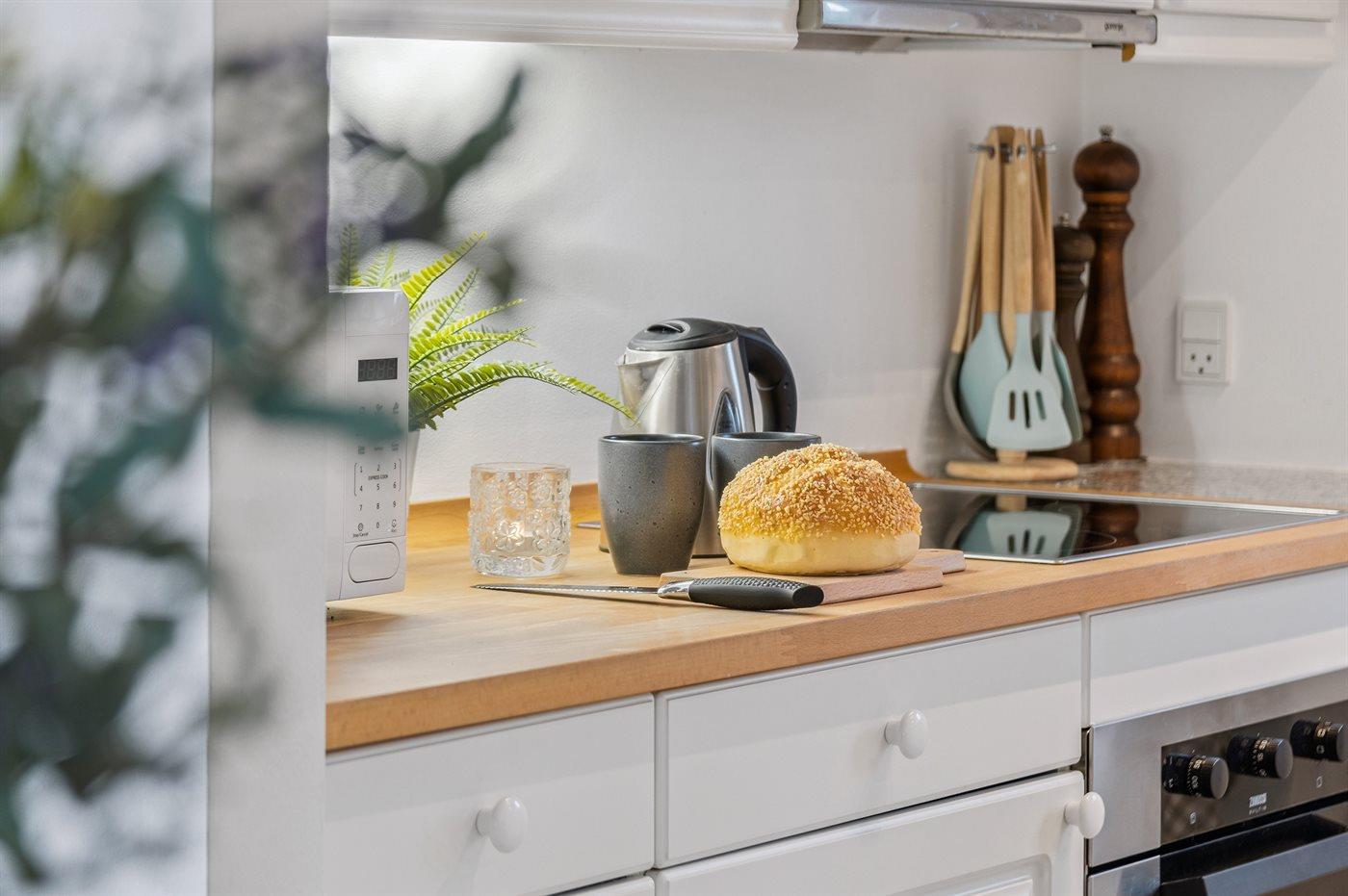 Köket är utrustad med 1 kylskåp Det finns 4 induktionshällar, varmluftsugn, mikrovågsugn samt diskmaskin.