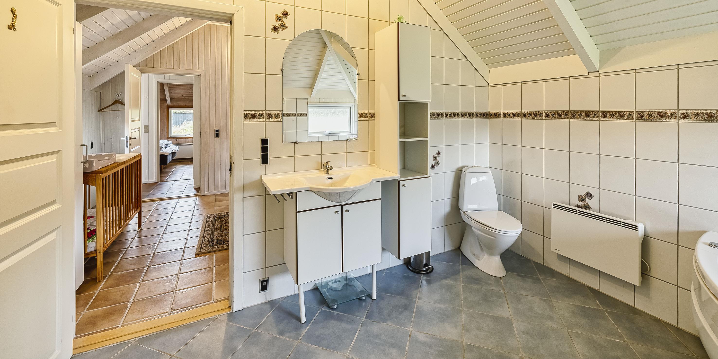 Tasteful summer house for 9 people, located on a natural plot approx. 1,500 meters from the beach. The house contains: Living room with wood-burning stove, television, Chromecast and satellite dish (no Danish programmes). Docking station for I-phone with built-in music. Kitchen with dishwasher and microwave. Large dining area with games room. Bathroom with shower/wc and spa. Washing machine and dryer. Guest toilet with shower. 4 bedrooms: DB + DB + DB + 3B. The house is partially heated by solar energy. Heat pump (air to air). Large, partially enclosed terrace with garden furniture. Play tower with swing for children. 1 dog ist allowed. Wi-Fi. Rying is not allowed! Year of construction 1988, renovated 2005.