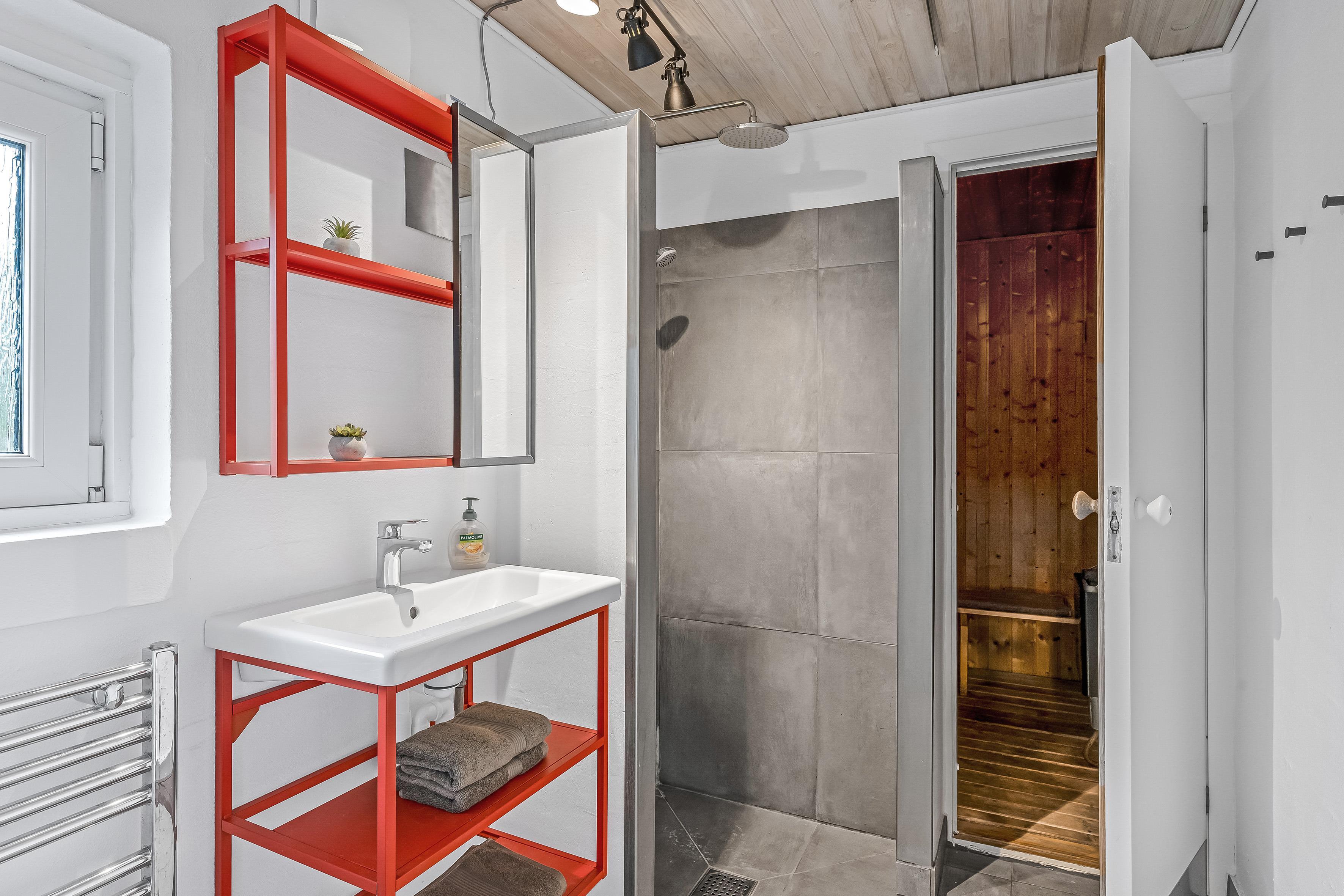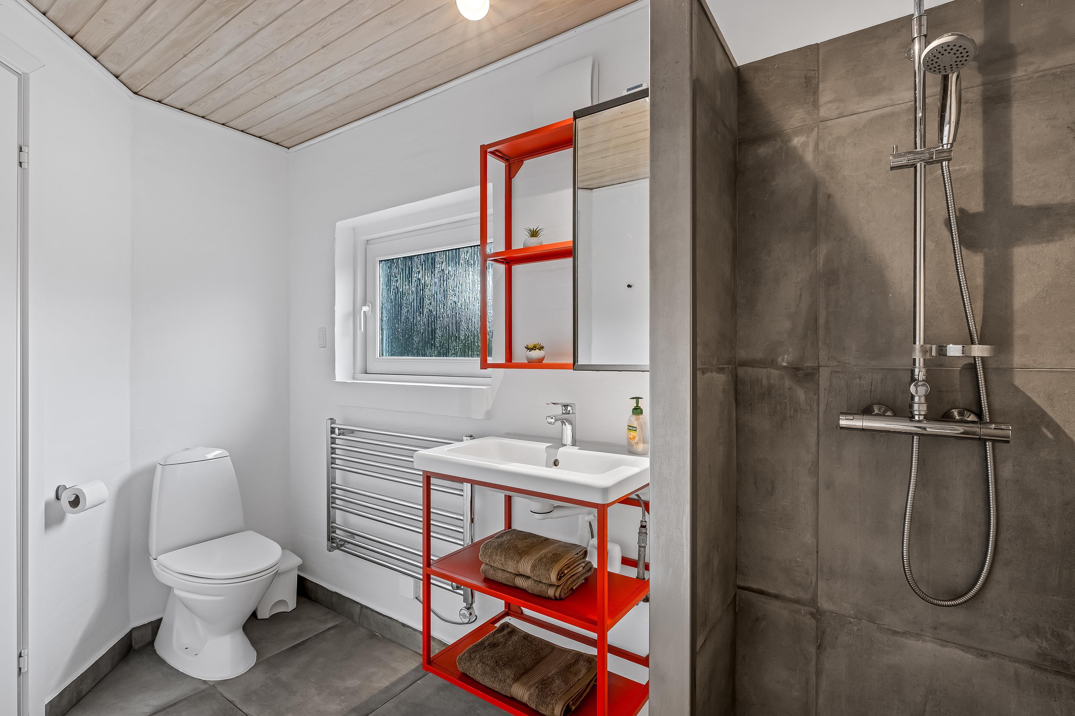 The heart of the house is the open-plan living area, where the kitchen, dining area, and living room blend seamlessly. Here, you can enjoy each other's company while some prepare meals in the modern kitchen and others relax by the wood-burning stove. An energy-efficient heat pump ensures a comfortable indoor climate. There are also two bathrooms with underfloor heating.