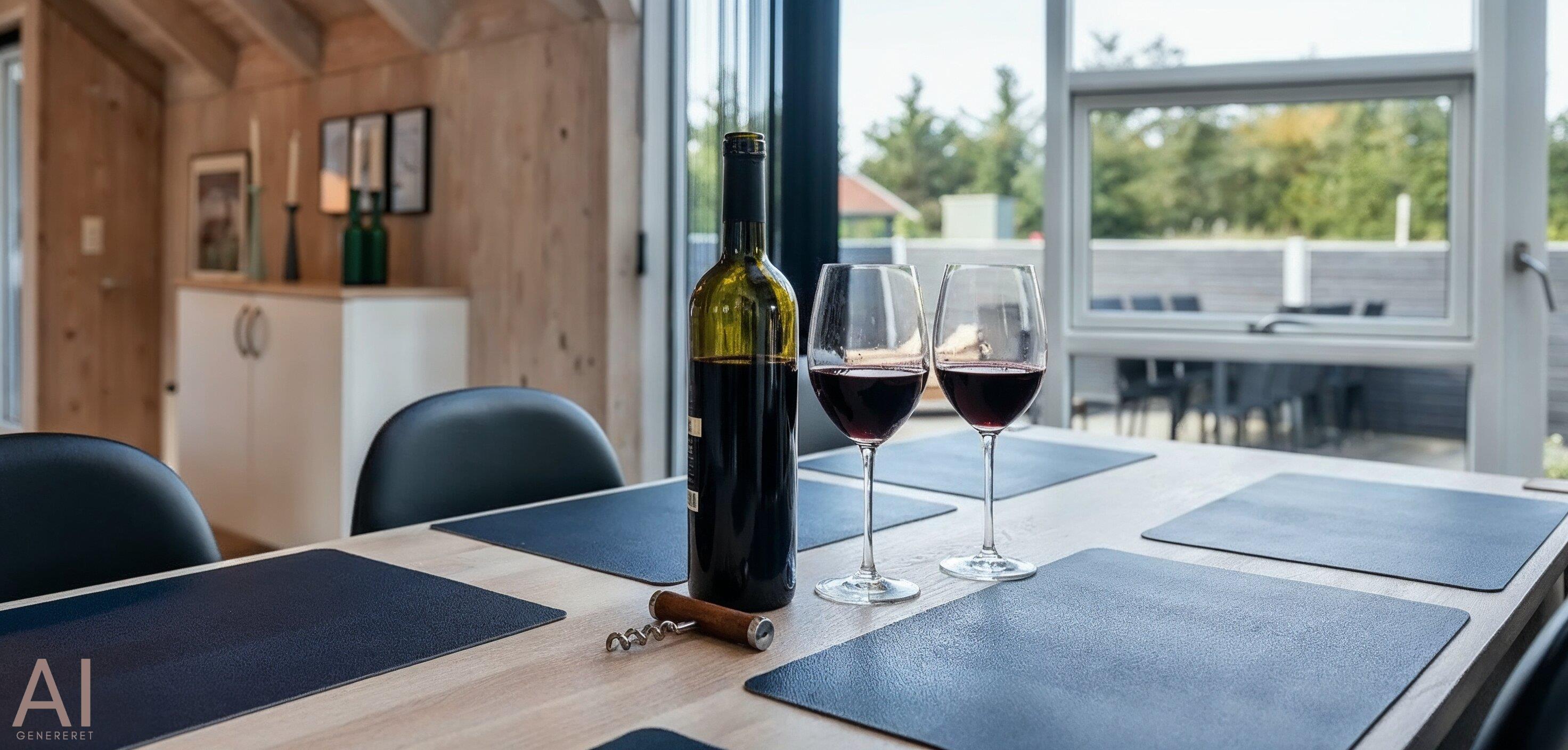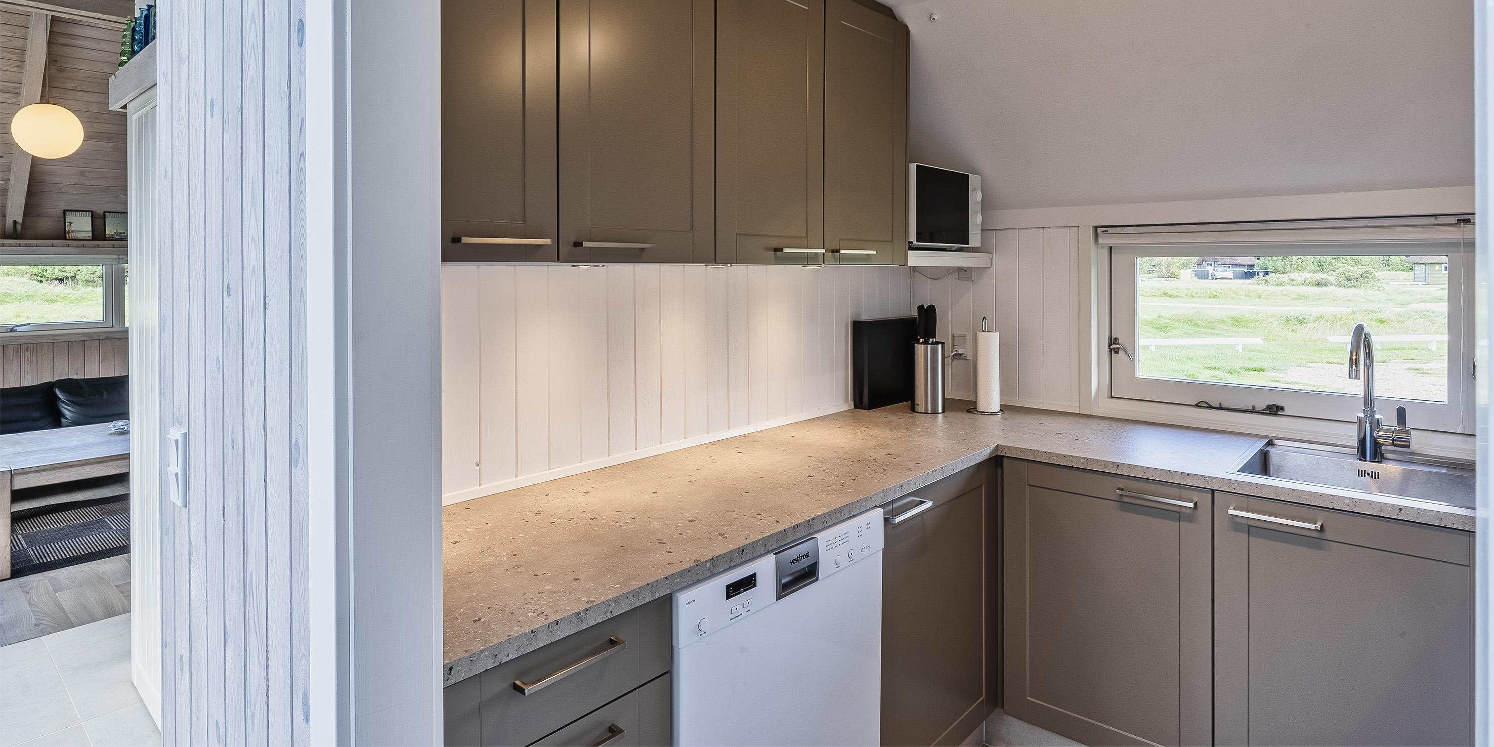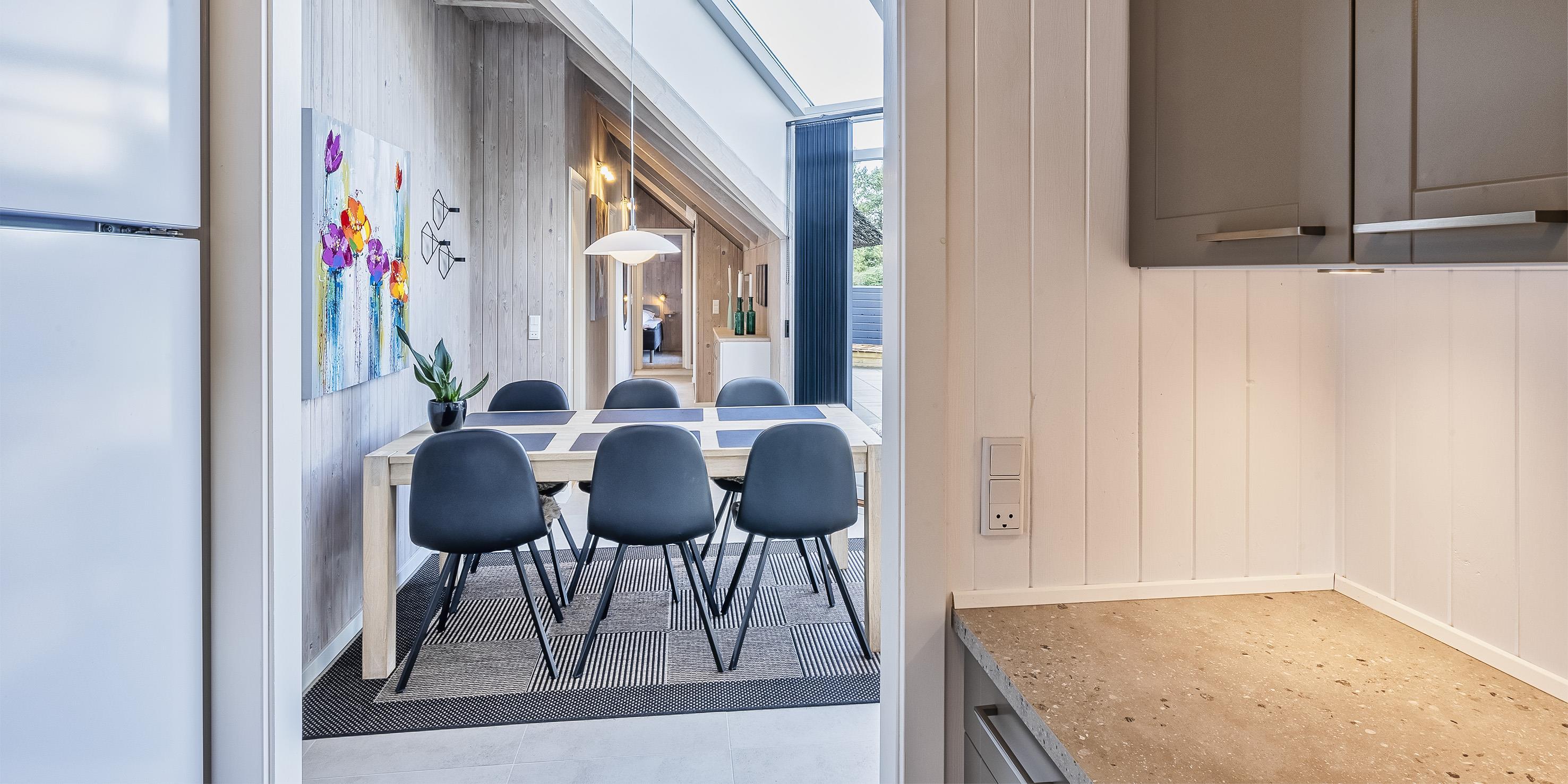 The holiday house: Entrance hall with space for your wardrobe. The house has a nice bathroom with floor heating and a combined washing machine and tumble dryer. The kitchen is connected with the dining area which is nice and bright from the big windows and has access to the terrace. The kitchen is well equipped with a dishwasher, a microwave, a hob, a hood and a fridge as well as a small freezer. The cozy living room has a woodstove, a television, a DVD-, a radio-, a CD-player and a wireless internet access (fiber 200/200).