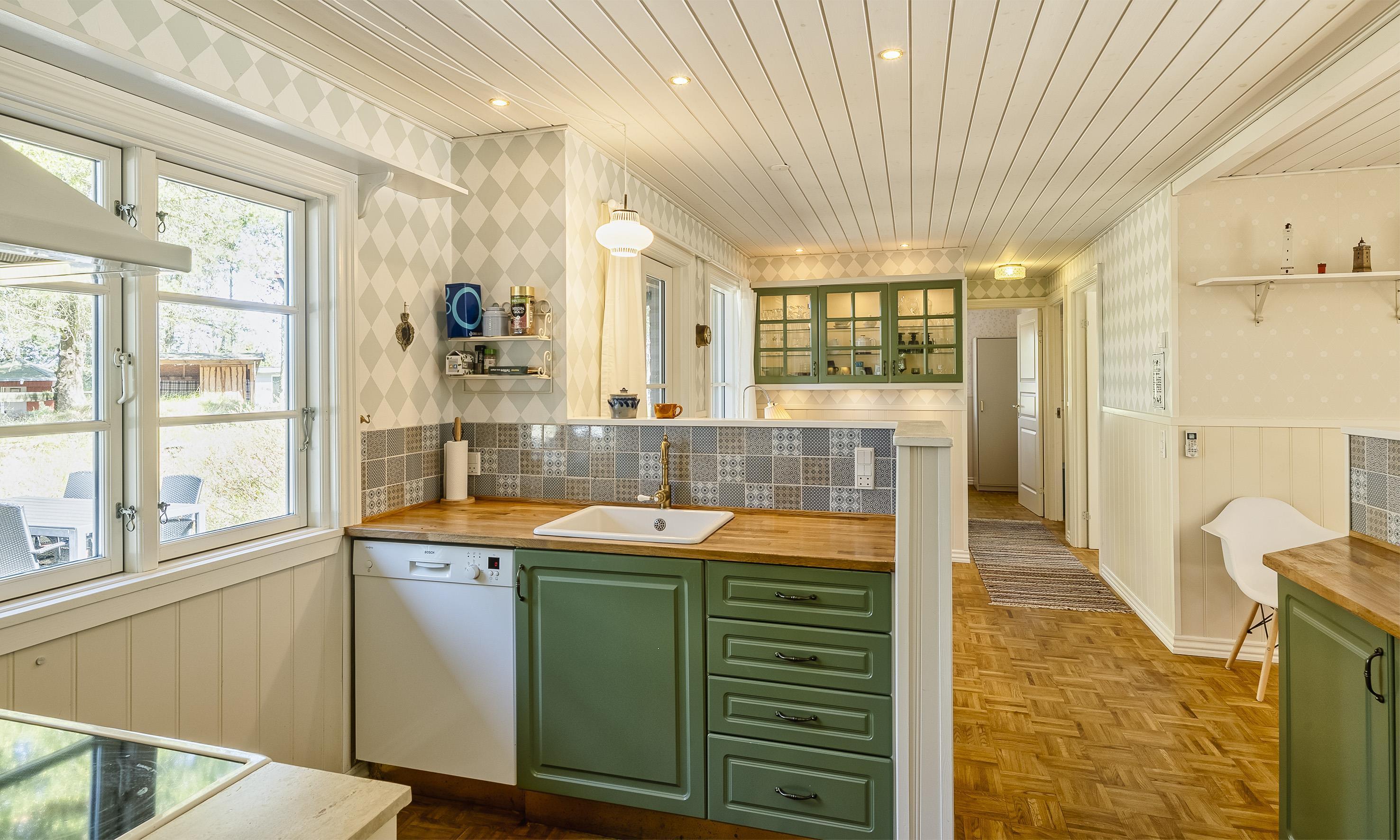 The living area is open to the dining space, making it easy to enjoy meals with a view of the garden. From here, you can step onto the east-facing morning terrace. A cosy little corner by the kitchen leads out to the west-facing terrace. The lounge is fitted with a smart TV, wood-burning stove and large double doors opening to the terrace. A heat pump and Wi-Fi are also available.