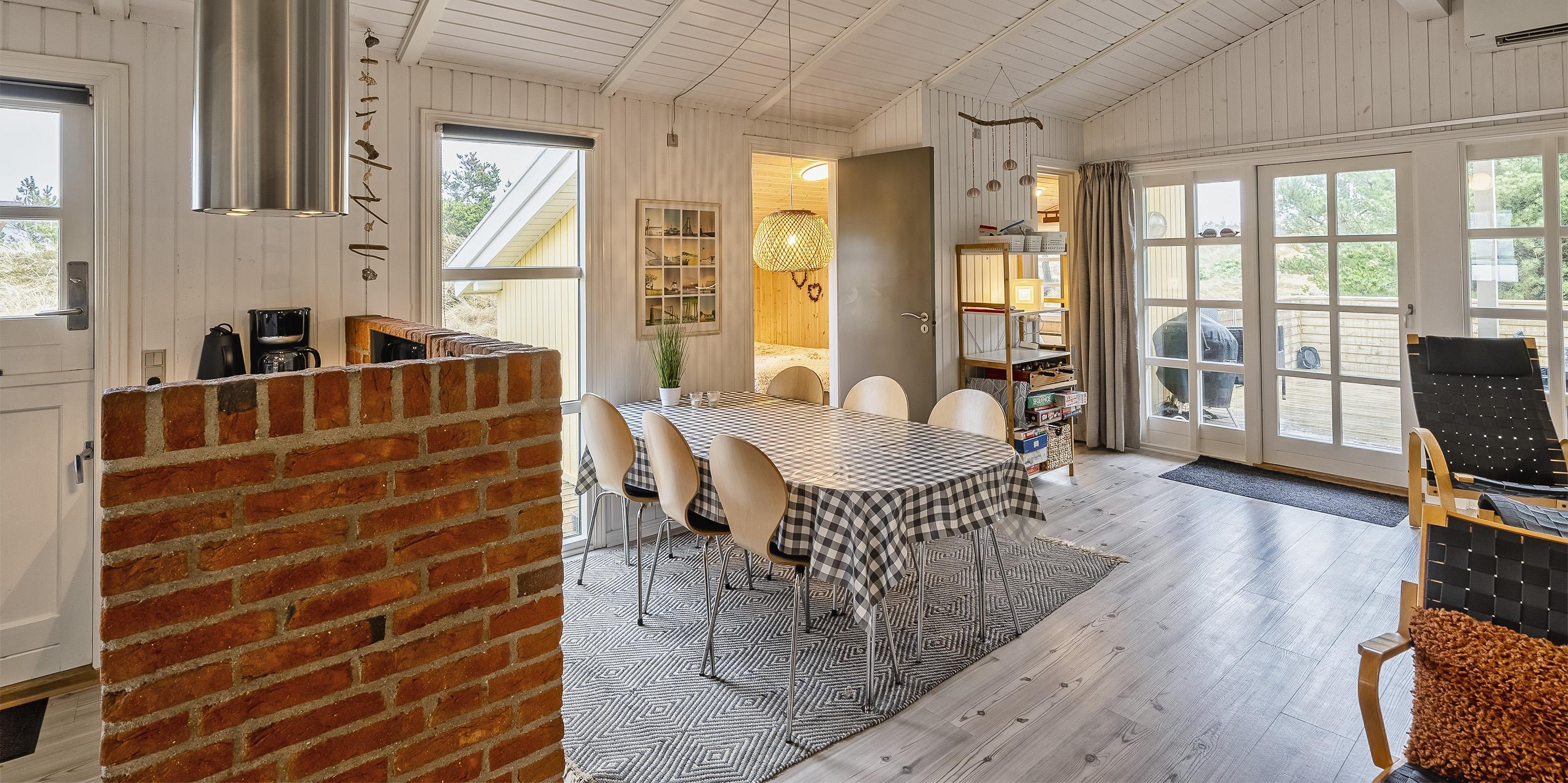 Inside the summer house at Risvej 4, a bright and friendly interior awaits, creating a pleasant atmosphere. The living room is the heart of the house, where you can watch movies, cook, and enjoy the crackling flames of the wood stove. In the bathroom, you will find a wonderful sauna, perfect for relaxation after a trip to the sea or a refreshing walk in nature. Additionally, the house offers plenty of indoor activities for families and guests of all ages, such as billiards, mini football, mini table tennis, air hockey, DVD and div. film, and a shelf filled with board games.