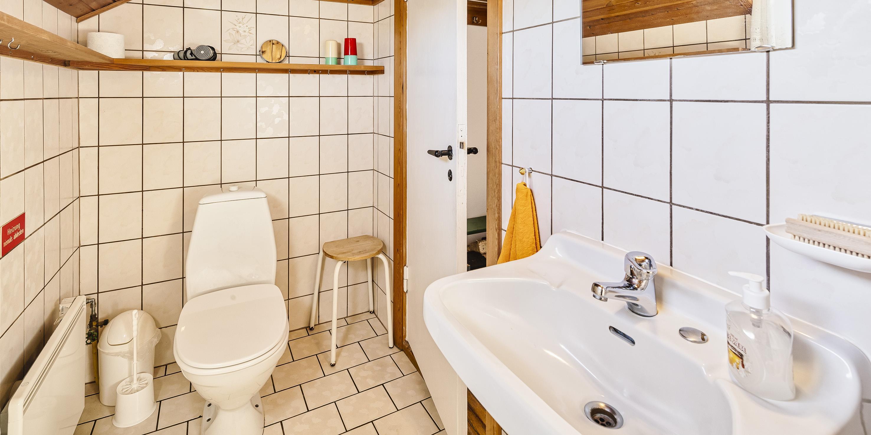 Badrum med toalett, dusch och handfat