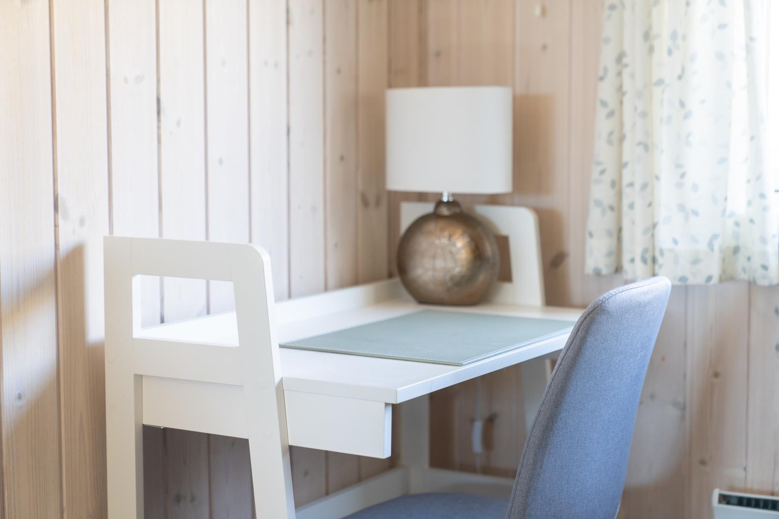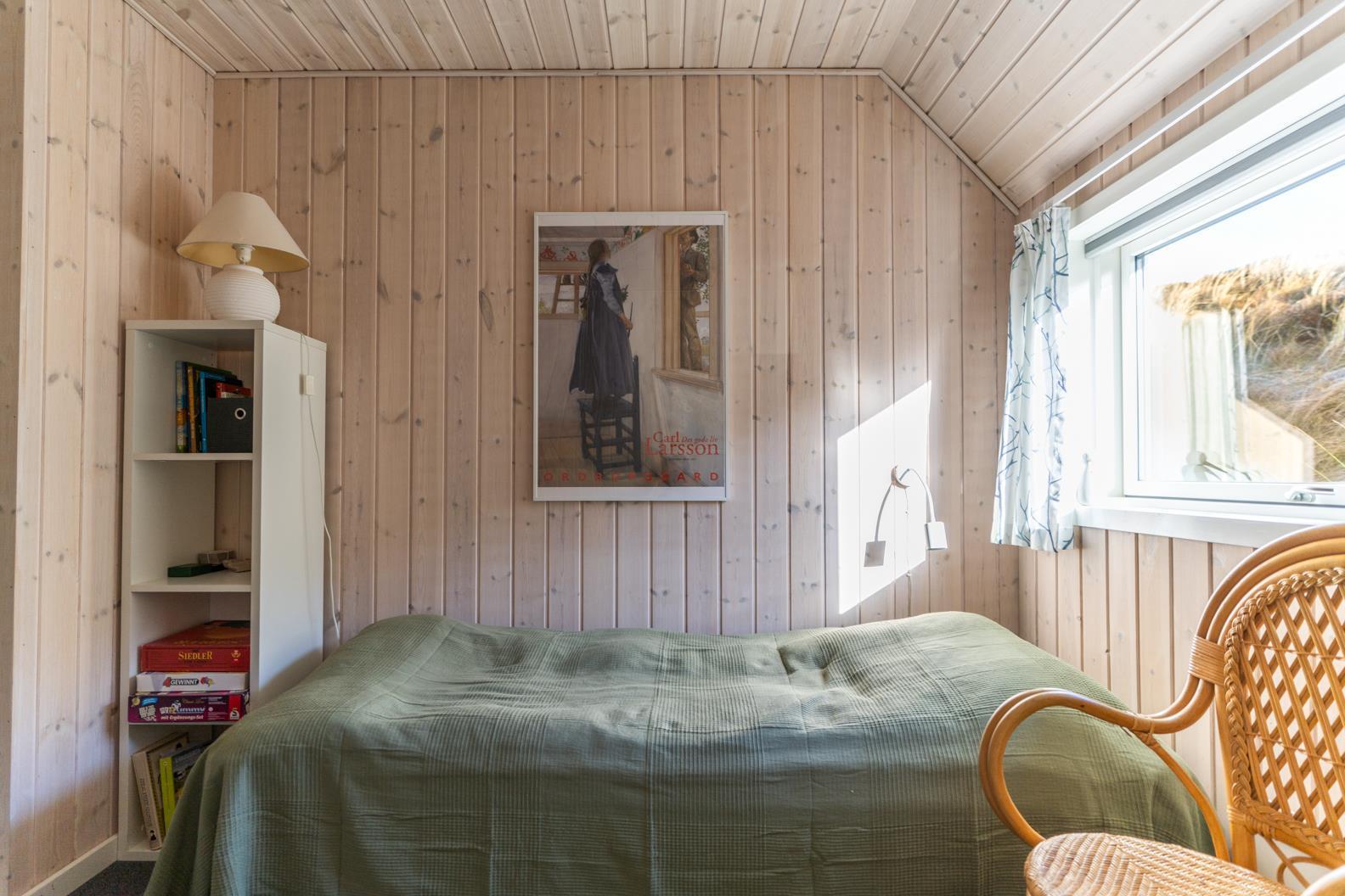 The living area goes down a step, where the fireplace is also located. Here you will find great furniture, with comfortable armchairs by the fireplace and a corner sofa for cosiness. There are German TV programs and Danish (DR channels) in the house. A small cozy corner with a small extra sofa for cozy reading hours and an exit to the terrace area is also located in the house. From the entrance area you enter the bright kitchen area. In the kitchen there is a stove with ceramic hob, an oven, a dishwasher and a fridge-freezer. The kitchen is separated from the dining area by a half-height wall and is nevertheless kept open. There are a total of three bedrooms in the cottage: DB + DB + 2B. The 4th bedroom is located in the insulated and warmable anneks/guest house. There are the other 2 sleeping places. This is a bunk bed. From the entrance area you enter a guest toilet, equipped with toilet and hand basin. A washer and dryer are also available for guests to use. A large new bathroom is also available to guests. It has a hand basin, toilet, shower, corner hot tub and sauna. There will be another shower room, the former utility room will be converted for this purpose.