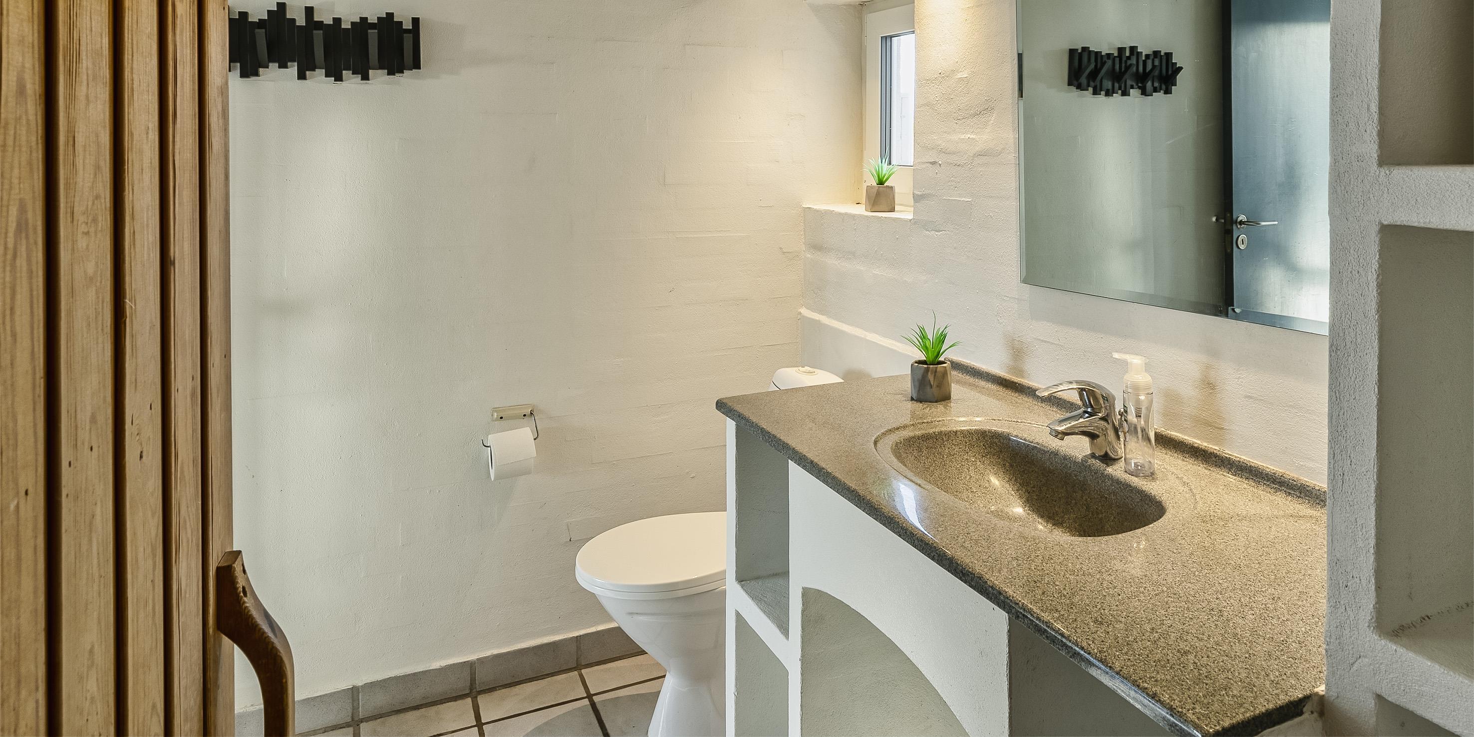 Badrum med toalett, dusch och handfat