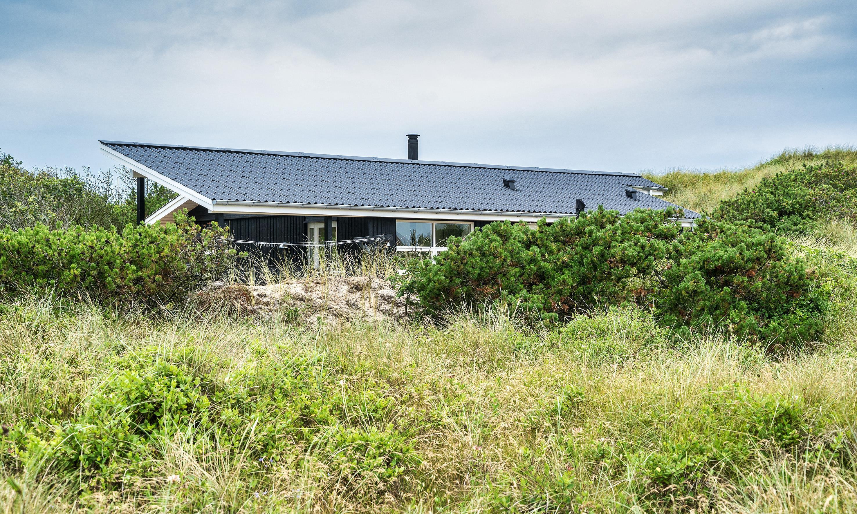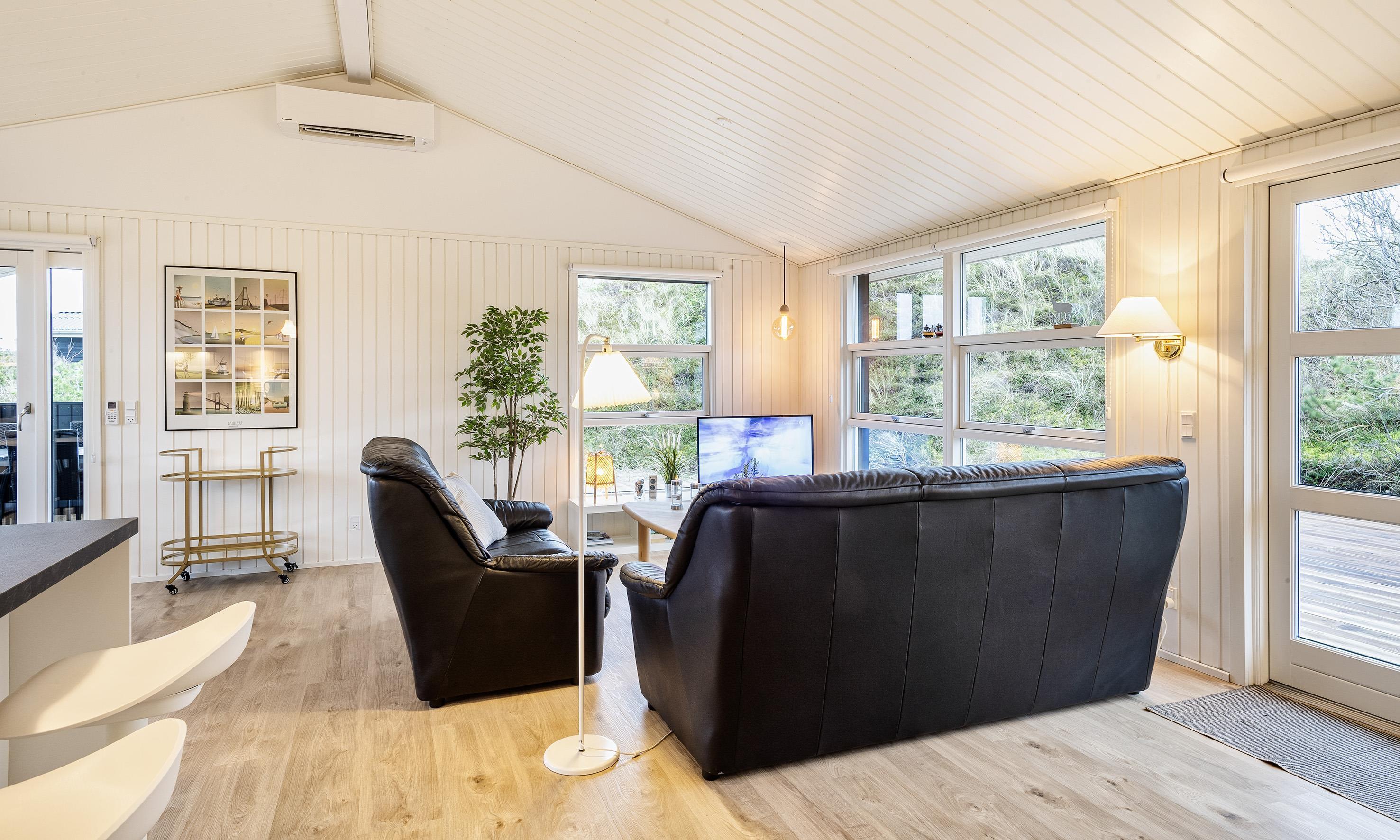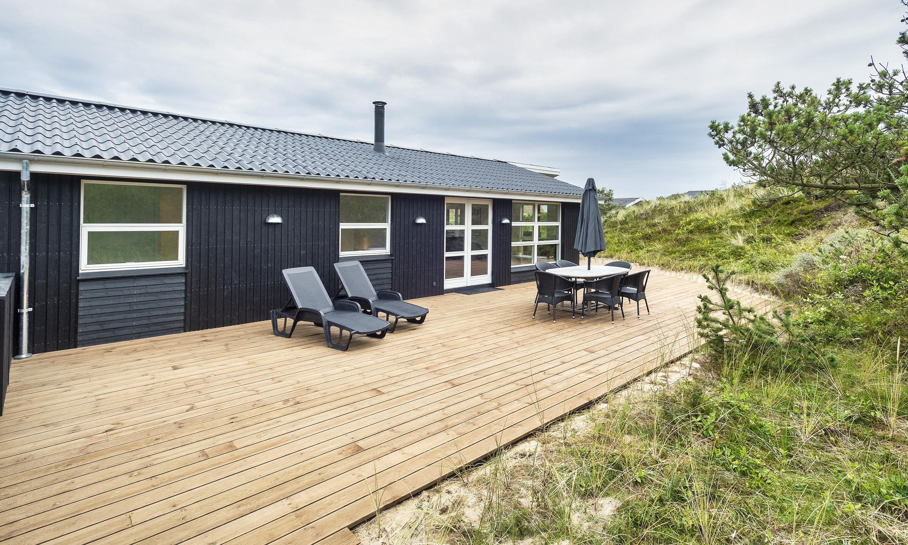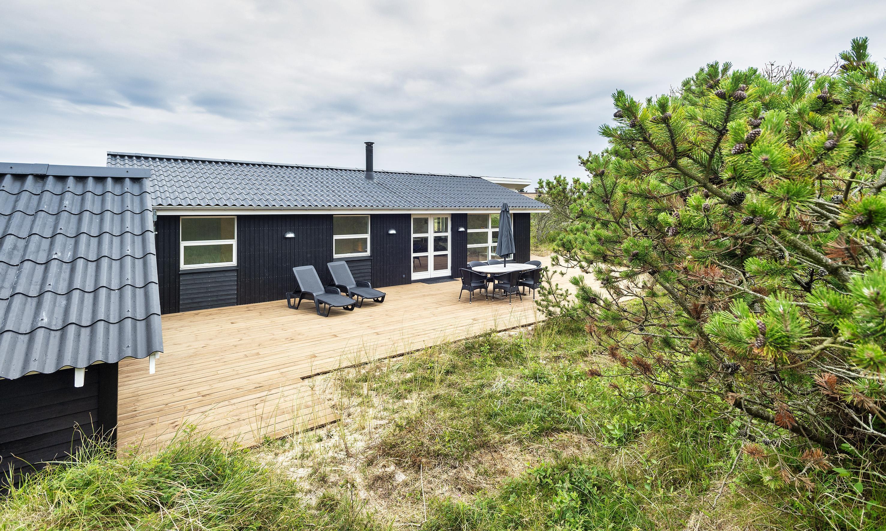 Very tasteful summer house for 6, privatly located, approx. 150 meters from the beach. The house contains, entrance hall with combined washing machine and tumble dryer. 3 bedrooms: DB + DB + 2B. Original but newer bathroom with toilet, sink and shower. From the distribution corridor you enter a lovely living room with a pitched ceiling, wood-burning stove and sofa corner with television (Stofa summer house package) and a view to the terrace. Wireless internet access. Open kitchen-living room with fridge/freezer combination, oven, induction hob and dishwasher. Nice dining area with a view to a large terrace and access to a partially covered terrace. Heat pump. Around the house there is a large wooden terrace, where the sun can be enjoyed from morning to evening. Pets are not allowed. Smoking is not allowed. Completely renovated 2019.