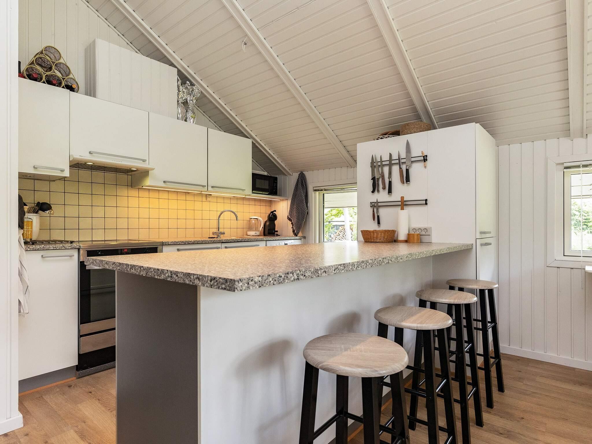Dette rummelige feriehus ligger på en stor, fuldt indhegnet naturgrund, der giver masser af plads til hele familien. Køkkenet og opholdsstuen i åbent plan udgør boligens hjerte, med en hyggelig opholds- og spiseplads samt en alkove med dobbeltseng. Køkkenet kan prale af en stilfuld ø med barstole, perfekt til fælles måltider og afslappede sammenkomster. Stuen er udstyret med både klimavenlig varmepumpe og brændeovn, der skaber en varm og indbydende atmosfære på køligere aftener.