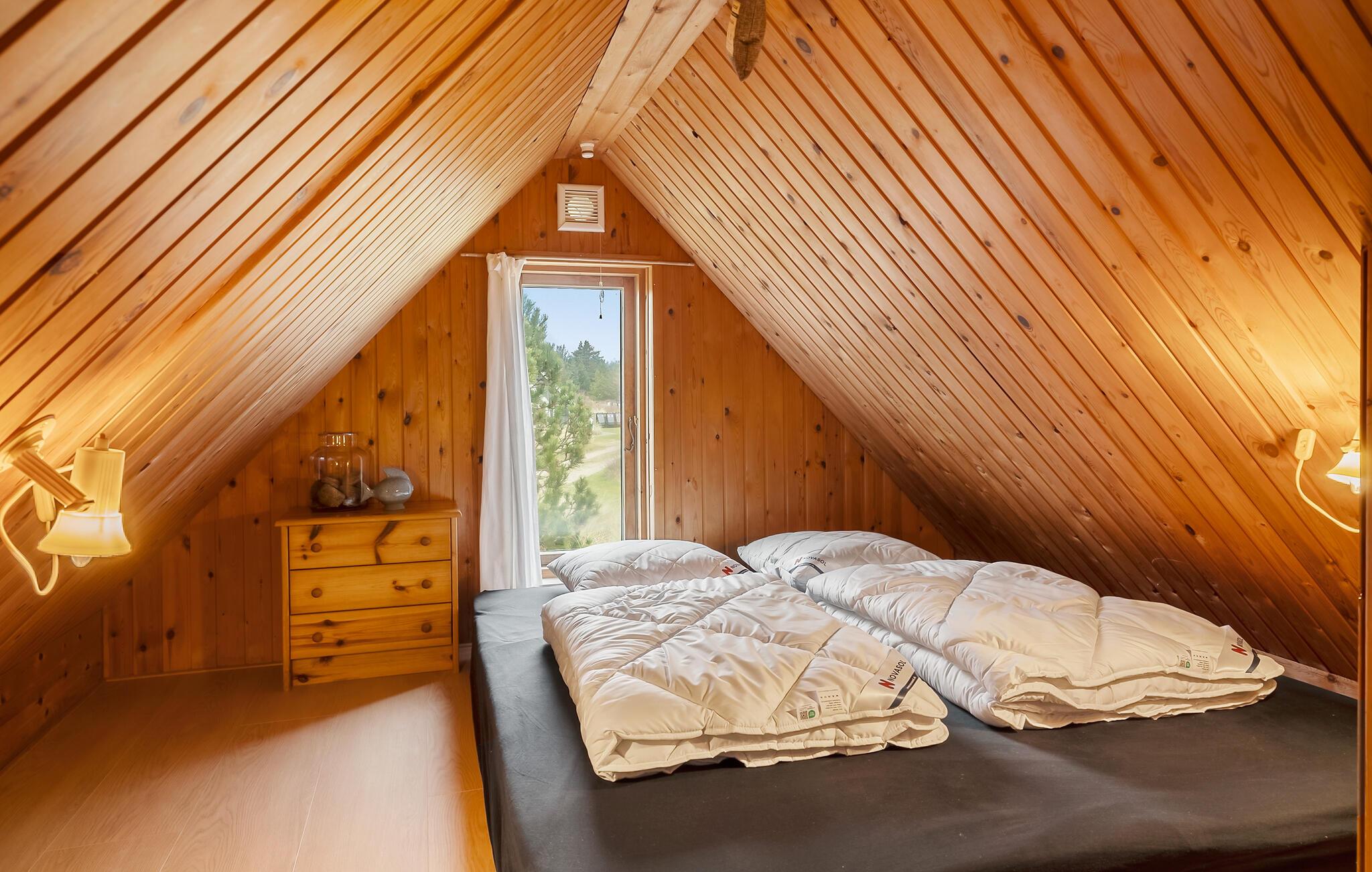 Stig in och njut av den öppna planlösningen med ljust trätak och markanta bjälkar som ger rummet struktur. Slå dig ner vid matbordet med utsikt över sanddynerna och använd det praktiskt utformade köket för att förbereda dina måltider tillsammans. Den vedeldade kaminen ger mysig värme under kyliga dagar, medan den mysiga sittgruppen med soffa och fåtöljer ger utrymme för avkopplande timmar. Se det förtrollande landskapet genom de stora fönstren och gör det bekvämt för dig medan du läser eller spelar spel.