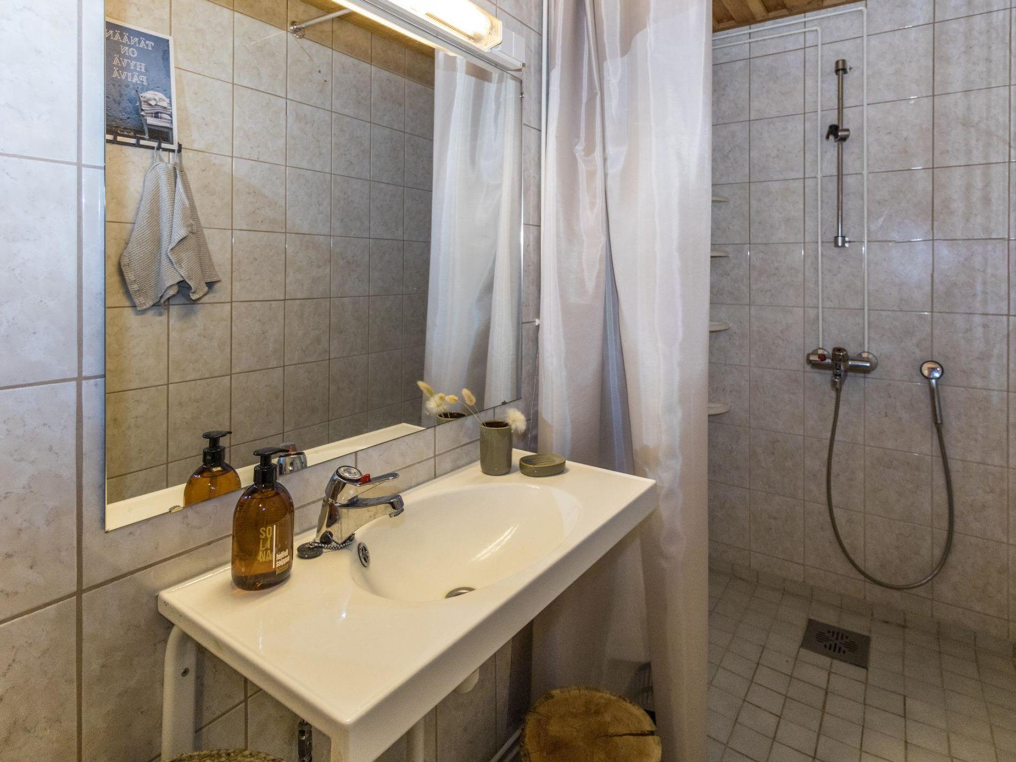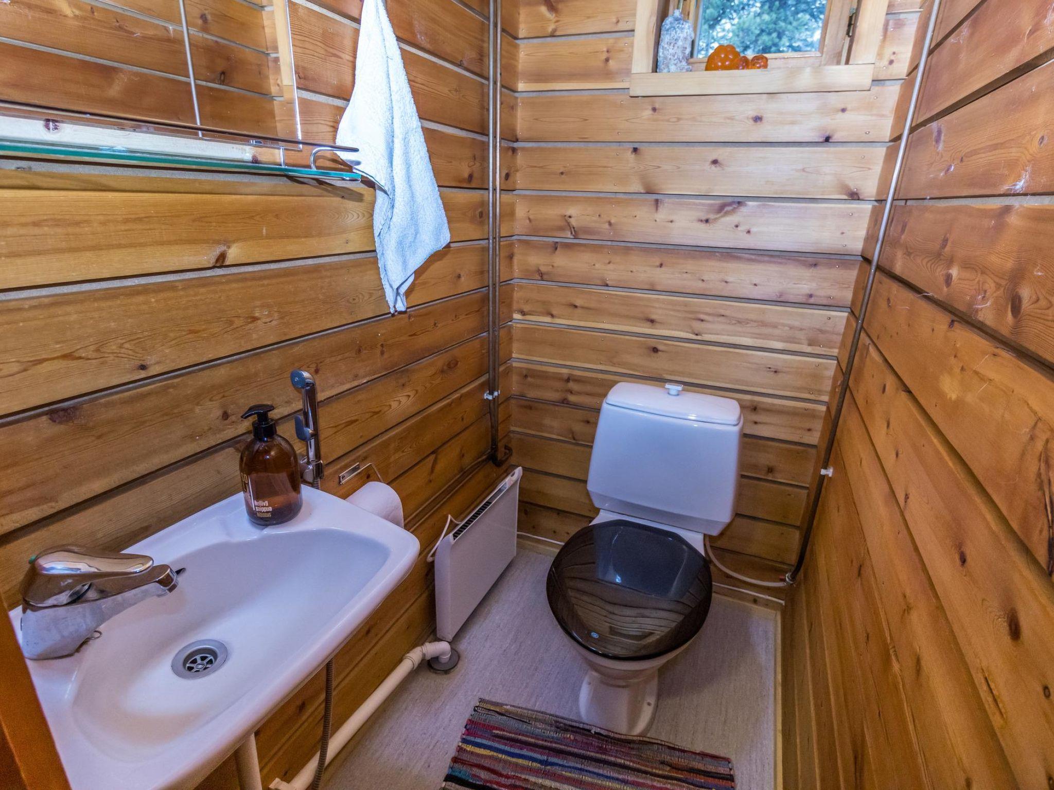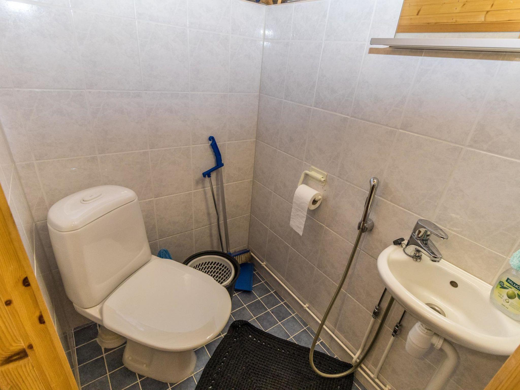 The cottage has two halls. The second hall has two separate toilets, access to the backyard terrace and it separates the living room and bedroom corridor spaces from each other. The second hall serves as an entrance hall between the bedroom corridor and the sauna section. The hall has its own space for storing and maintaining outdoor equipment. Skis can be lubricated on a rack. The cottage has sledges and snowshoes for tenants to use. The cottage has two high chairs.