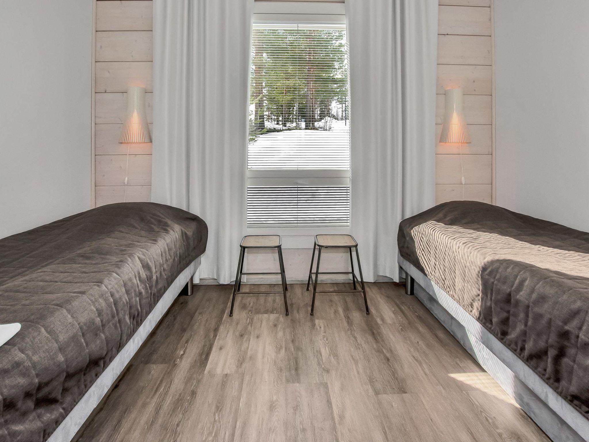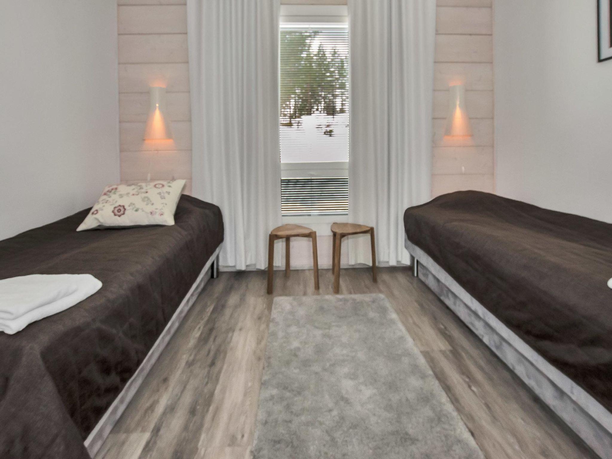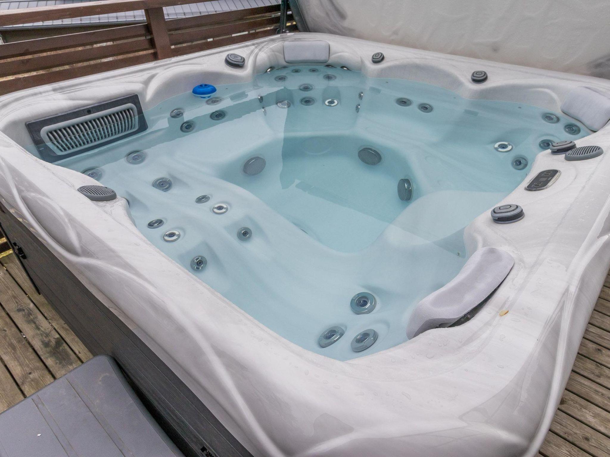 The villa features four bedrooms, each with two single beds. The spacious living room/kitchen provides ample space for socializing. There is a separate WC, and the washroom includes an electric sauna and two showers. A spacious terrace features a hydro massage bath, available for rent separately.