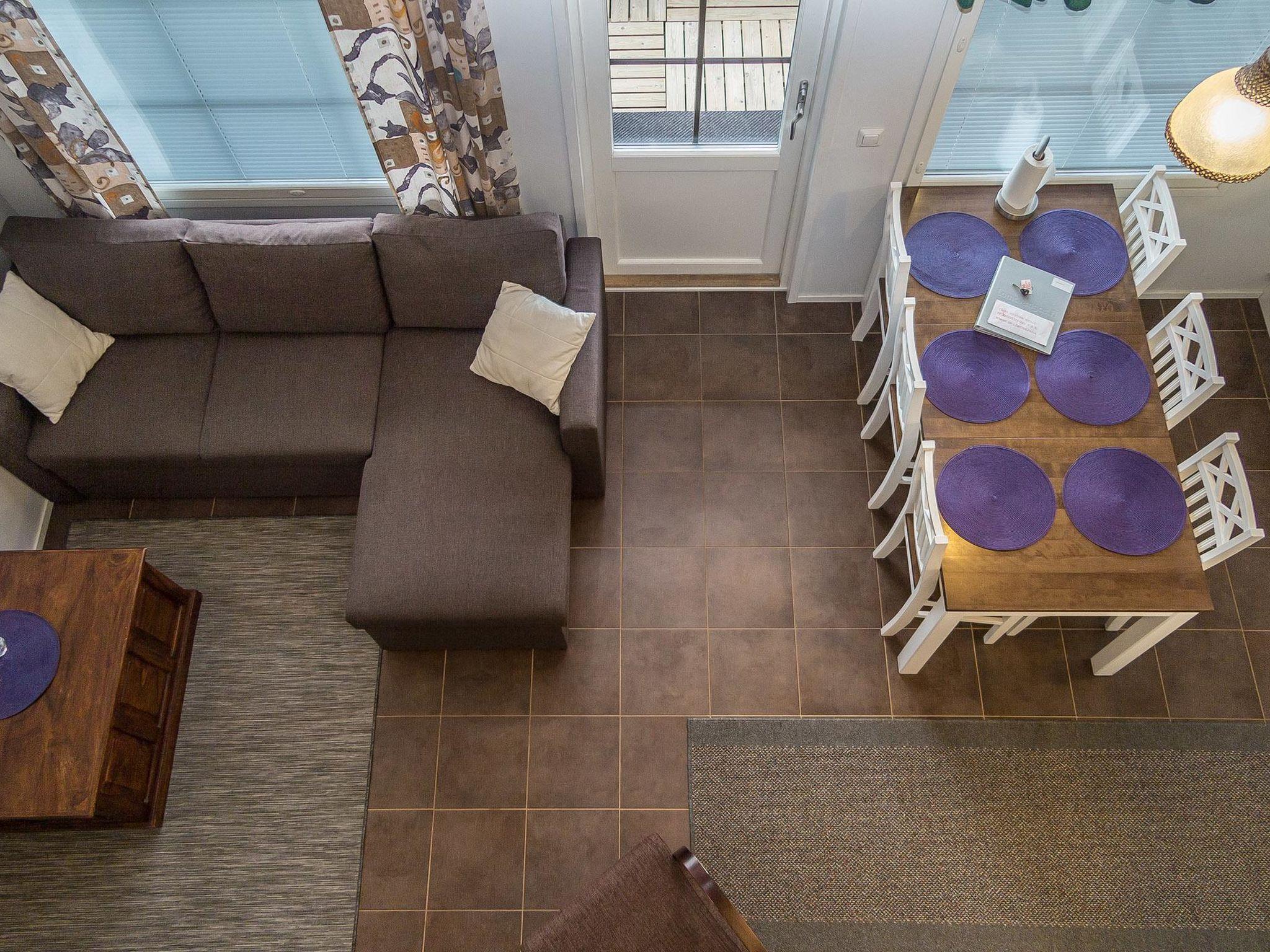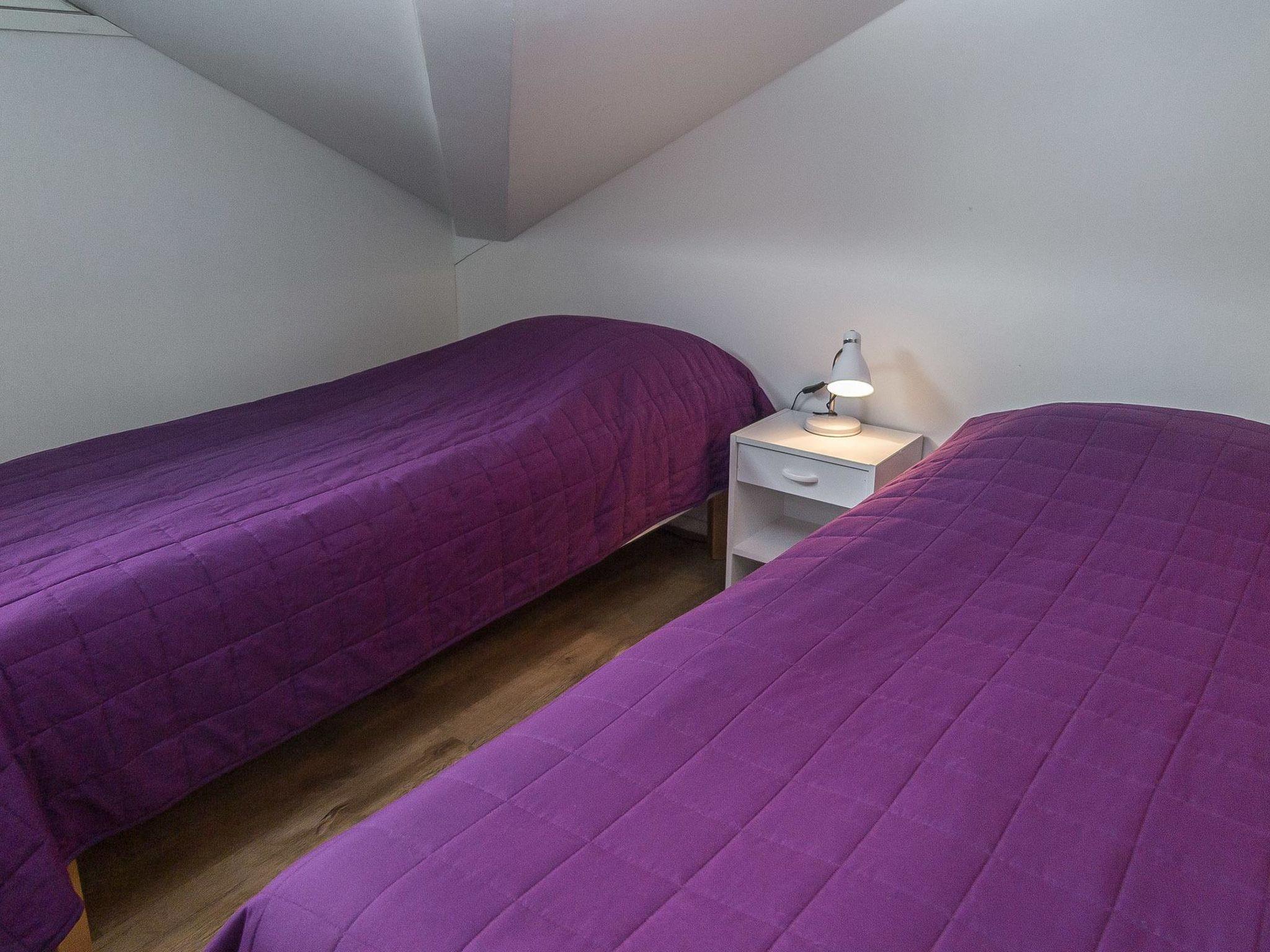 Living room/kitchen, bedroom with double bed. Washing room, WC, sauna (electric stove), hall and from balcony view to the slopes. Upstairs bedroom with 2 beds and a loft with 2 beds, on the upper floor there is another shower and toilet. Ski storage, 2-car plugs for cars.