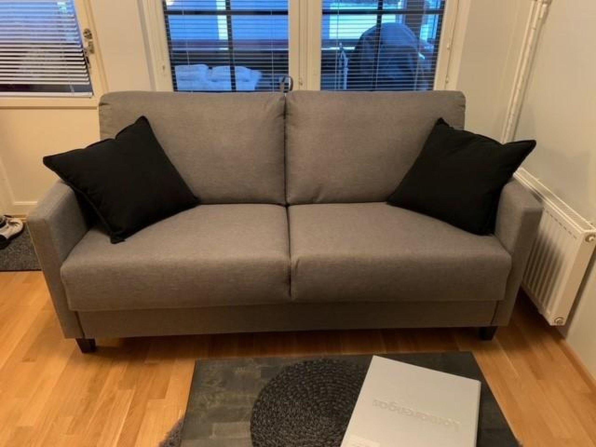 The apartment was renovated in 2018, a kitchenette with a double sofa bed (width 140 cm), a bedroom with a double bed (160 cm wide), a washroom with a toilet, a sauna (electric stove), and a large glass terrace. The specialty is the electric oven, which also works as a microwave.