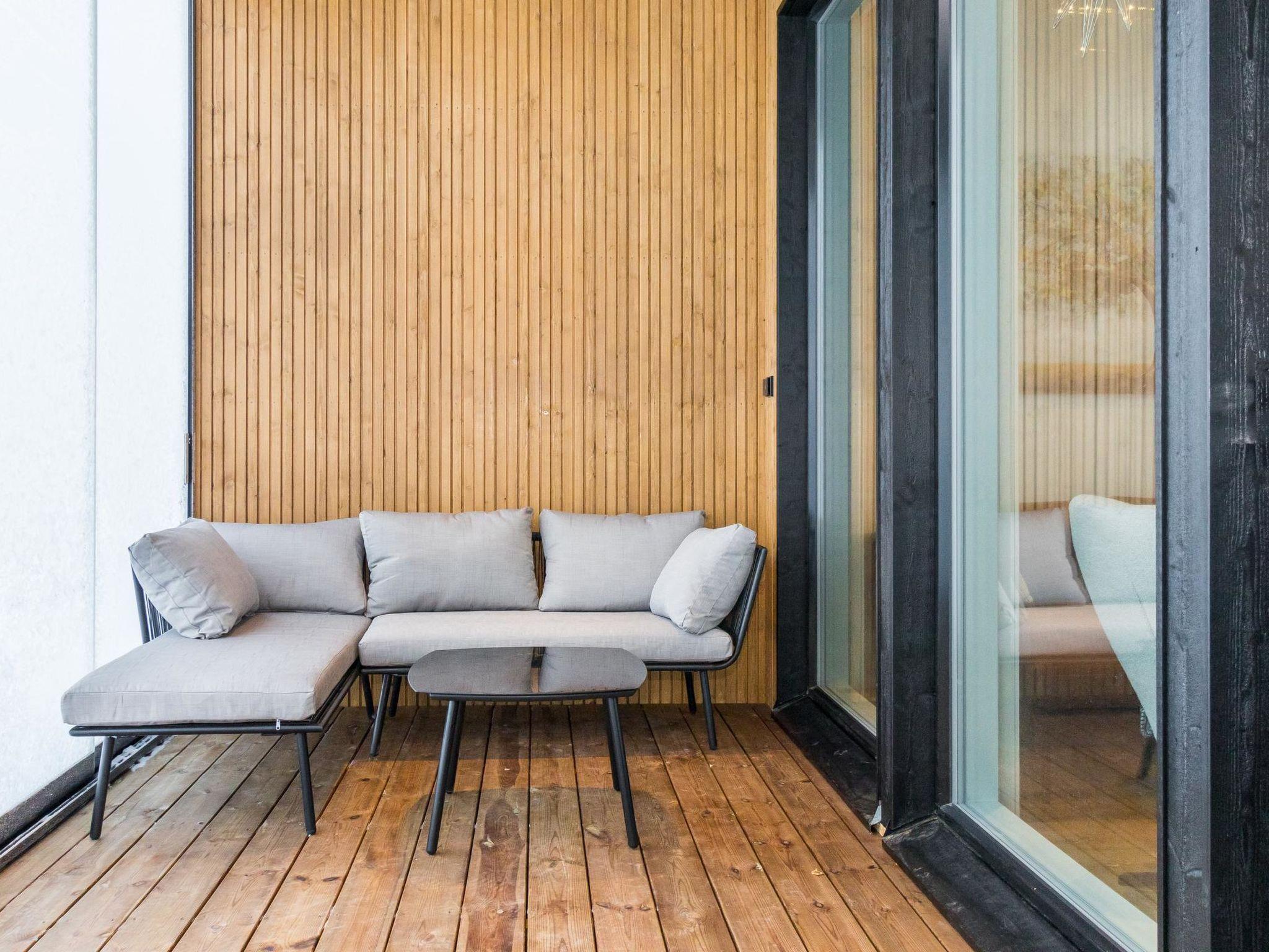 A large glazed terrace (20m²) and an open terrace of the same size in front of the villa. The villa has water-circulating floor heating throughout and a cooling air heat pump in the summer. The light fireplace is located in the terrace. The gas grill is in use during summer time.