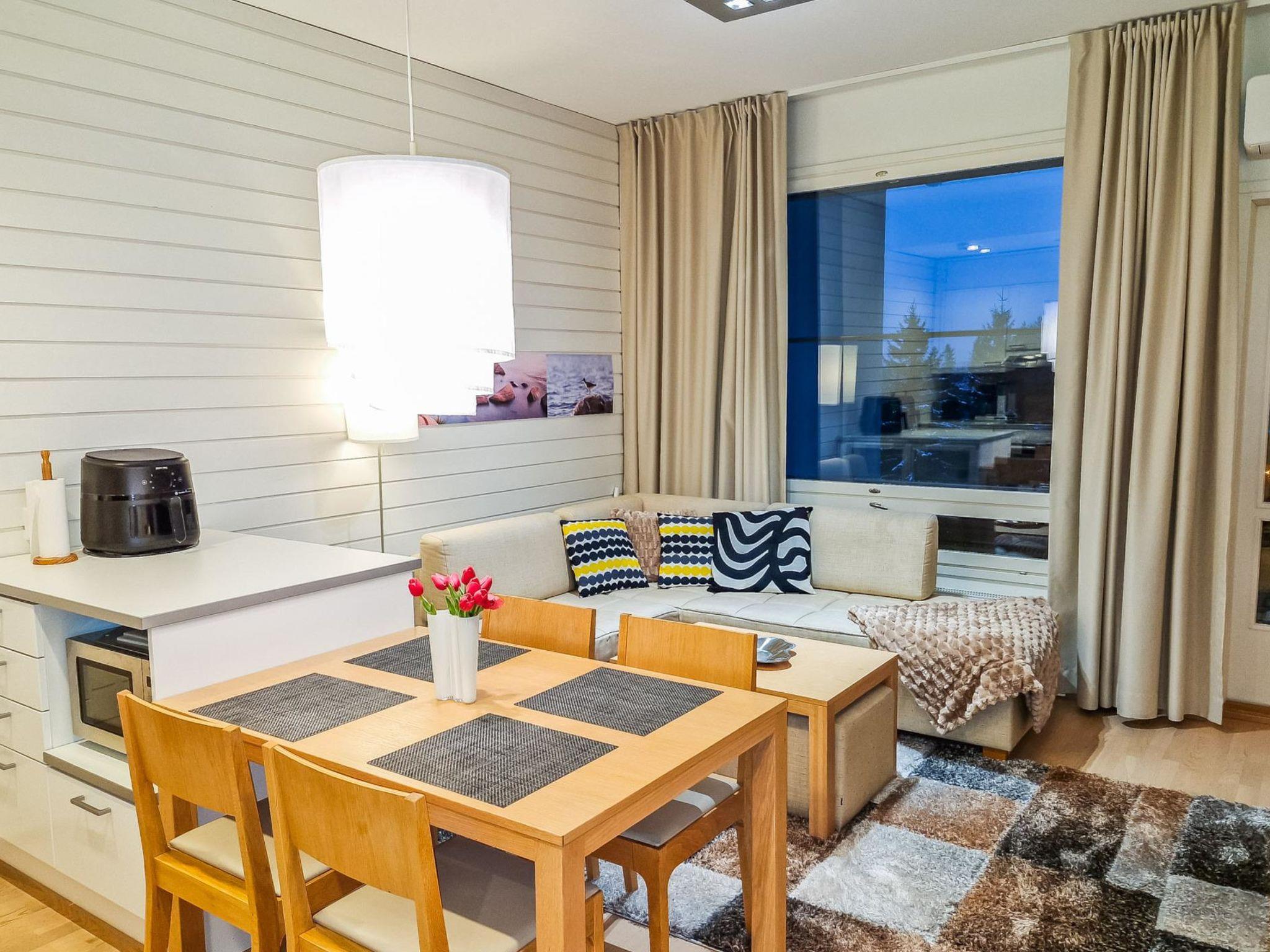 Good standard chalet apartment (??46,5 sqm + glassed terrace), which is located In the heart of Tahko. Kitchen/living room, bed room with sliding door 2 beds, a windowless alcove with sliding door bunk bed (120 cm wide), washroom, sauna (elect. stove), glassed terrace. Air source pump.