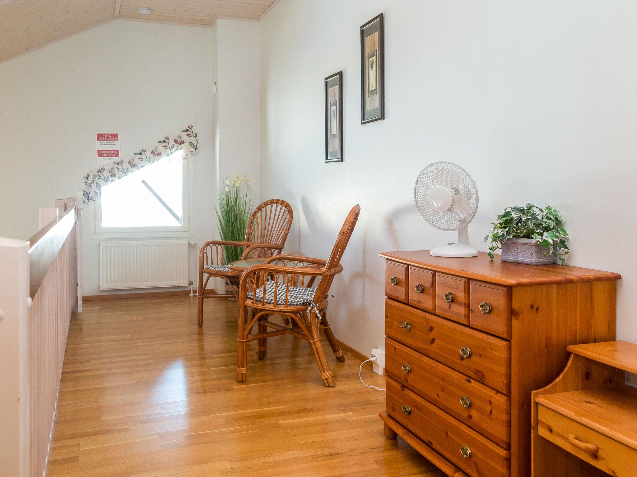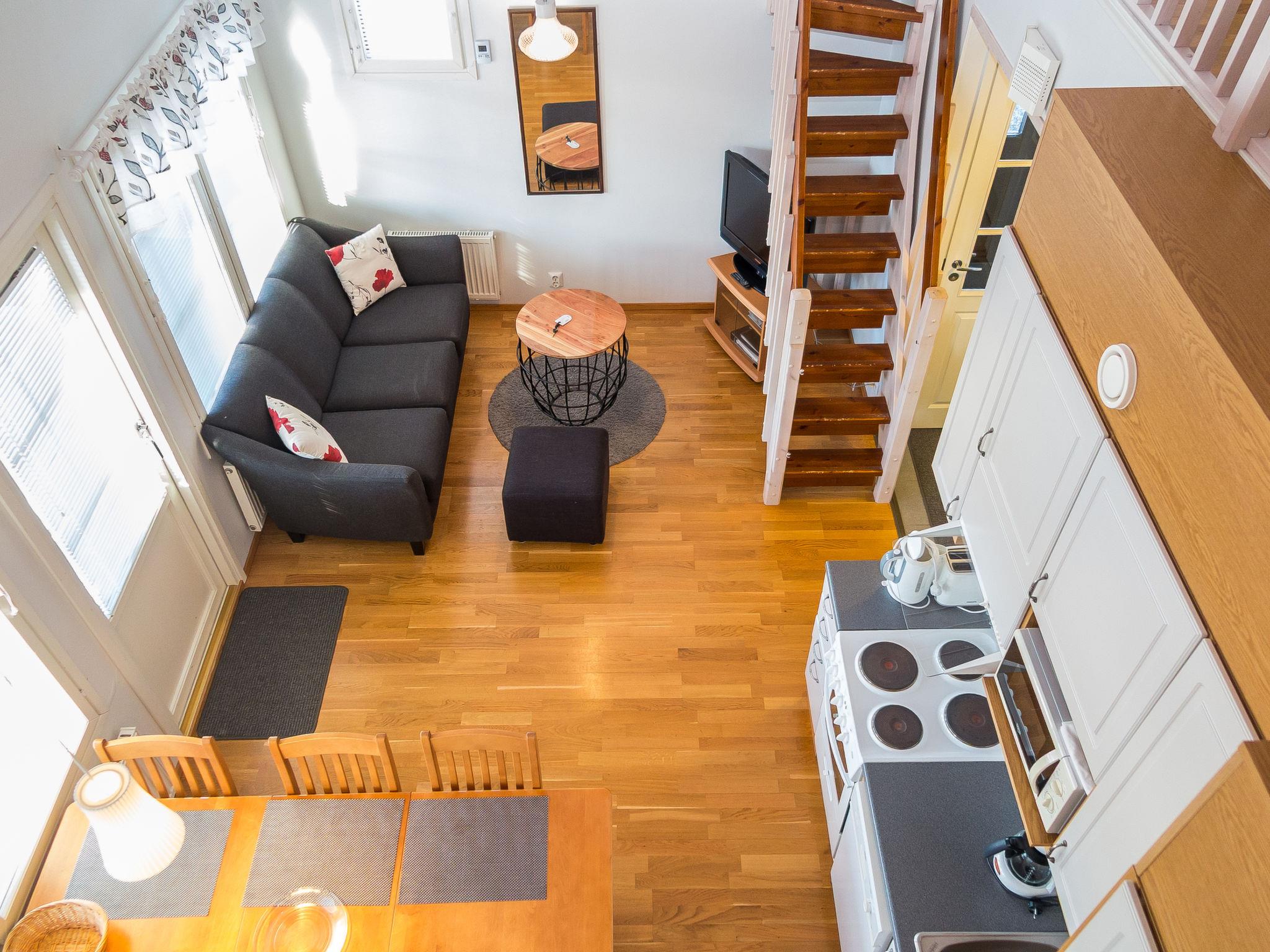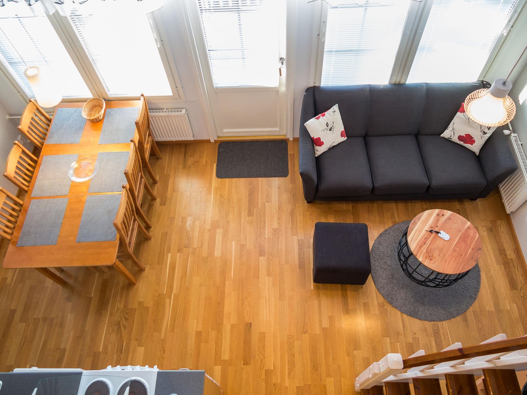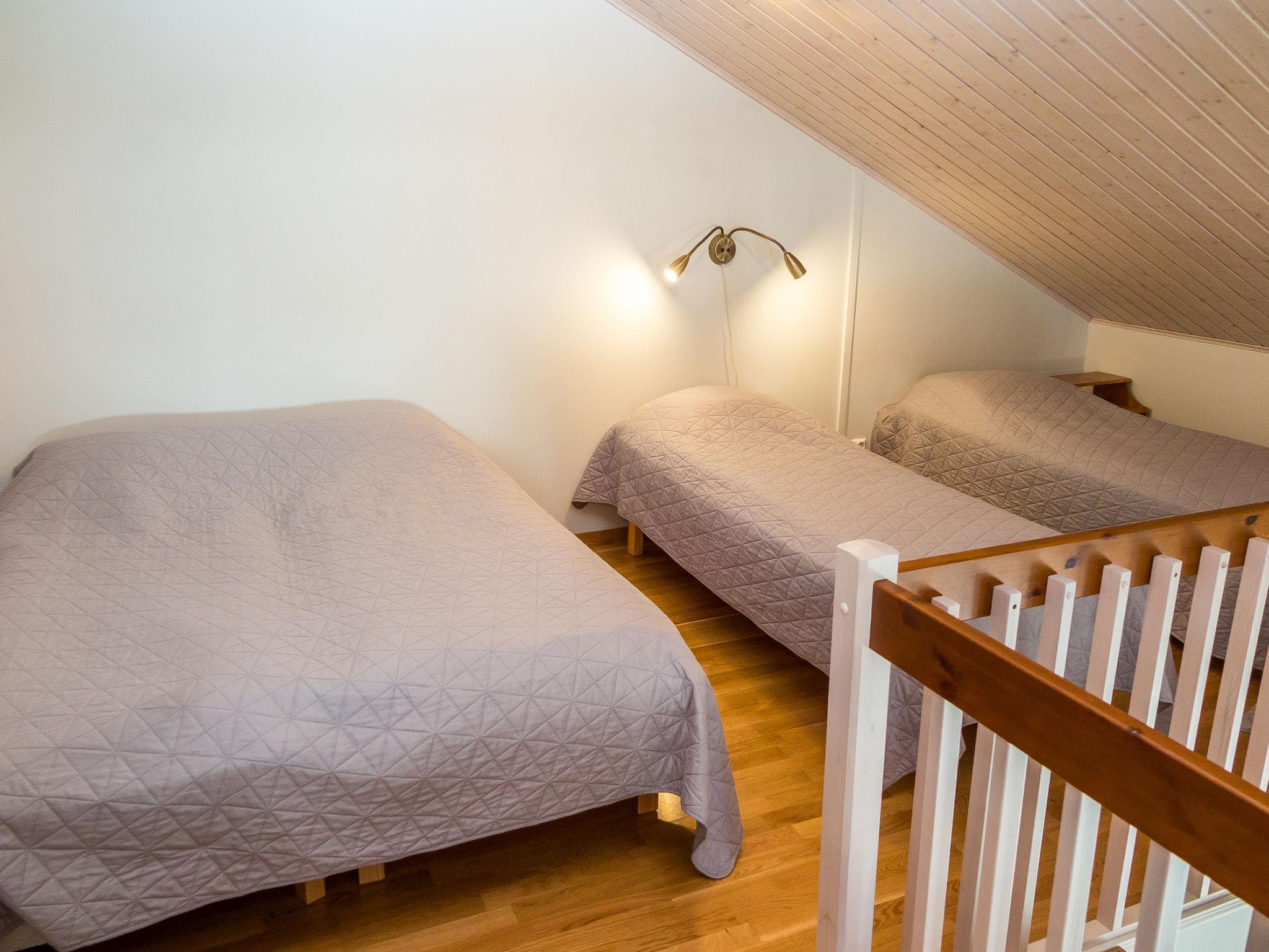 The lower floor features a cozy combined kitchen/living room and a bedroom with two beds. A bathroom and an electric sauna add extra comfort. The spacious loft on the upper floor has a double bed with a box spring and two separate box spring beds. Steep and narrow stairs lead to the loft, but a child gate ensures the safety of young adventurers.