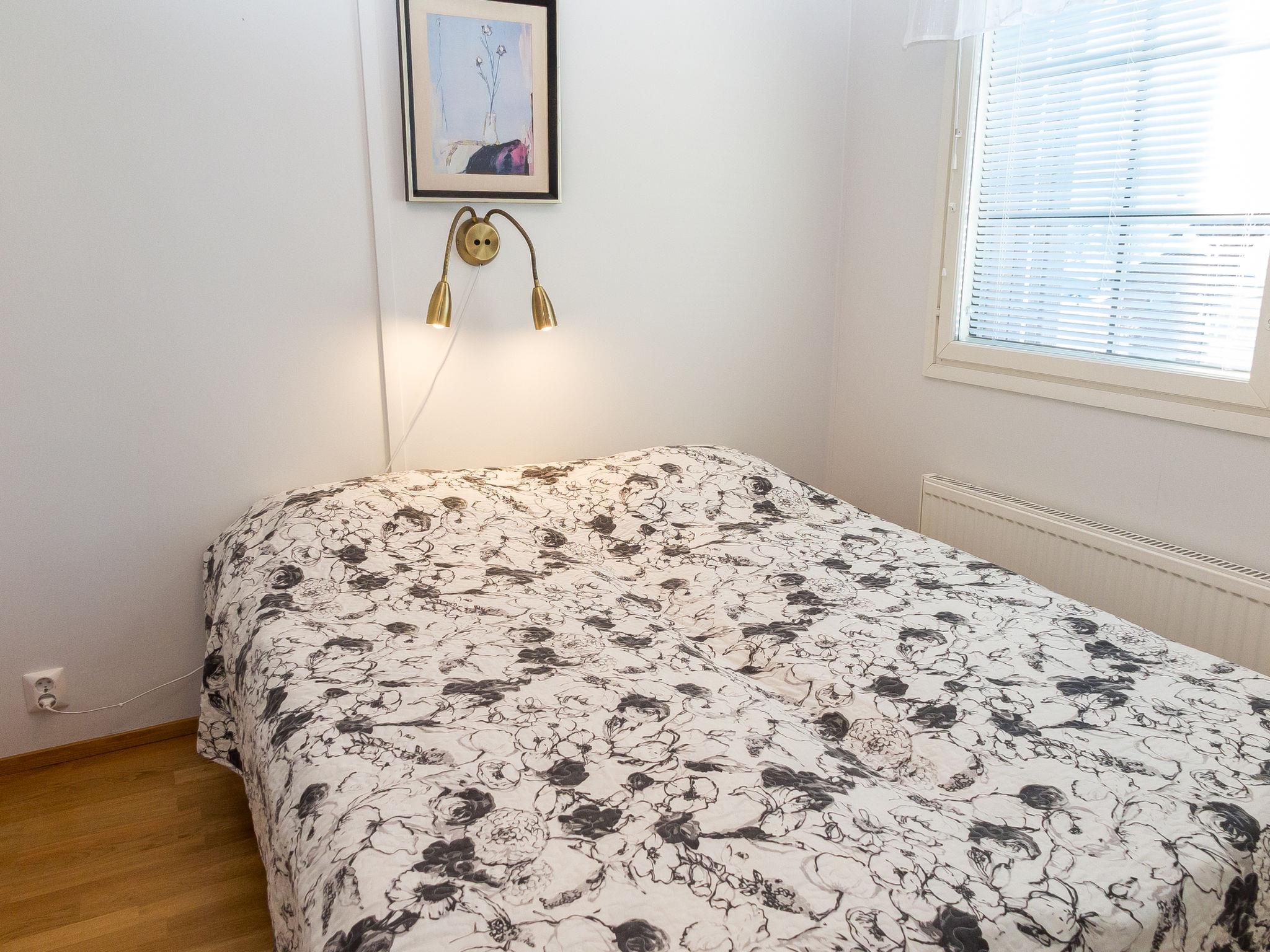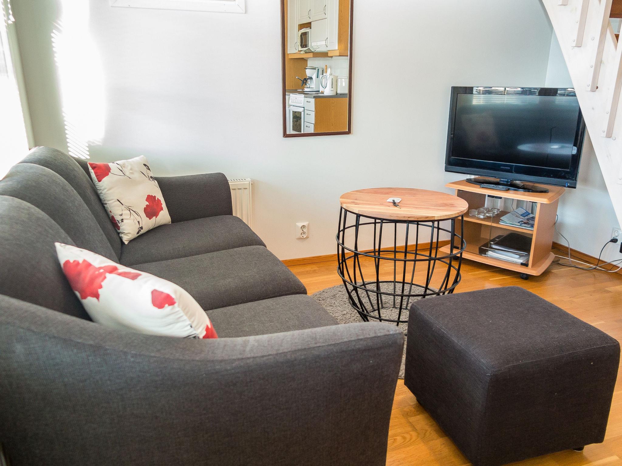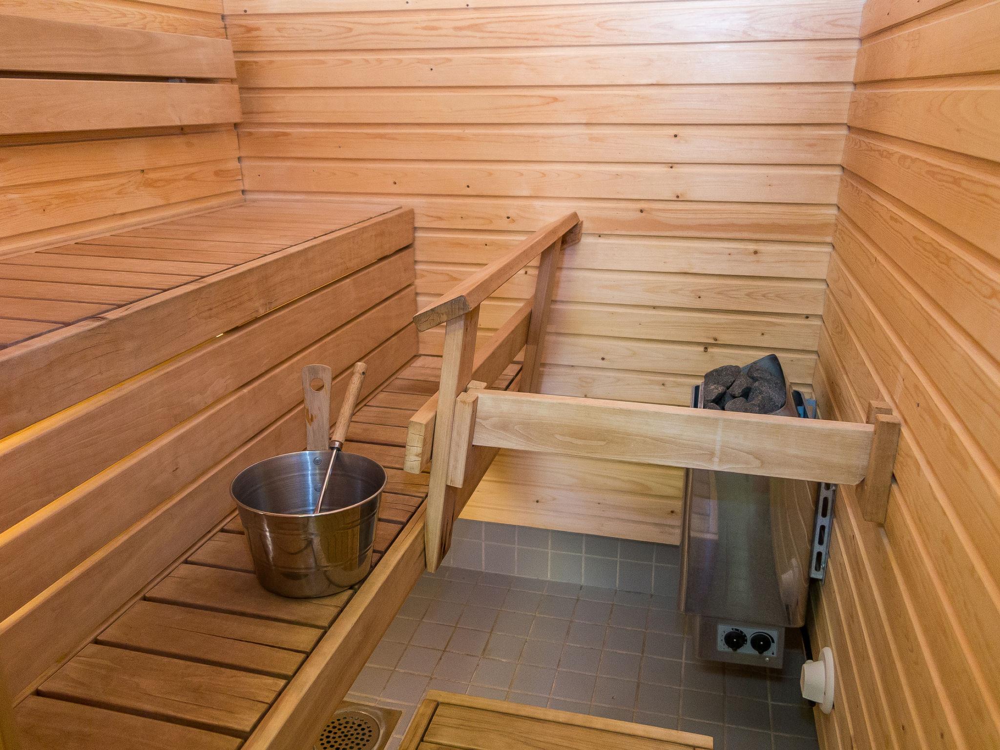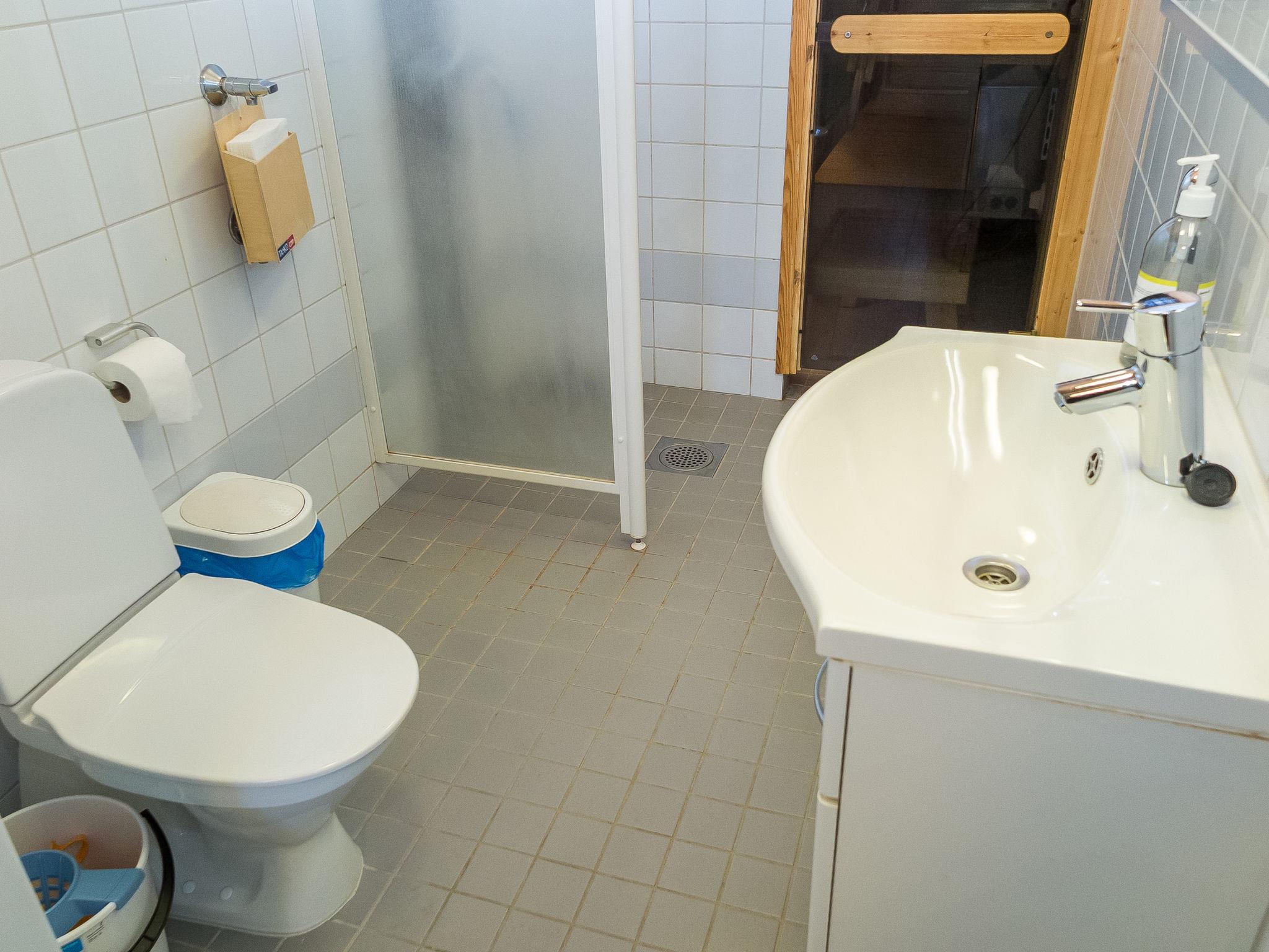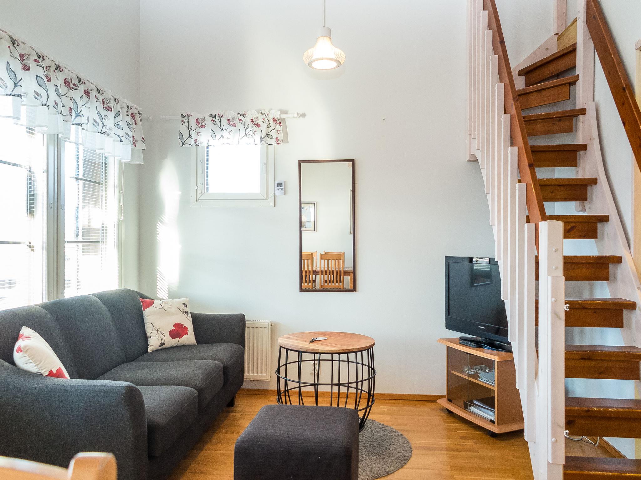 The lower floor features a cozy combined kitchen/living room and a bedroom with two beds. A bathroom and an electric sauna add extra comfort. The spacious loft on the upper floor has a double bed with a box spring and two separate box spring beds. Steep and narrow stairs lead to the loft, but a child gate ensures the safety of young adventurers.