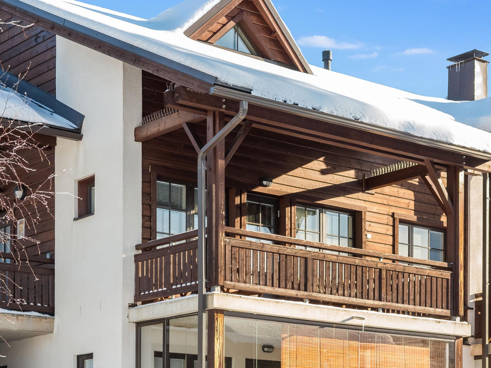 The apartment also includes a pleasant balcony of about 10 m², offering views towards the slopes. A lockable outdoor storage room is convenient for storing skis and golf equipment.