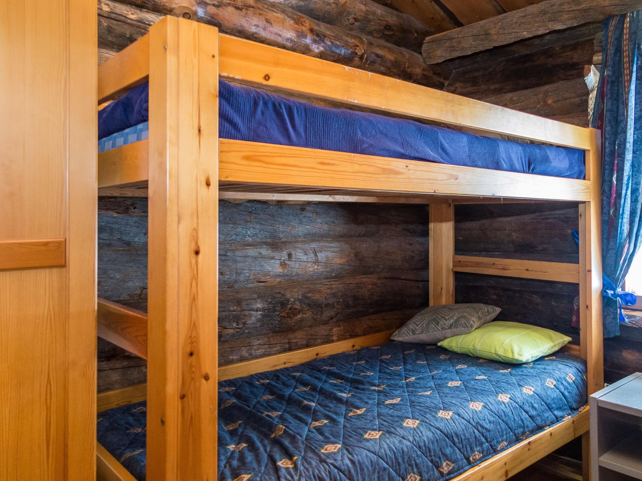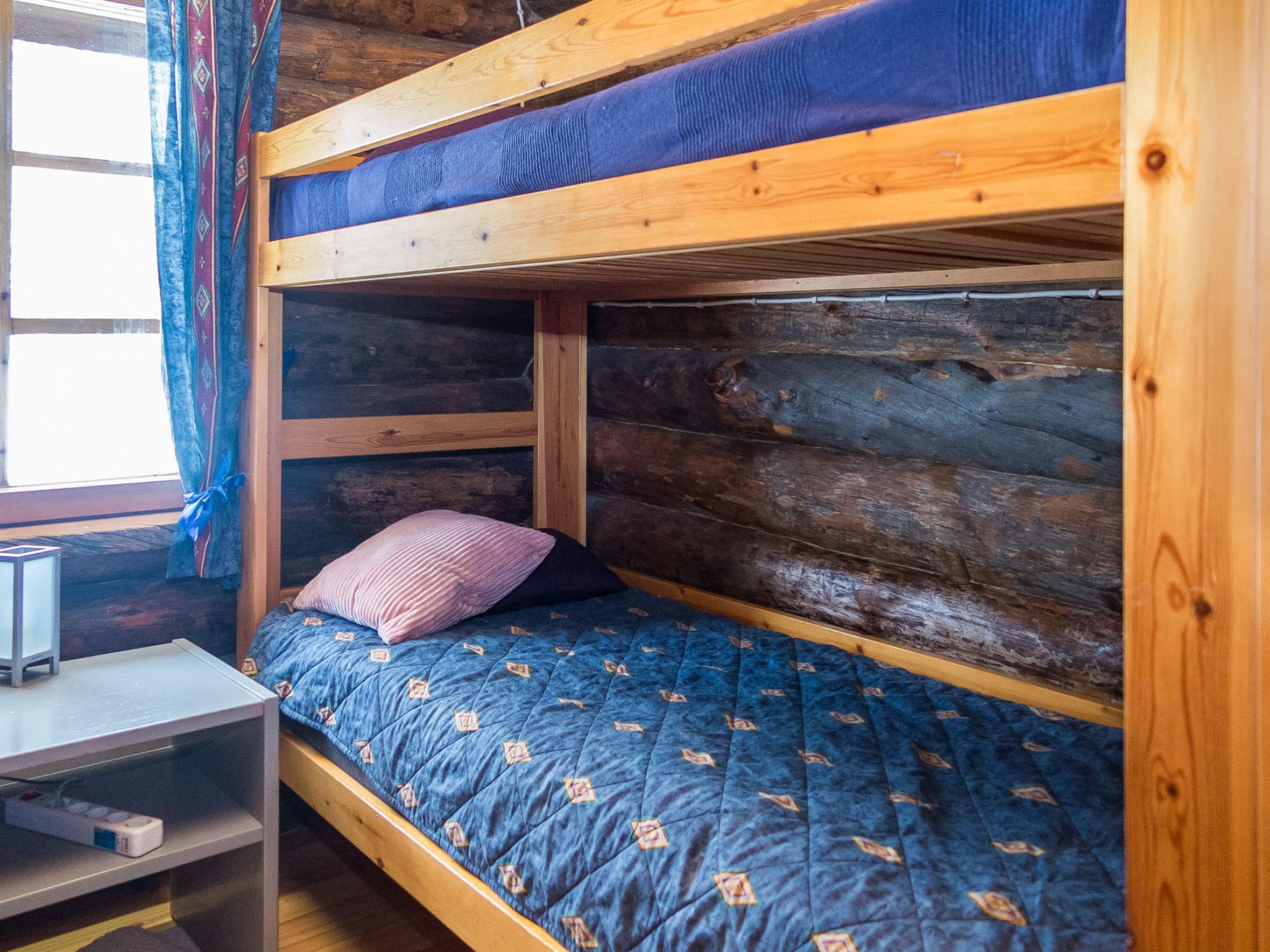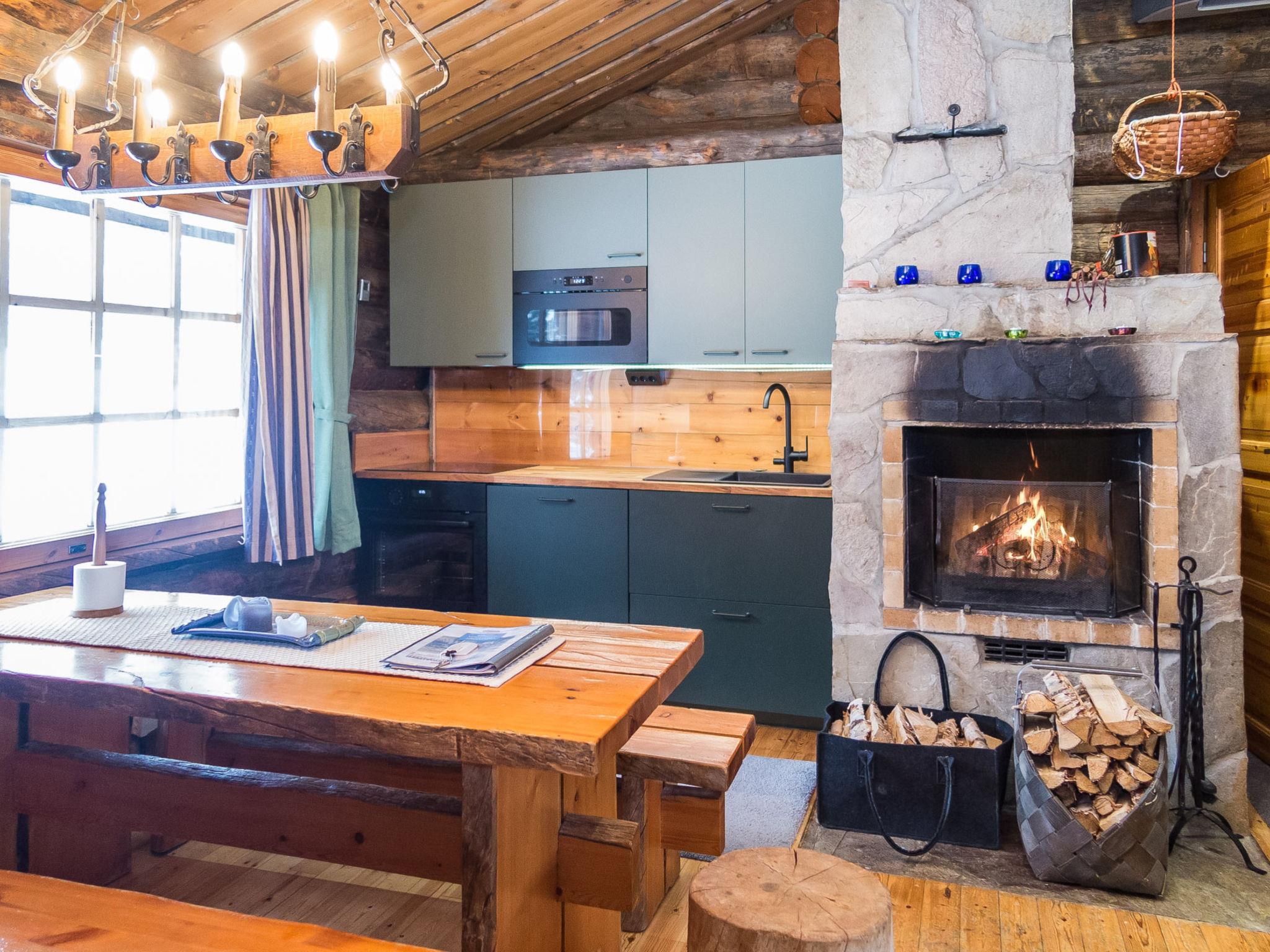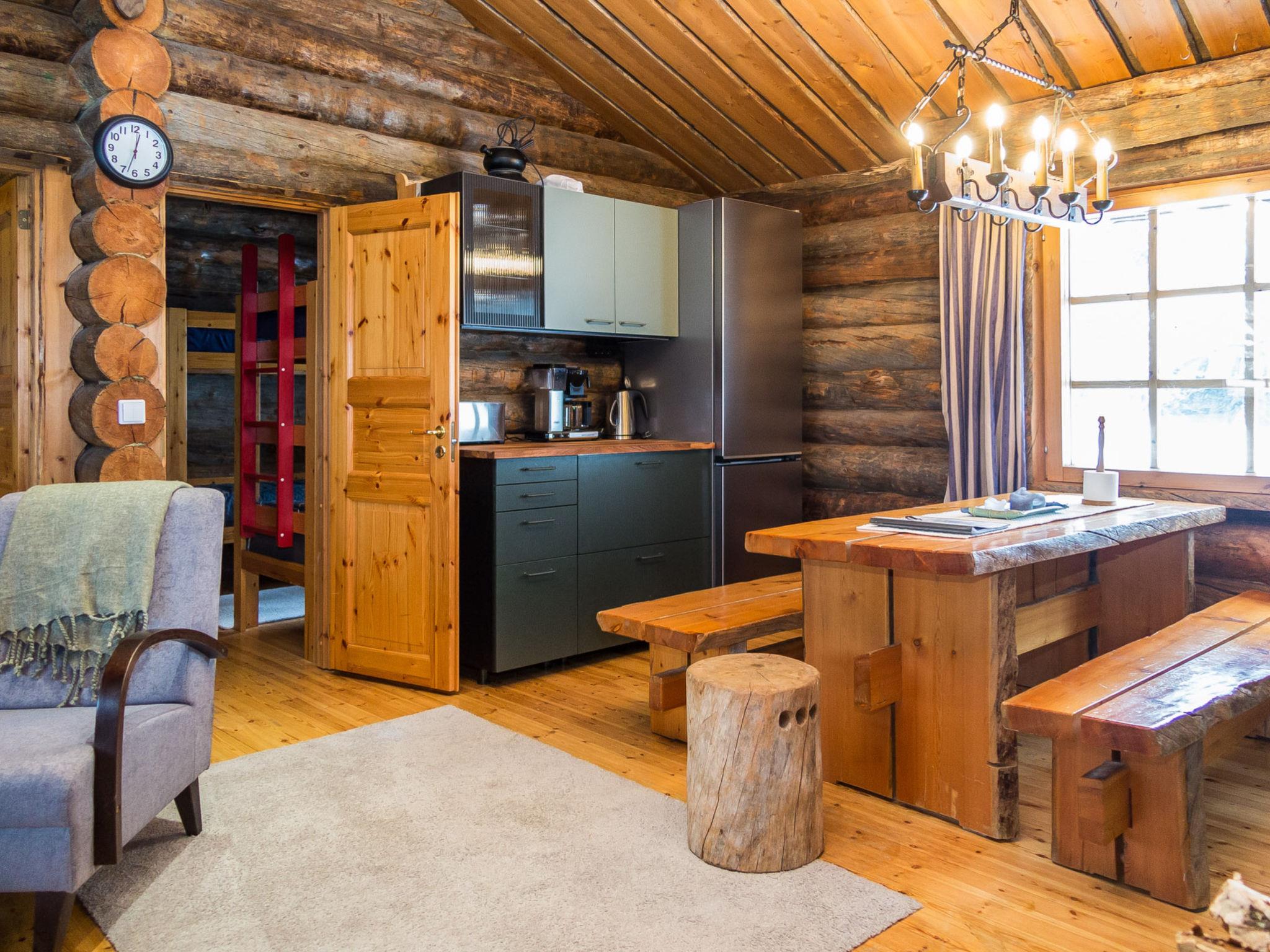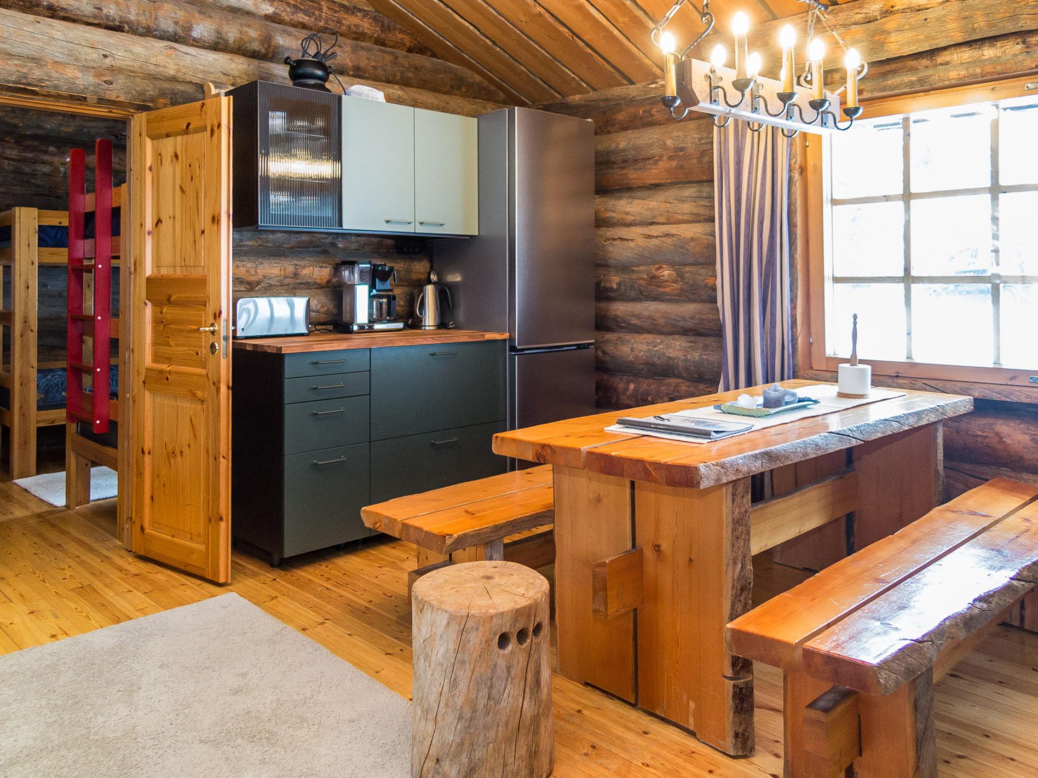 The cabin features a spacious combined kitchen/living room with a large dining table for eight. There are three bedrooms: the first bedroom has a double bed, the second has two bunk beds, and a small sleeping alcove also contains a bunk bed (width 70 cm, length 200 cm). The heart of the combined kitchen/living room is an open fireplace, with firewood included in the rental.
