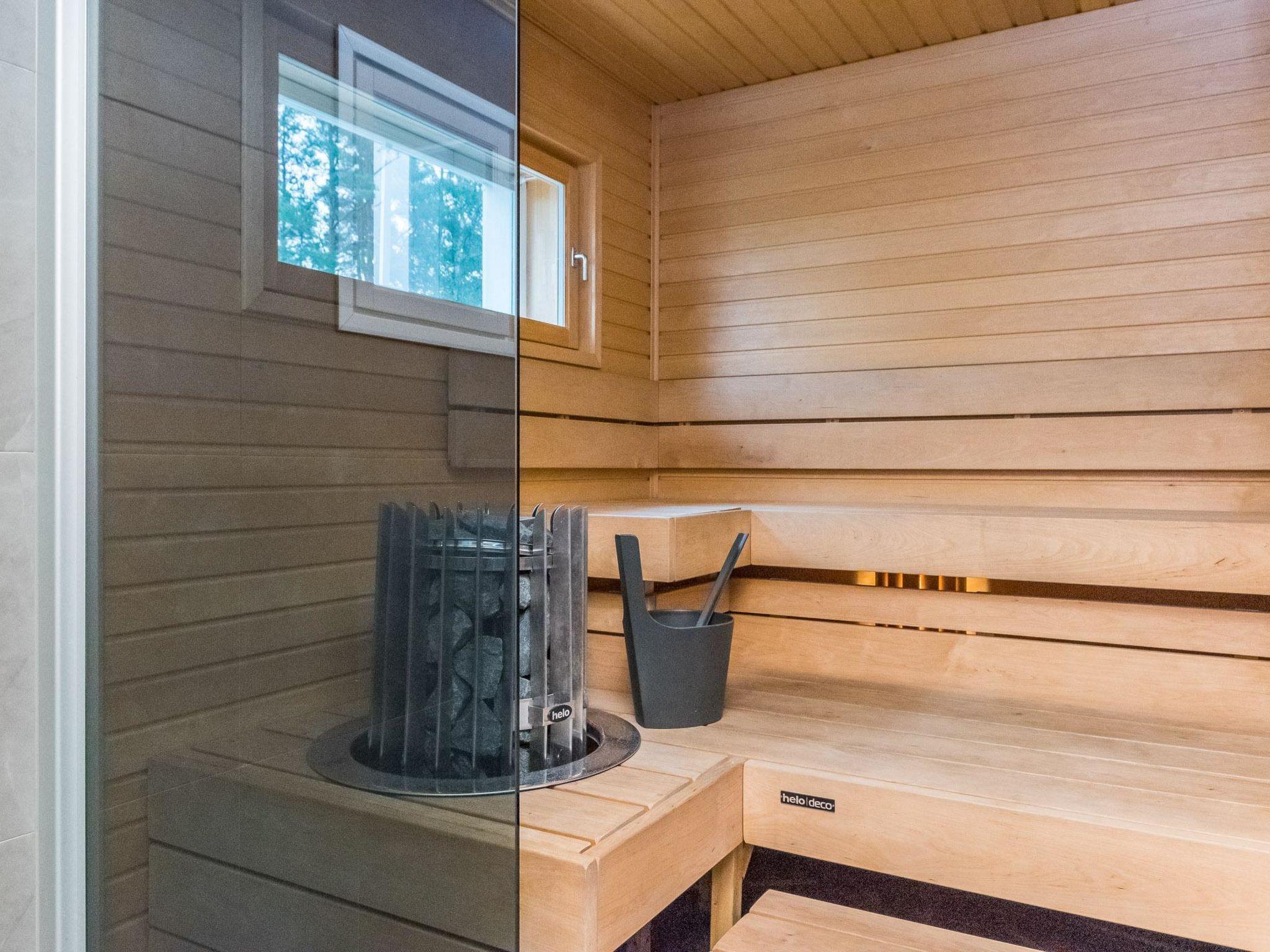 The separate wooden heated beach sauna (completely renovated and expanded in 2020) has an atmospheric sauna room with an unobstructed view directly to the sea. The distance from the sauna to the sea is approx. 20 m. In the sauna building, there is a separate toilet, a shower in the sauna and underfloor heating throughout the entire ground floor. Sound system for listening to music in the sauna room and outside the sauna building. In front of the saun is a terrace. In connection with the beach sauna, there is a separate dressing room/bedroom. Upstairs there are three beds.
