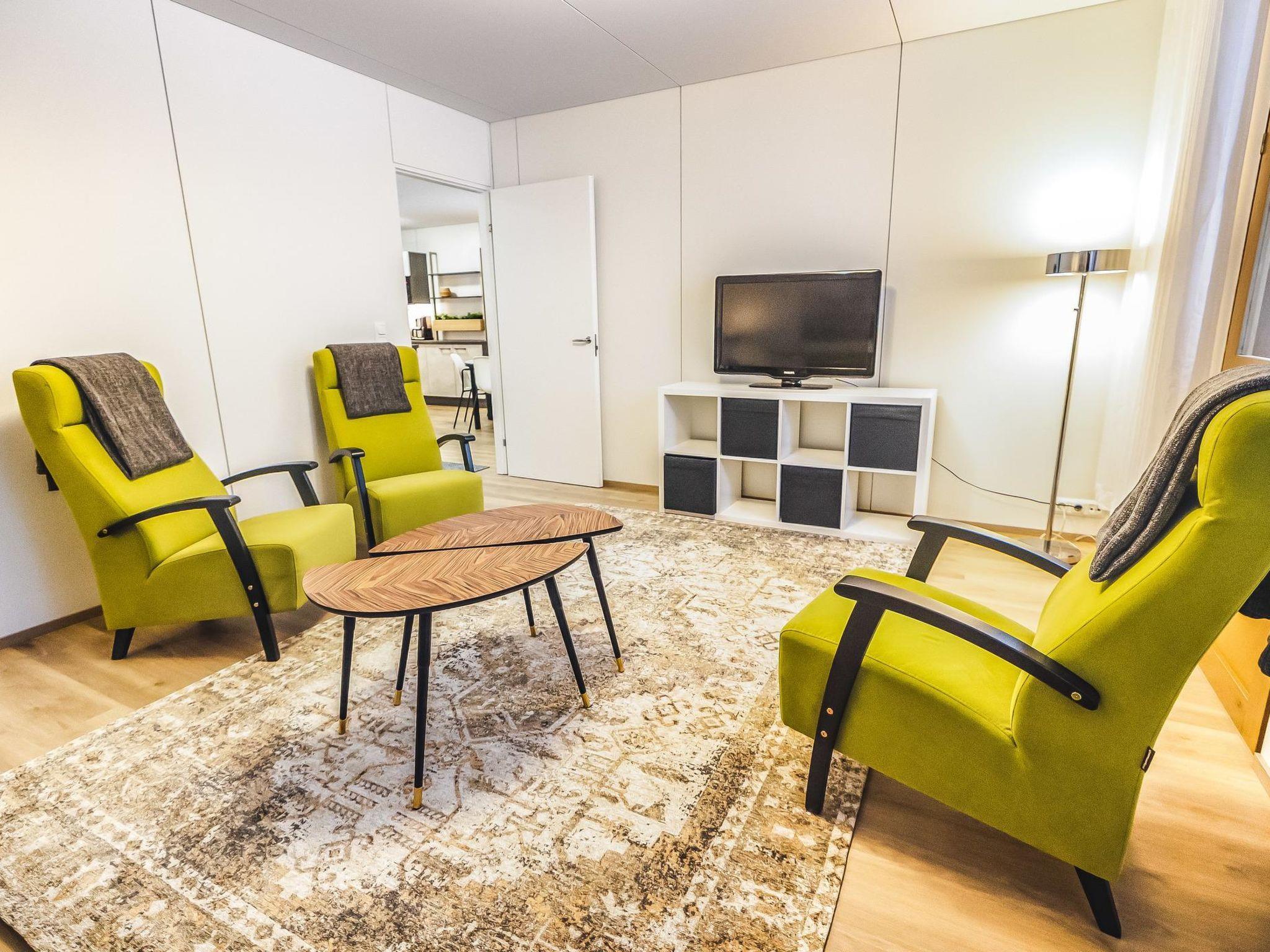 Apartment in wood-built row house, house is built in 1980 and renovated in 2022. Apartment has kitchen, living room, 2 bedrooms with 2 beds in each, washroom with shower, WC and terrace.