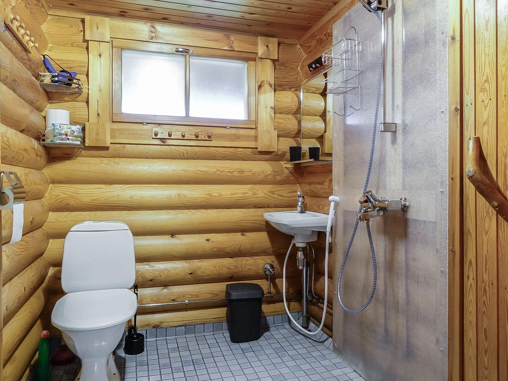 Round log cabin, built in 1992. Living room/kitchen, double bed in alcove, two mattresses in the loft, steep stairs to the loft, sauna, washroom/WC and covered porch.