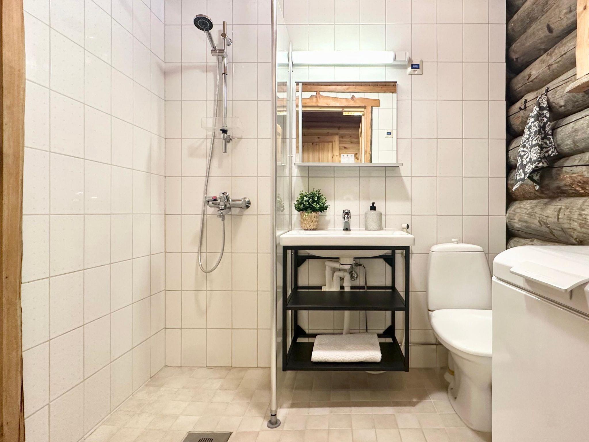 Apartment built in 1990, kitchen-living room with a fireplace, double bed and wardrobes in the bedroom. Steep stairs to the loft, with mattresses / beds for 2. Sauna with electric stove, washroom/toilet, covered terrace and storage.