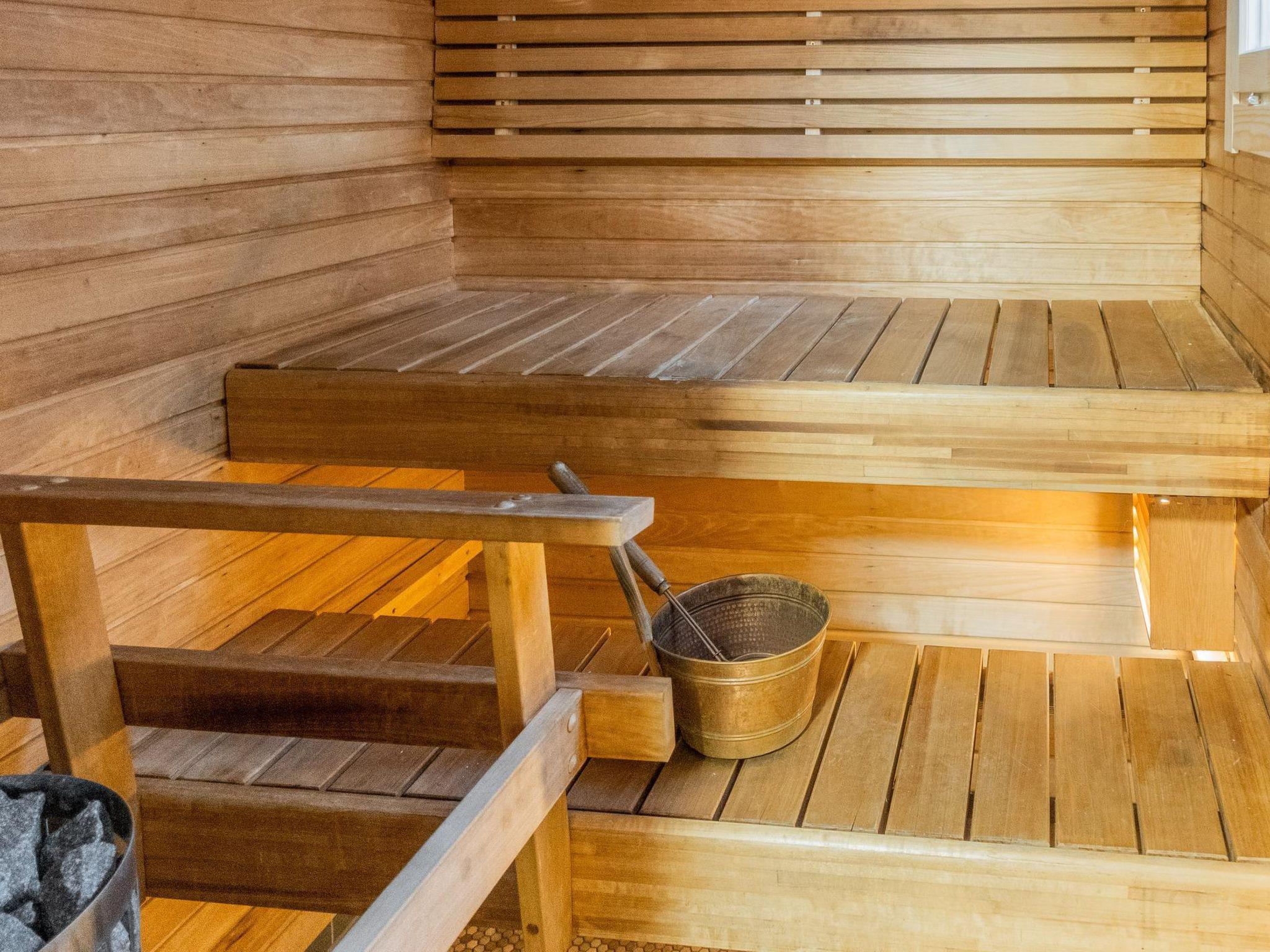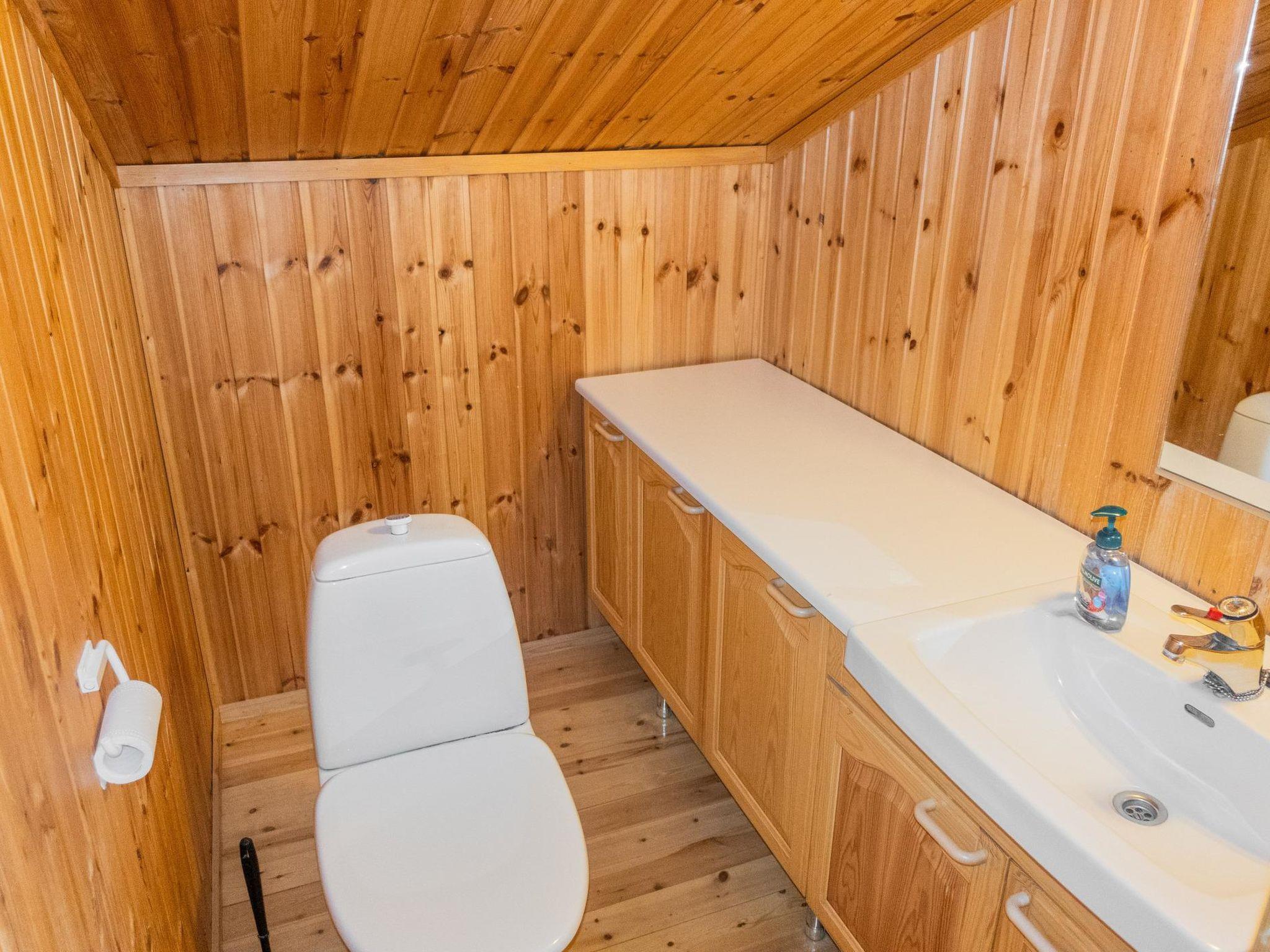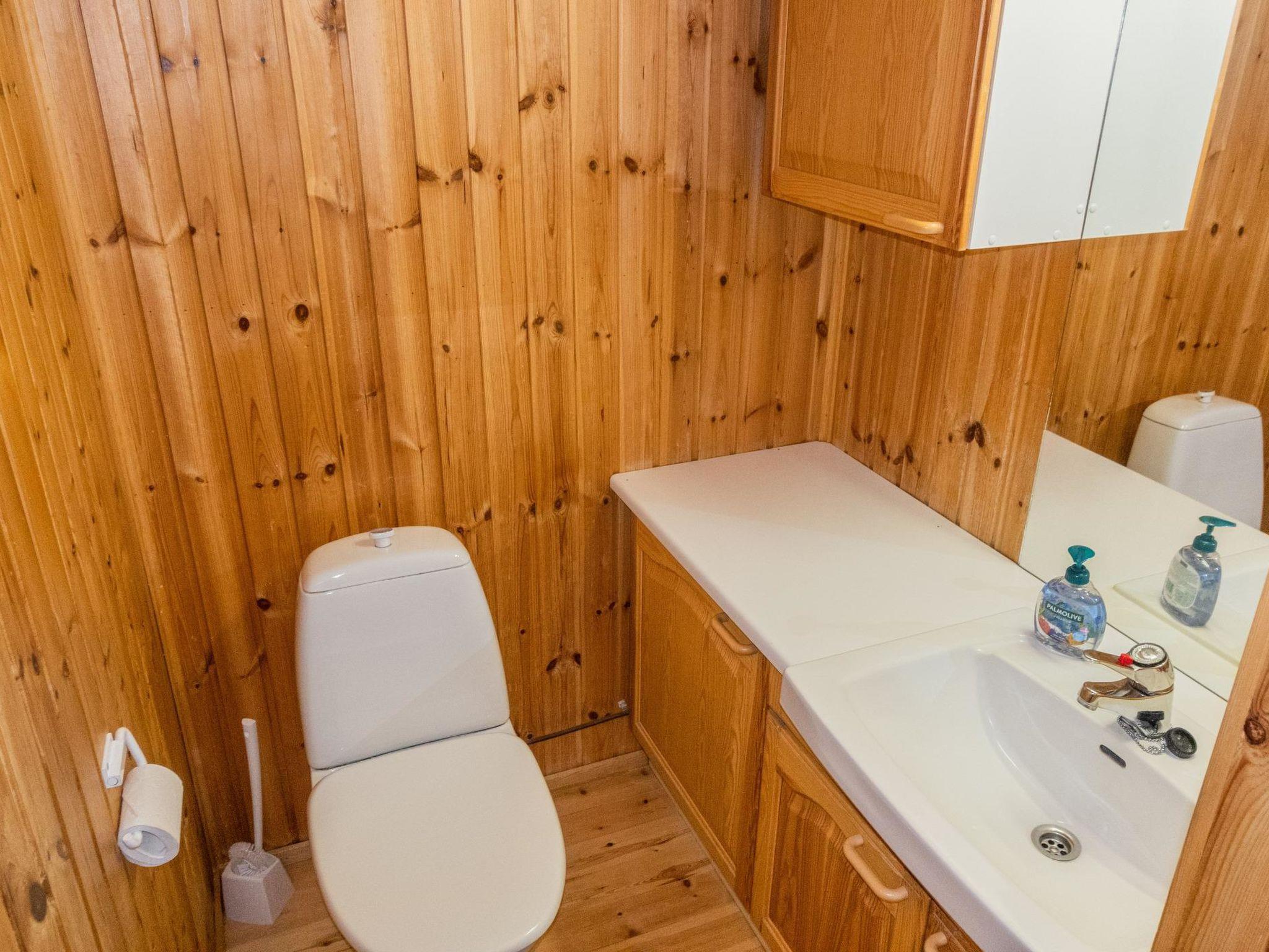 The ground floor comprises a living room and kitchen, creating a cozy environment for togetherness. There are also two bedrooms on the ground floor: one with a double bed and the other with a bunk bed, where the lower bed is 120 cm wide. Additionally, the ground floor features a sauna, a bathroom, a utility room/dressing area, and a covered terrace for outdoor enjoyment. There's a walk-in closet attached to one bedroom, and another accessible from the hallway. The cabin has two separate WCs, one downstairs and another upstairs.