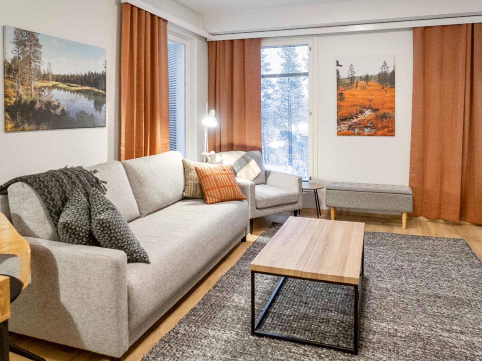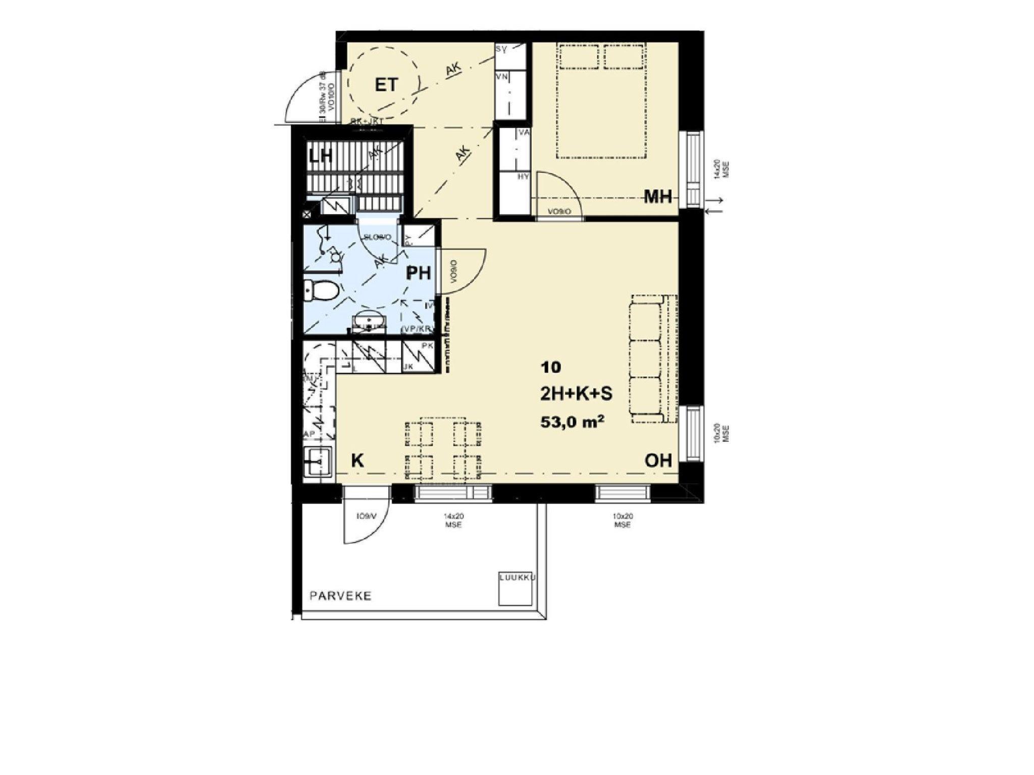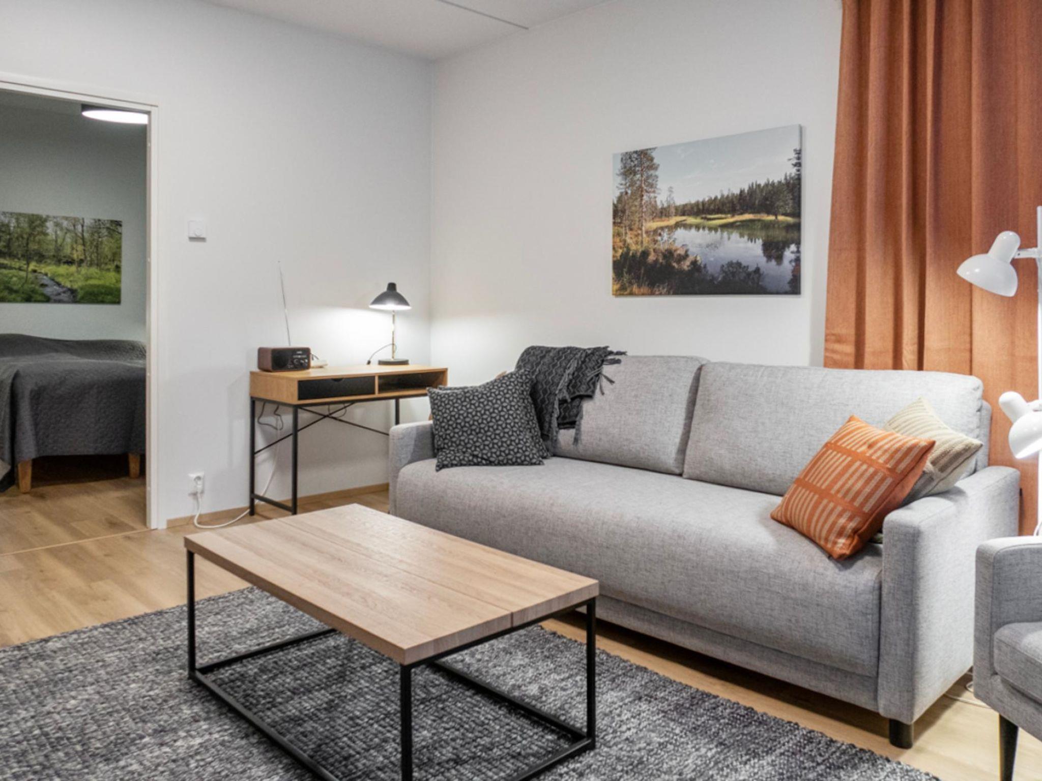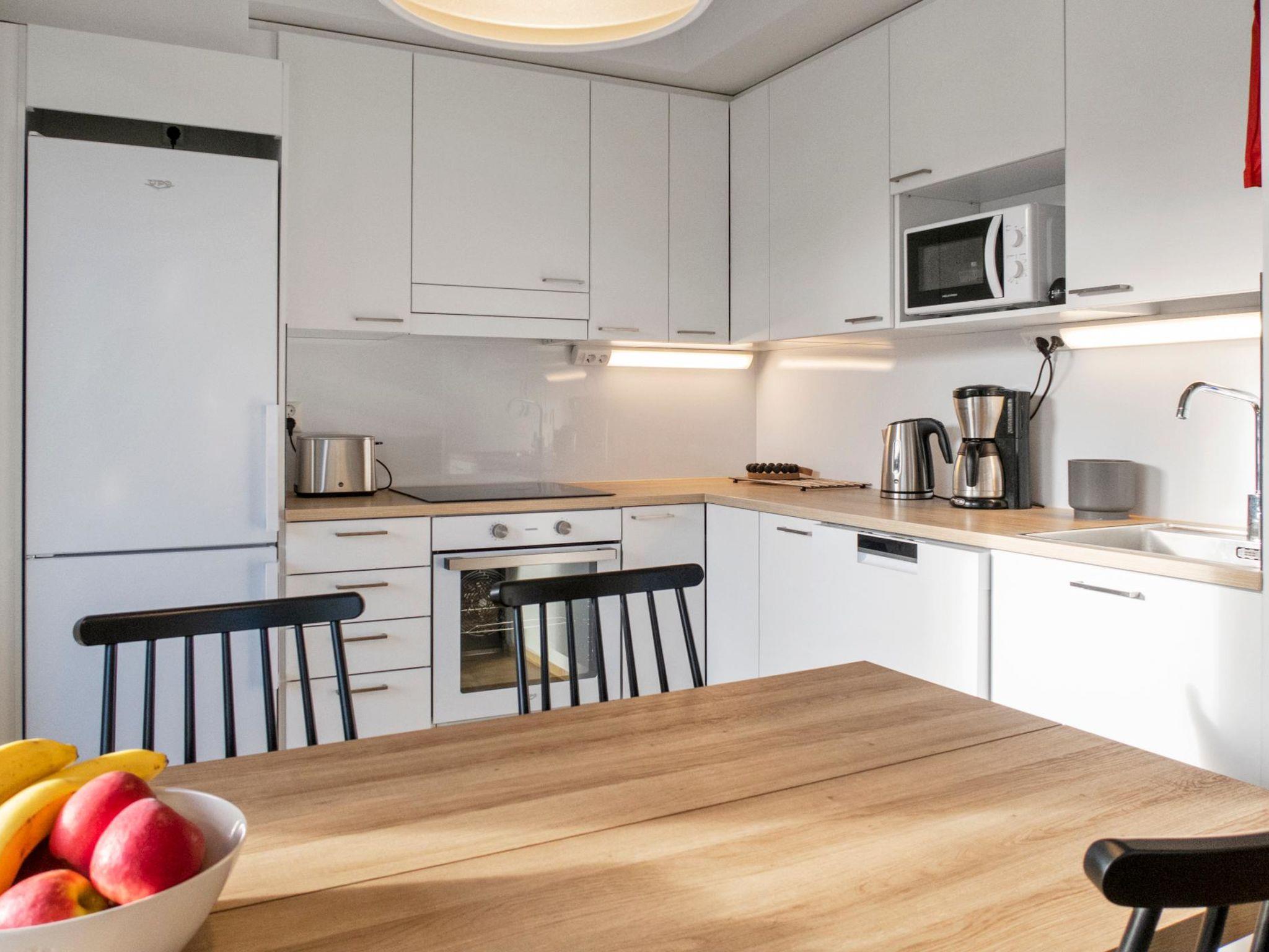 Total area is 53 m², bright living room/kitchen with lake view, spacious windows, dining group for 4 and working desk for remote working. Spreadable sofa bed in the living area, width 160 m, for 2 people. Spacious bedroom with double bed and wardrobes.