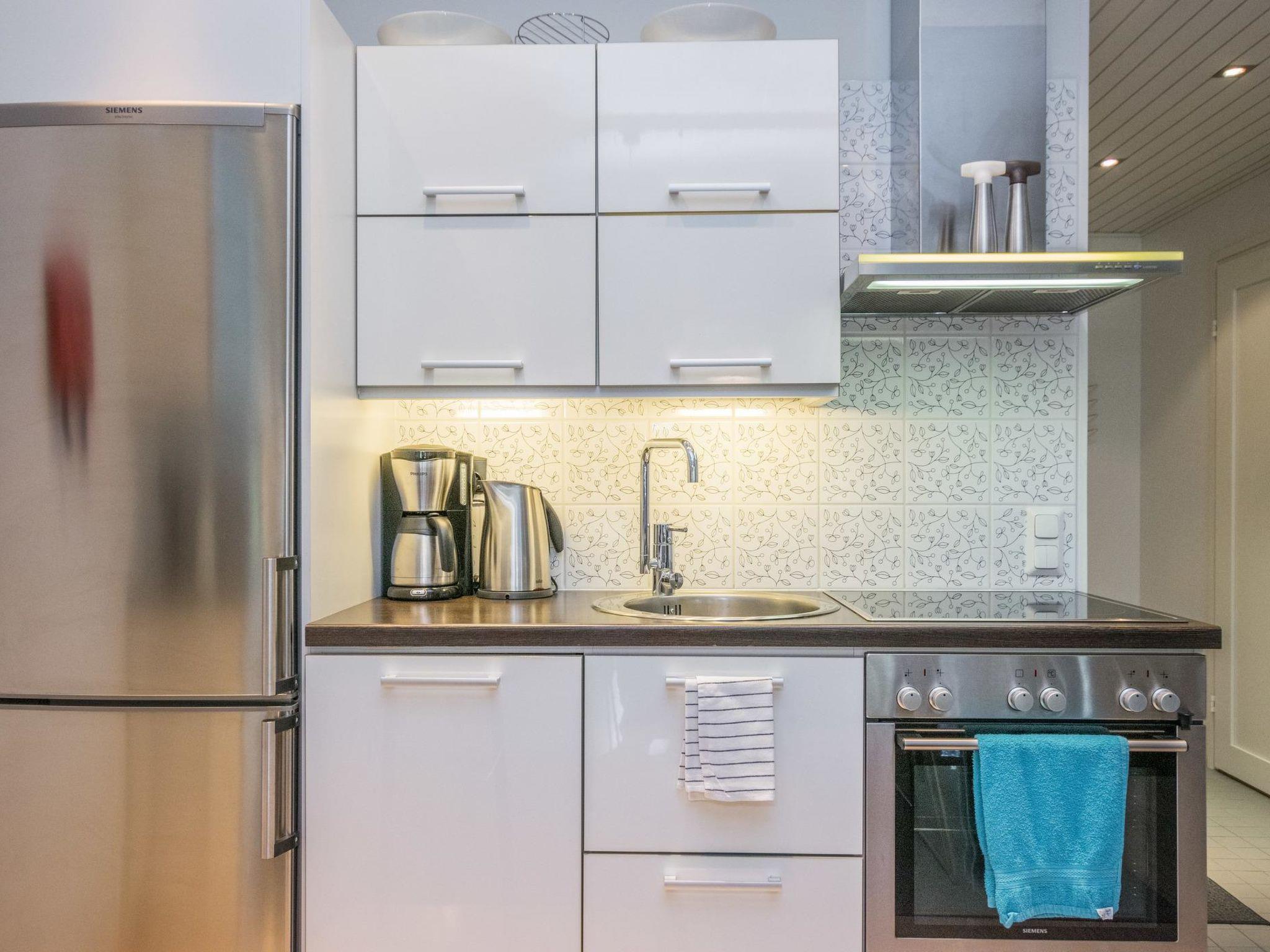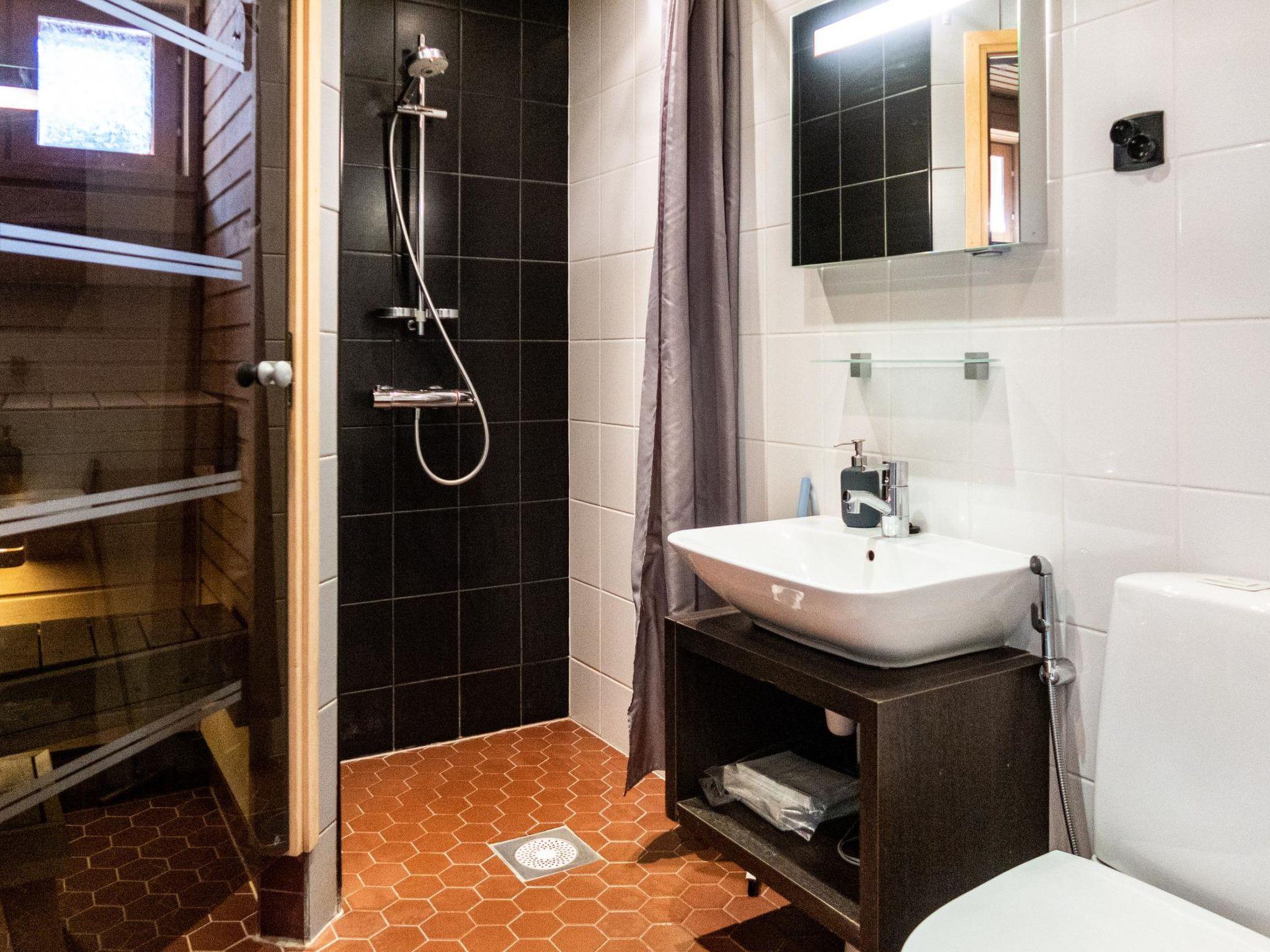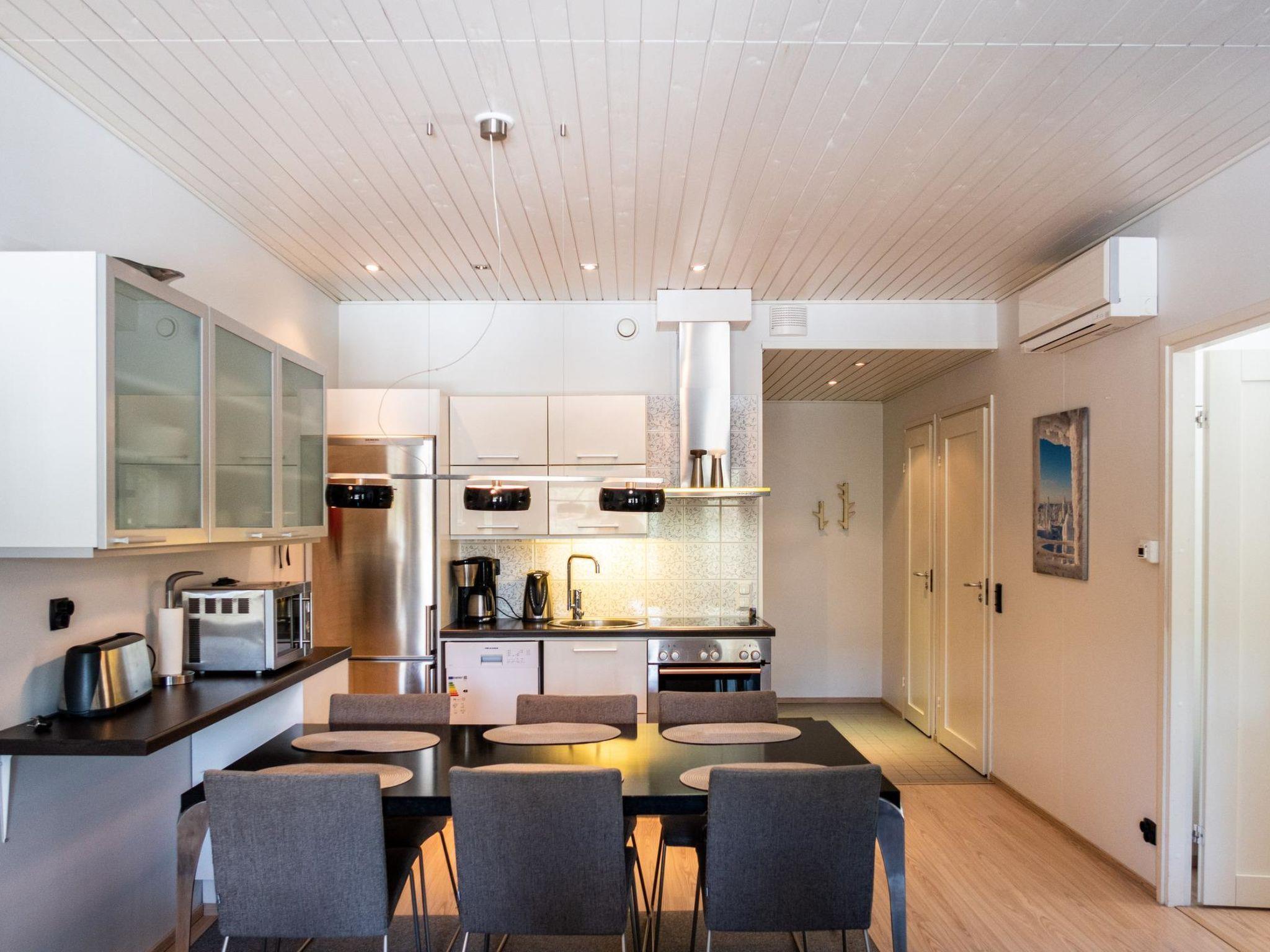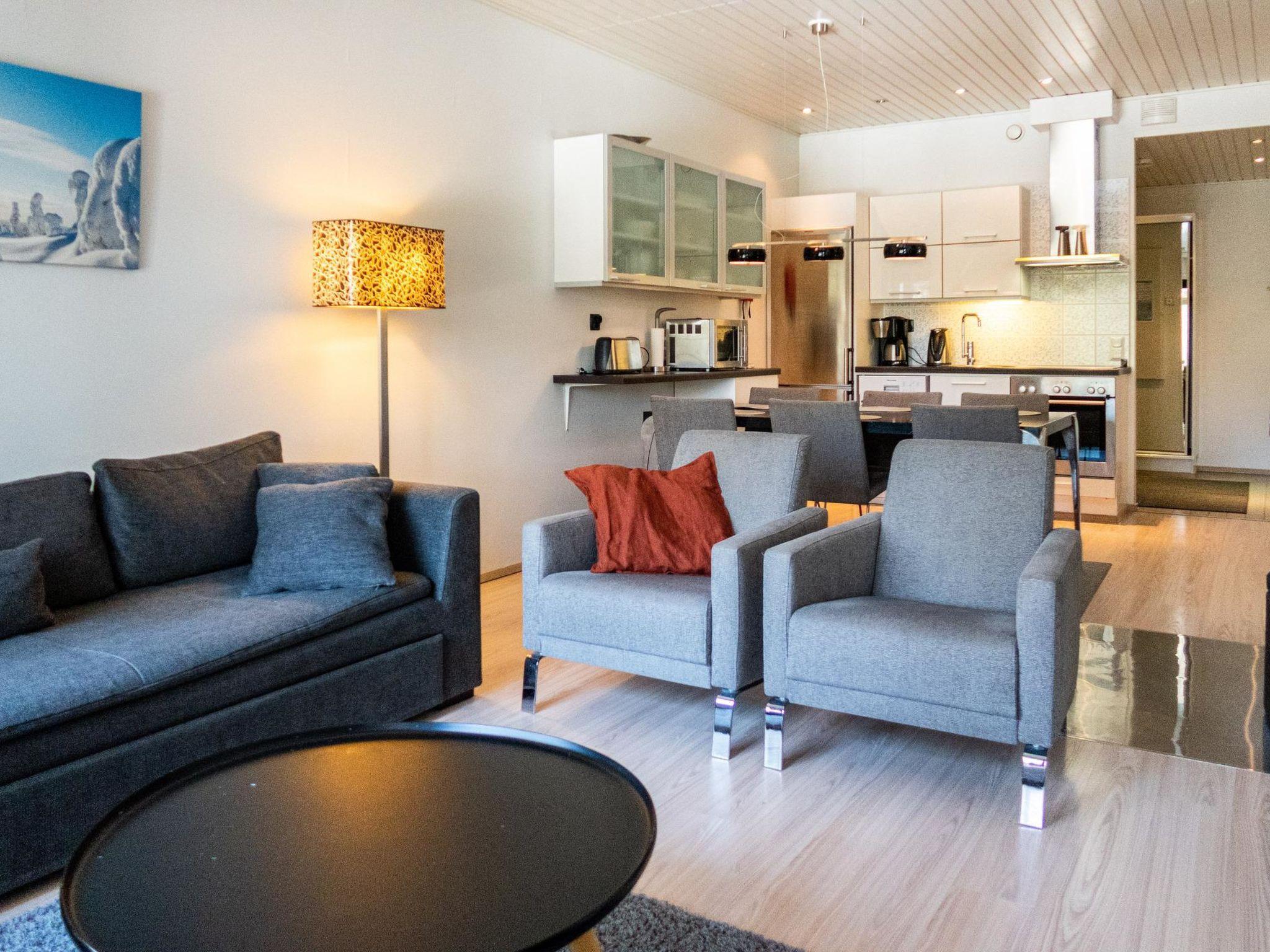 A cozy holiday apartment built in -08 in a two-story cabin house located in the center of Vuokatti. The apartment is located on the lower floor (stairs to the down). The area of ??the apartment is 62 m² on one level - a kitchen-living room with a sofa bed for 1-2 guests, a dining area for 6 and a light fireplace. Sleeping areas in two bedrooms, one with a double bed (180cm), and the other with separate beds for two (90cm). Sauna (electric stove), shower/toilet and separate toilet. Access to the balcony from the living room, with patio furniture for 4. The apartment has a view of the slopes of Vuokatti, facing the forest.