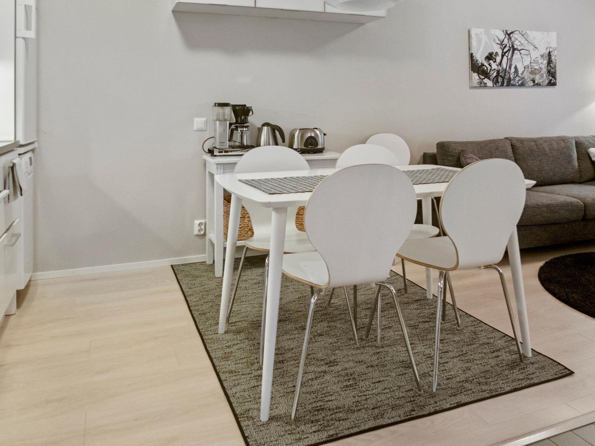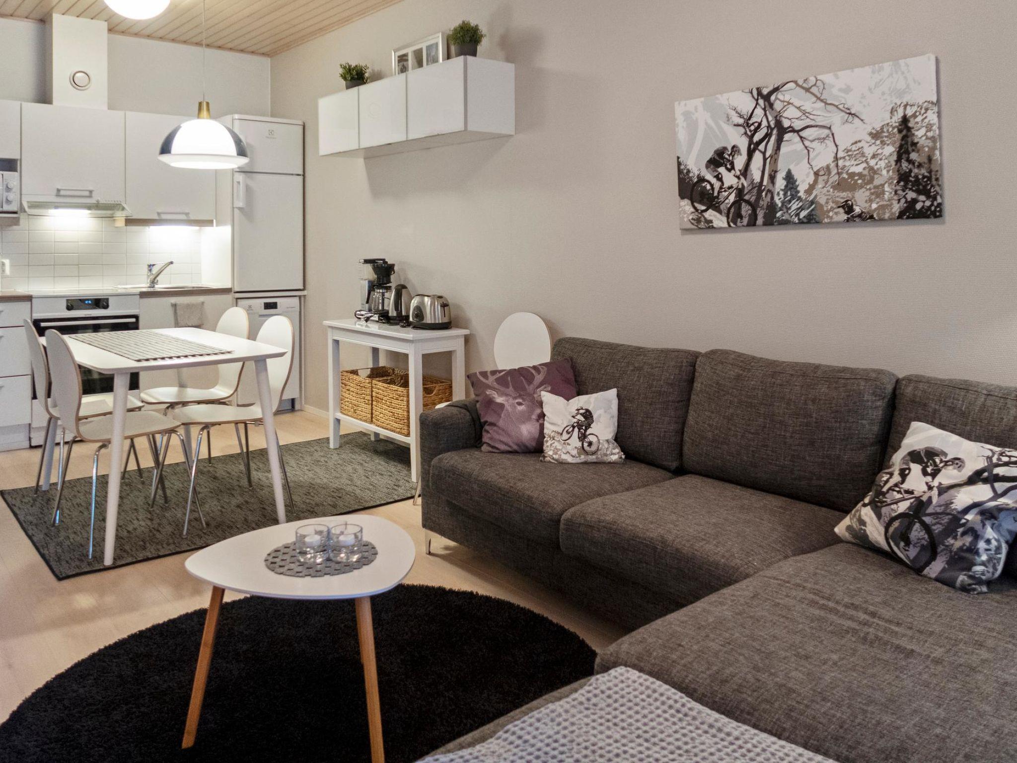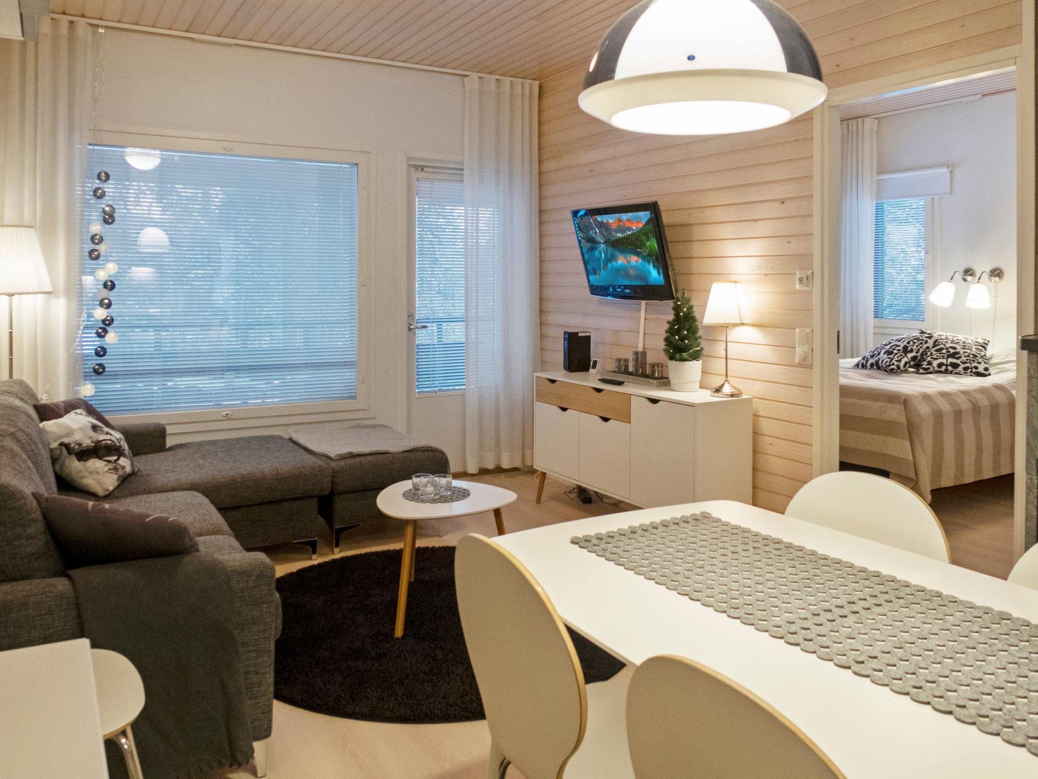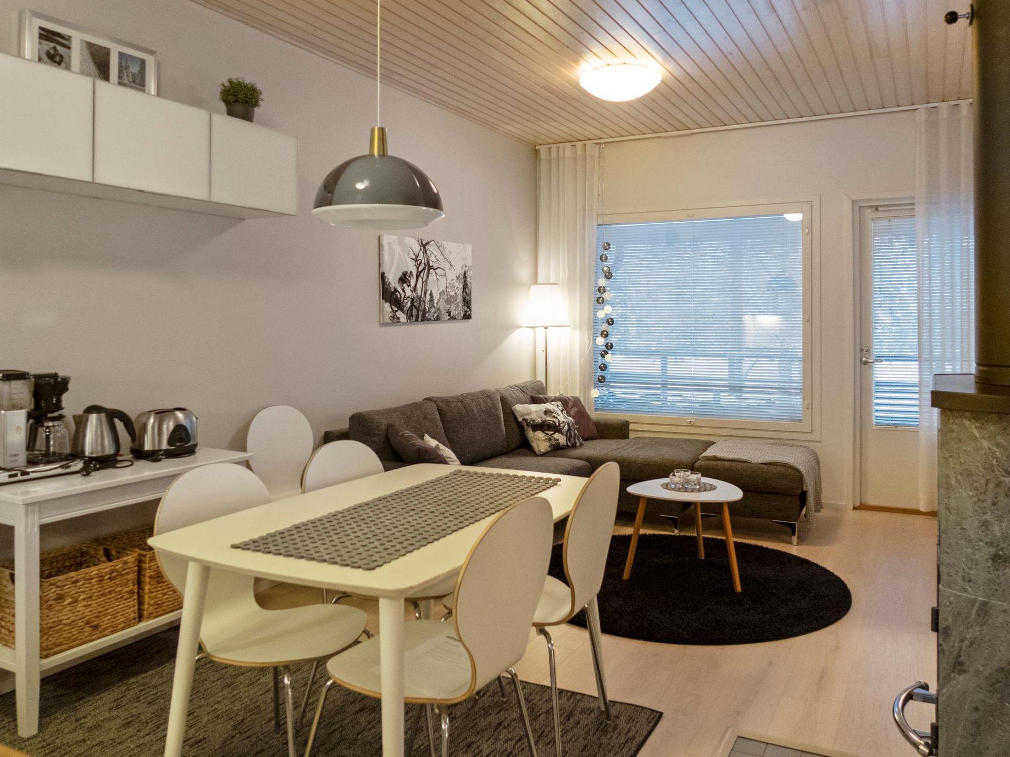 AINO apartment is 50 m² on one level. Bright living room/kitchen, windows and balcony facing the slopes of Vuokatti. Two bedrooms, one bedroom has a double bed and the other has separate beds for two. Washroom/toilet, sauna (electric stove). Balcony with furniture for 4 and a gas grill in use during the summer season.