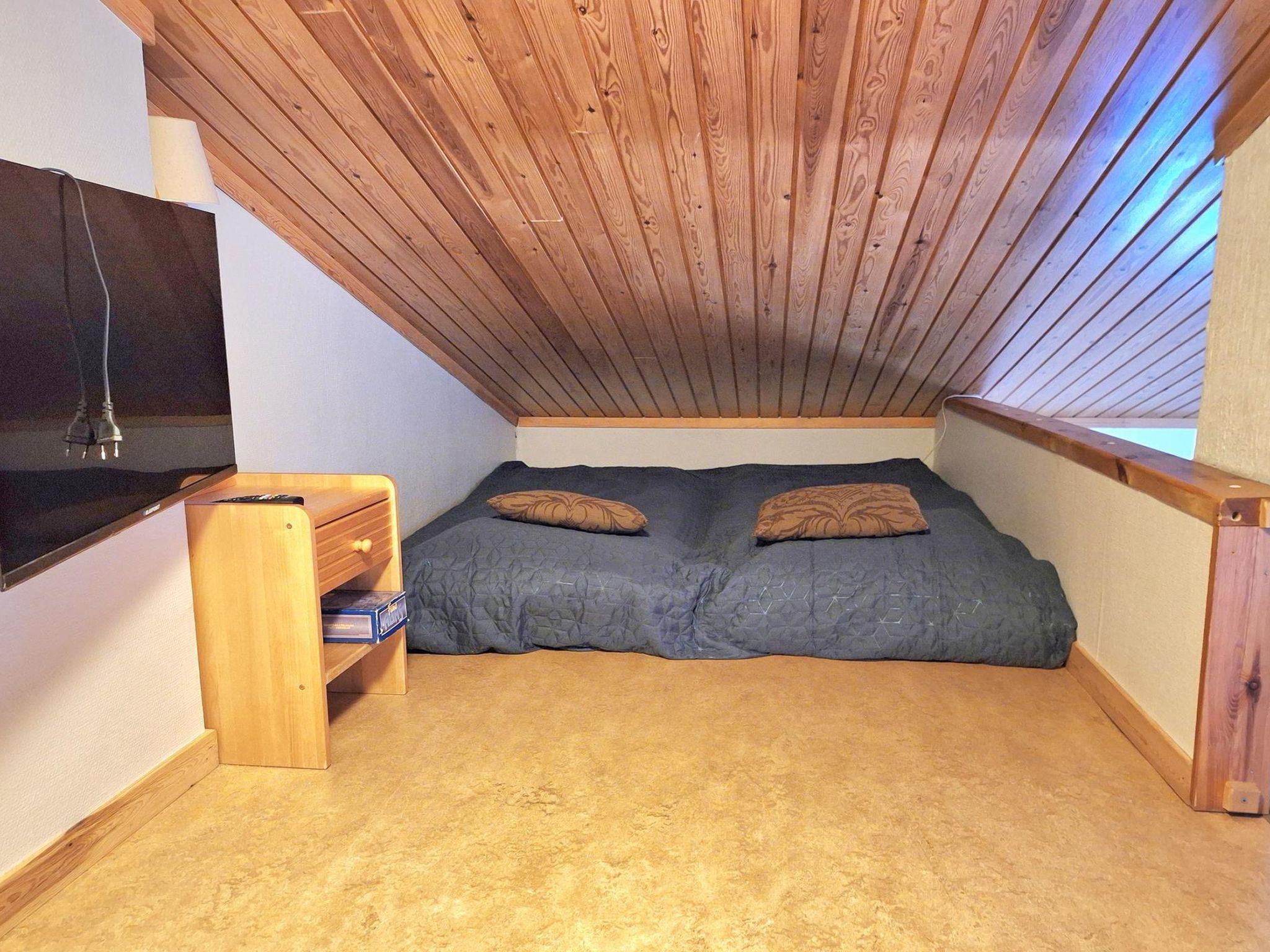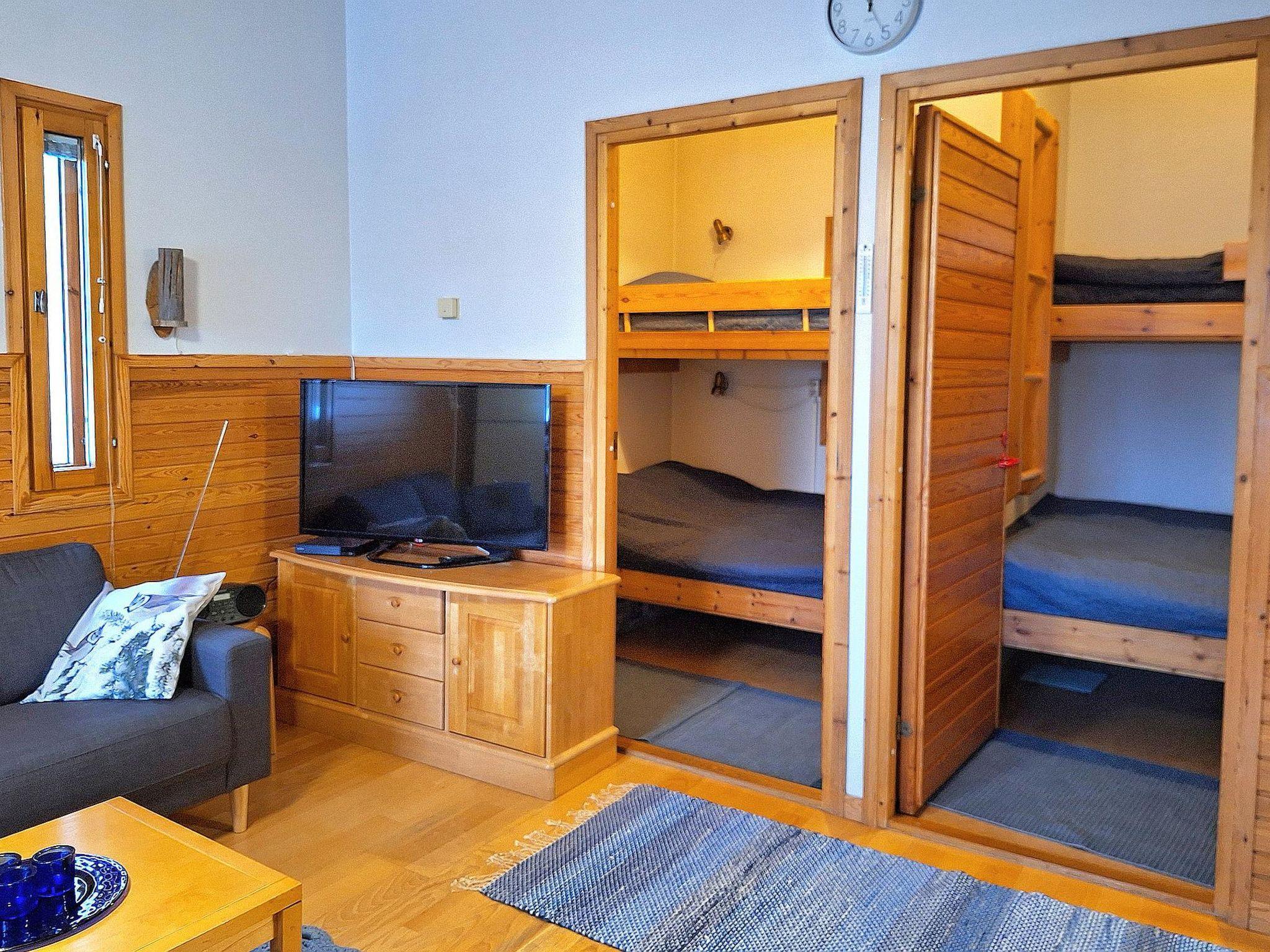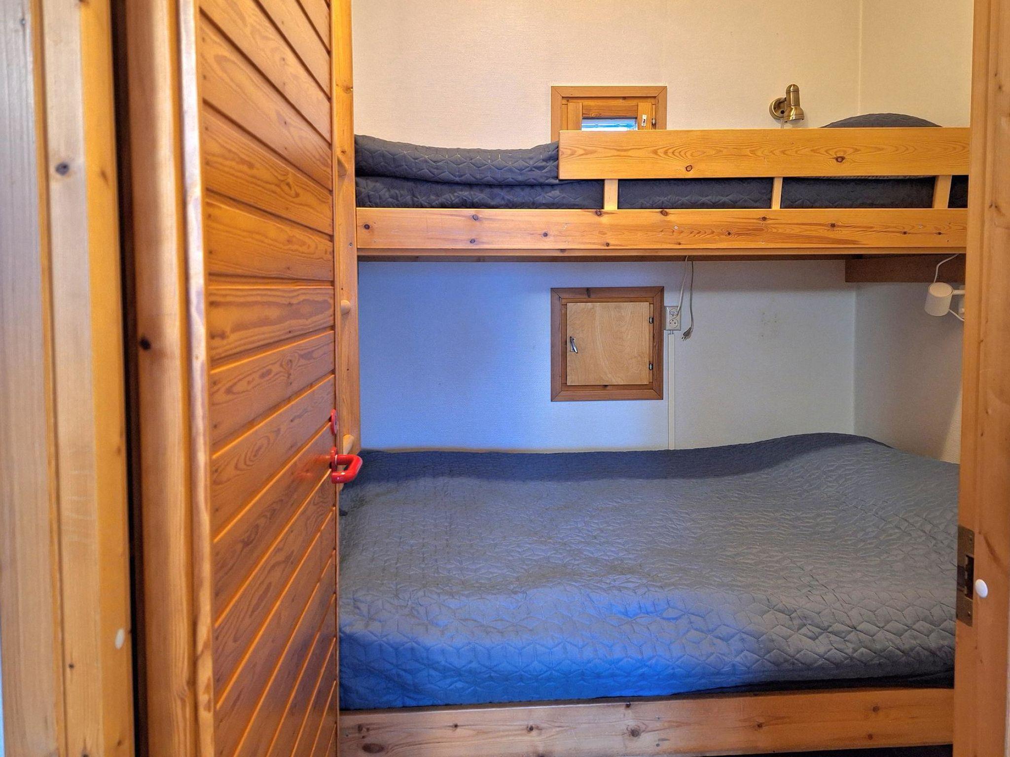 Indoors, there's an open living room/kitchen, perfect for spending time together. Two bedrooms offer space for 4-6 people, each with bunk beds, where the lower bed is 160 cm wide. The closet in the second bedroom is not available to customers.