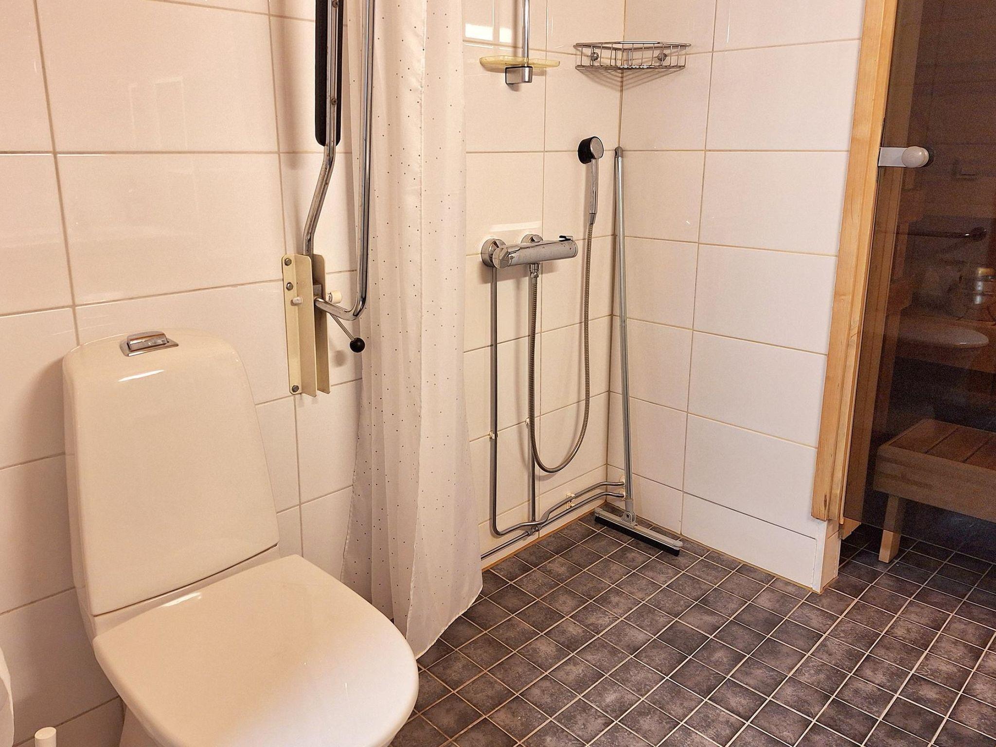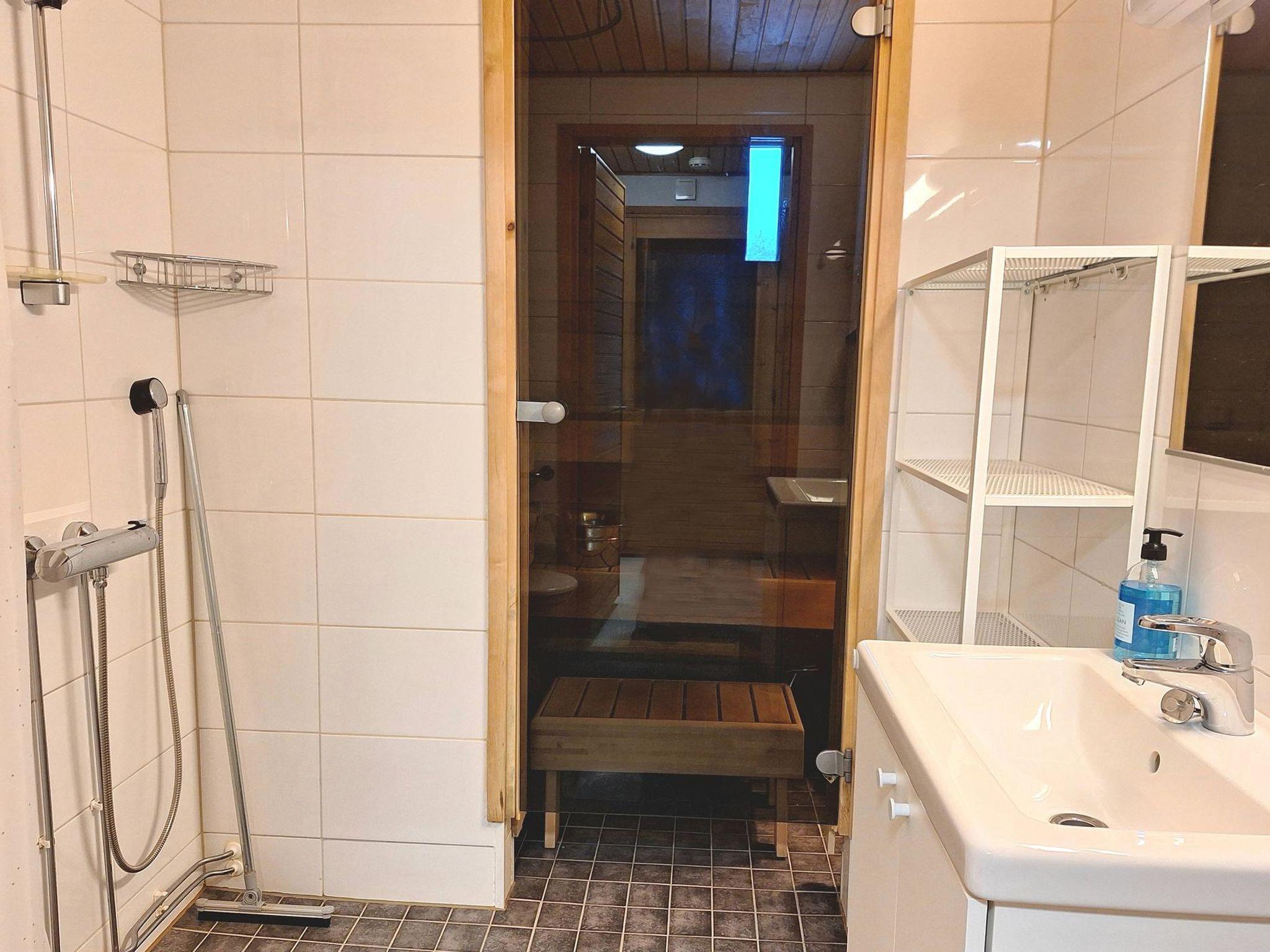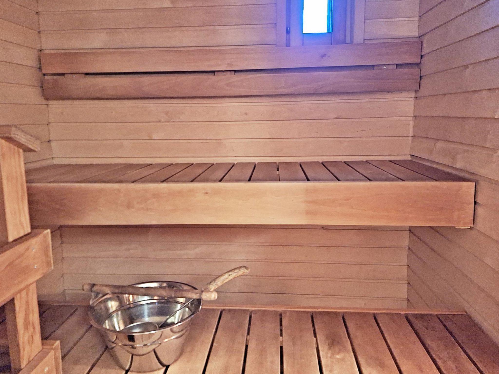 Additionally, there's a sauna, a shower room/ WC, and a loft with two mattresses. However, it's important to note that the stairs leading to the loft are very steep.