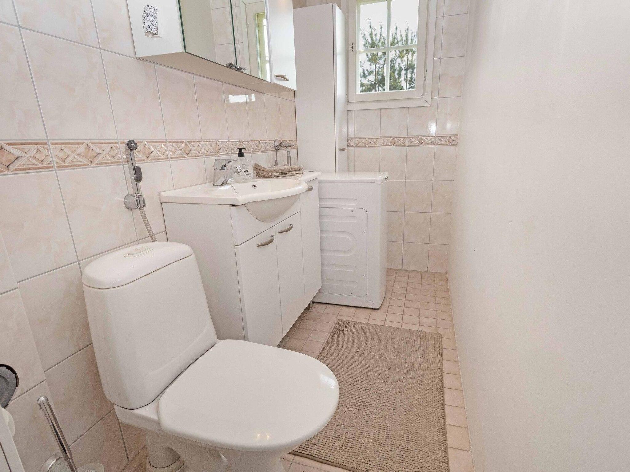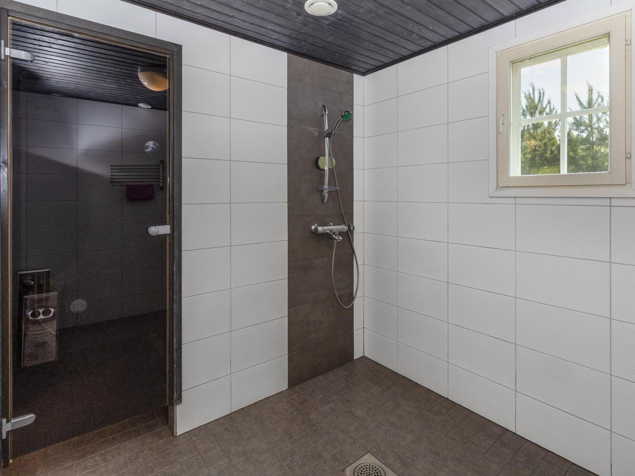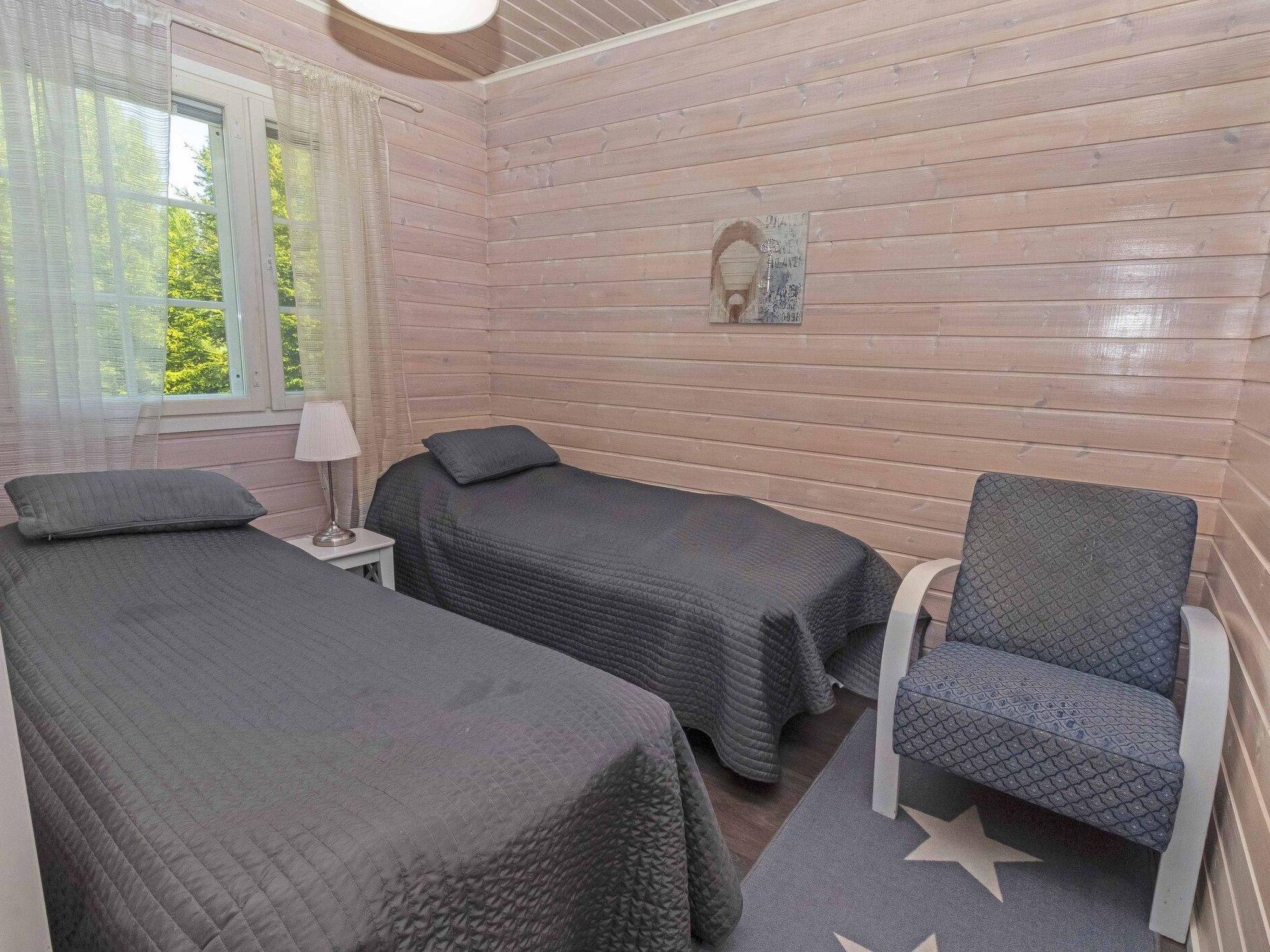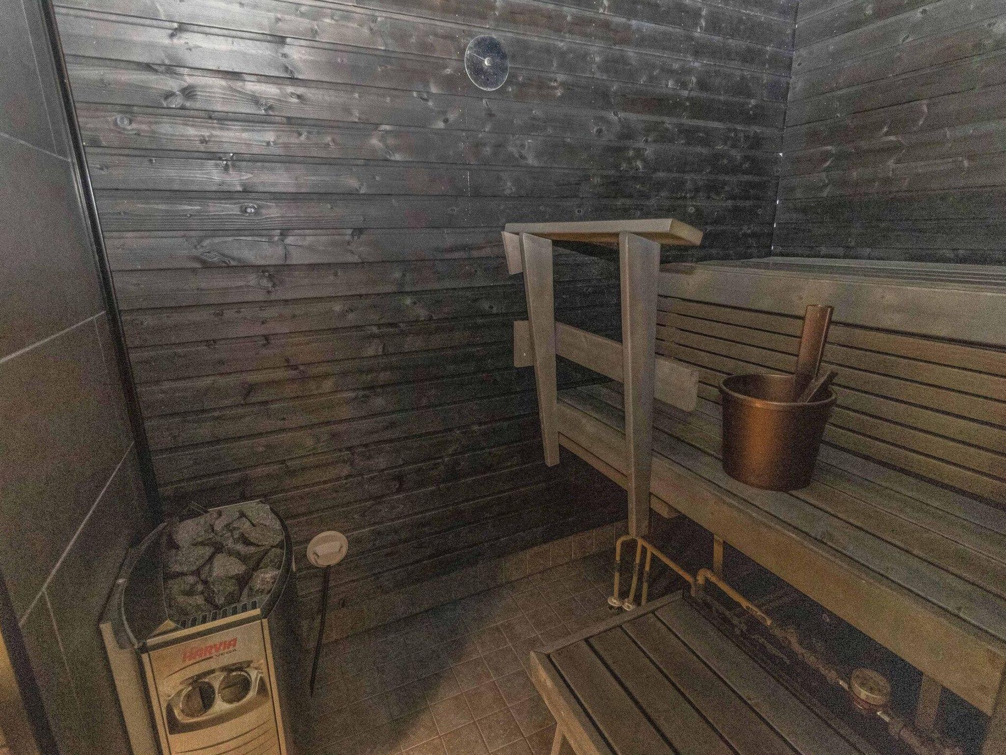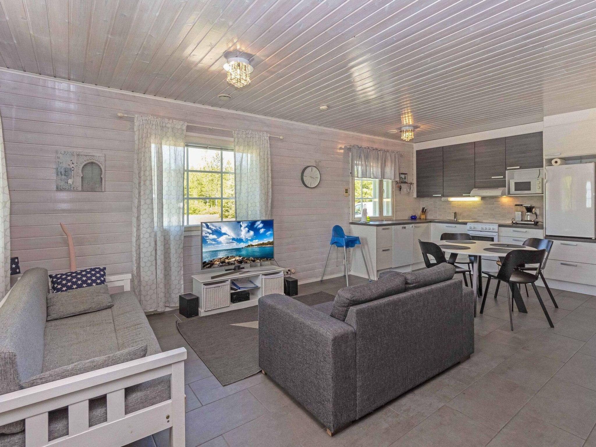 The cabin features a living room, open-plan kitchen, and one bedroom with two 80 cm wide beds, plus a sofa bed (140 cm) in the living room. The bathroom has an electric sauna, and there is also a separate WC.
