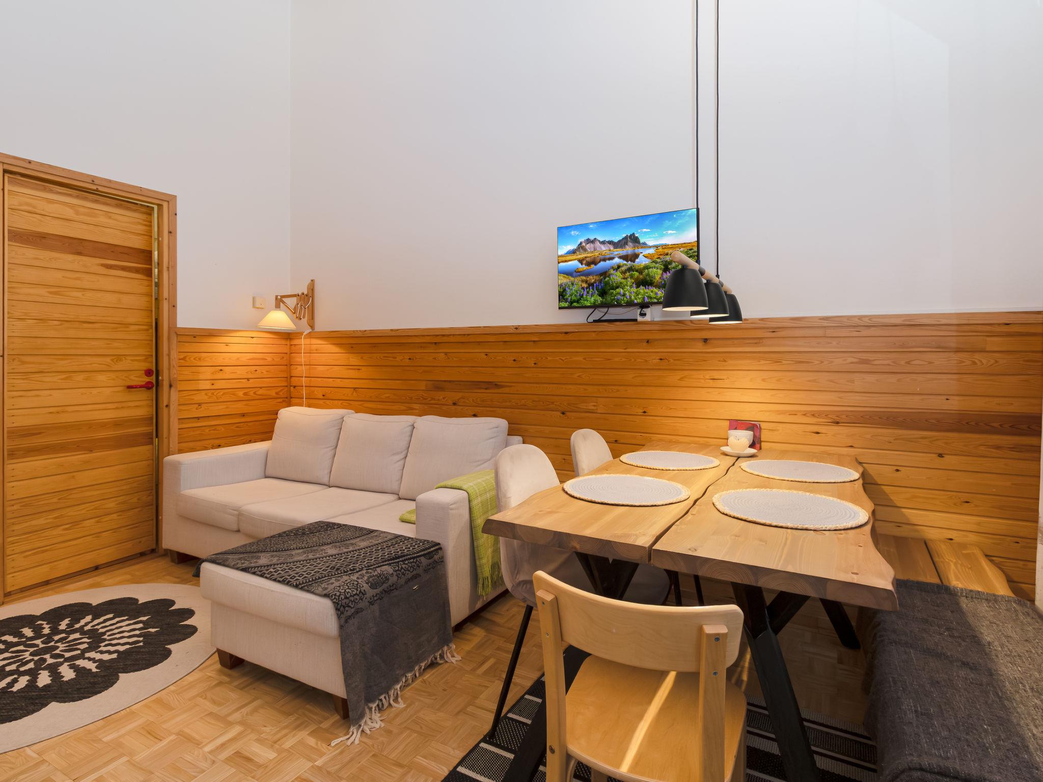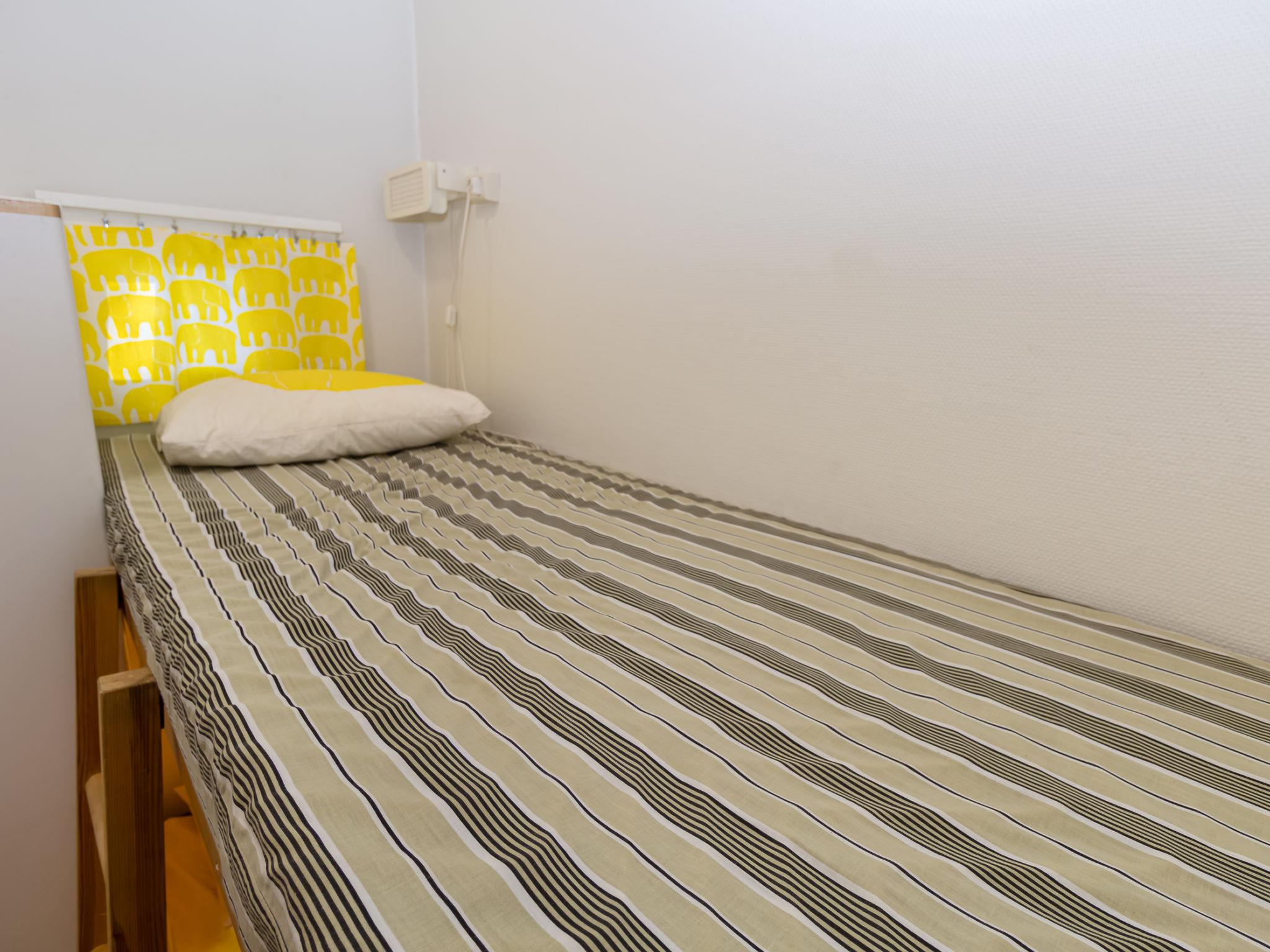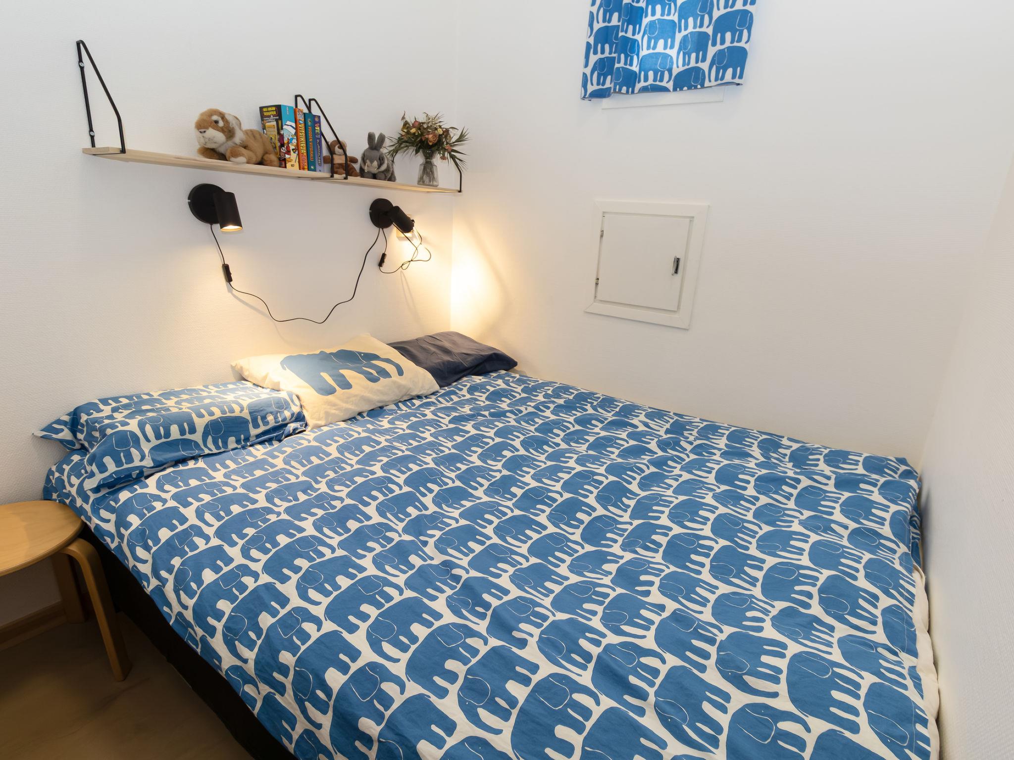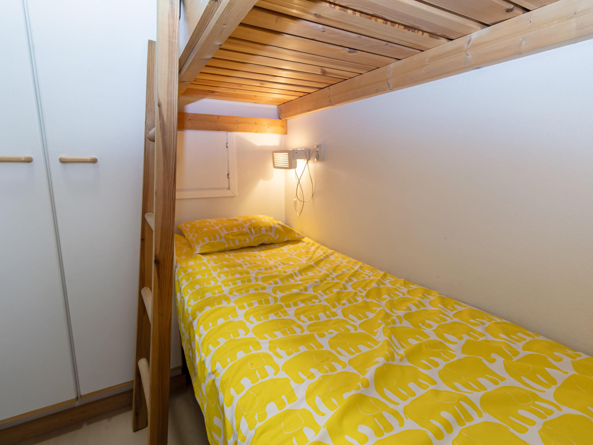 Everything is conveniently located on the same level. The bright combined kitchen/living room is a pleasant place to spend the evening, with ample space for dining and relaxing. There are two bedrooms: one with a 160 cm wide double bed and the other with an 80 cm wide bunk bed. The living room has direct access to a terrace that spans the width of the apartment, inviting you for morning coffee or evening moments in nature. The lower level includes a washroom and an electric sauna, and there is a locked storage area outside for outdoor equipment. The low loft has mattresses and offers a private space, perfect for the youngest family members. Access to the loft is via steep stairs.