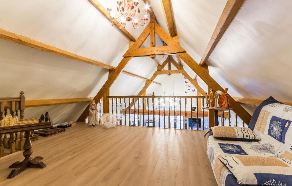 Detta hus kombinerar på ett harmoniskt sätt modern komfort och historisk charm. Synliga träbjälkar, stenelement och en imponerande öppen spis skapar en rustik känsla, där en färgglad soffa och ett modernt kök sätter vackra accenter. Luta dig tillbaka här med en kopp kaffe eller laga läckra måltider tillsammans innan du spelar biljard eller flipperspel.