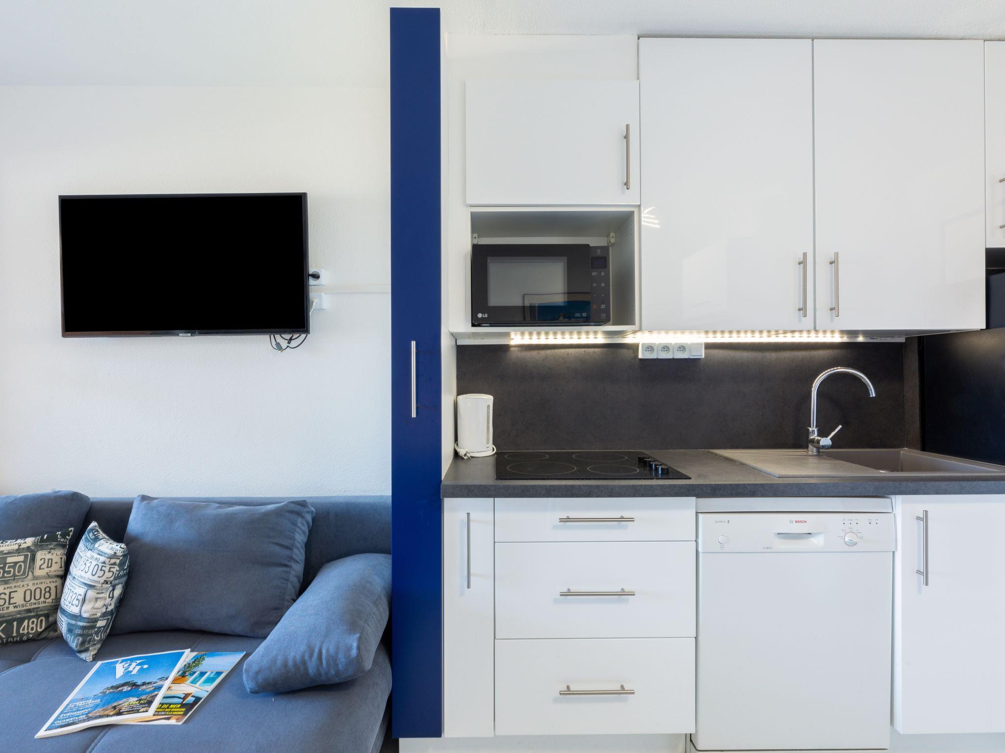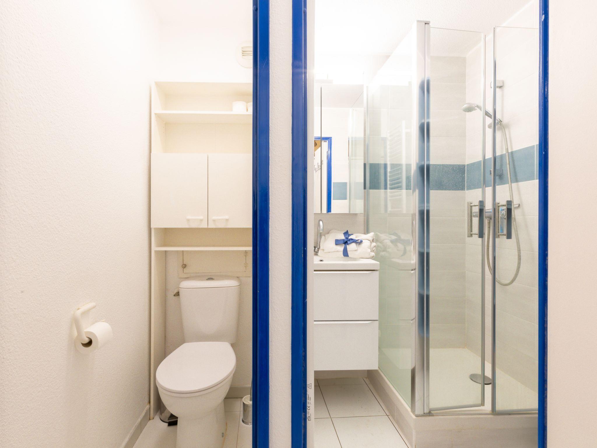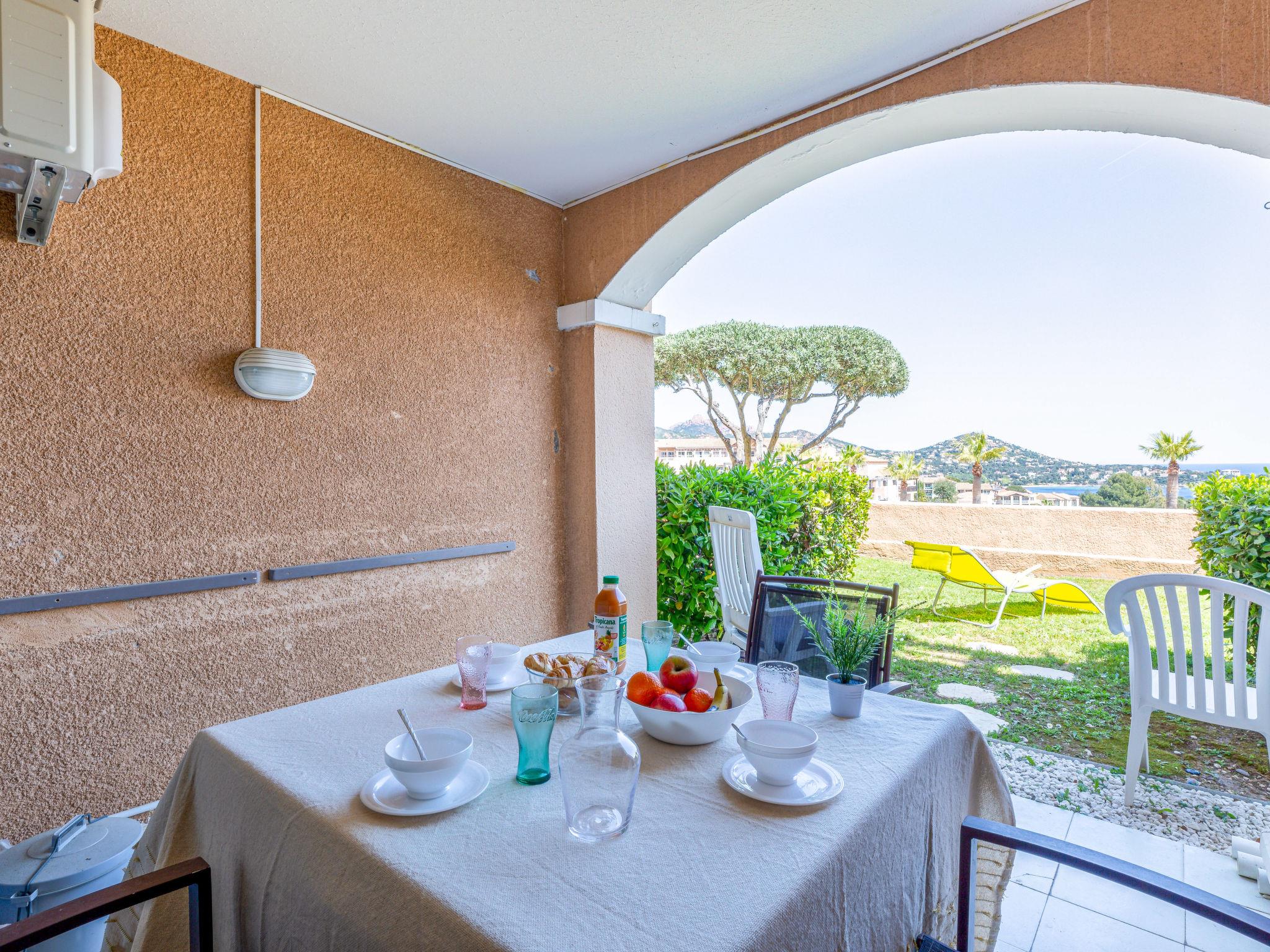 "Le Village (E1103)", 2-room apartment 30 m2, on the ground floor. Living room with 2 sofabeds (90 cm, length 190 cm), TV (flat screen), air conditioning. Exit to the terrace, to the patio. 1 room with 1 french bed (140 cm, length 190 cm), TV (flat screen). Kitchenette (4 hot plates, dishwasher, toaster, kettle, freezer, electric coffee machine, combination microwave). Shower, sep. WC. Terrace 14 m2, patio. Terrace furniture. Beautiful view of the sea. Facilities: washing machine. Internet (WiFi, extra). Parking space n 2649 (roofed, 1 car), height 180 cm. Please note: non-smokers only. Smoke alarm. Offer by a private individual according to Art. 155, IV of CGI.