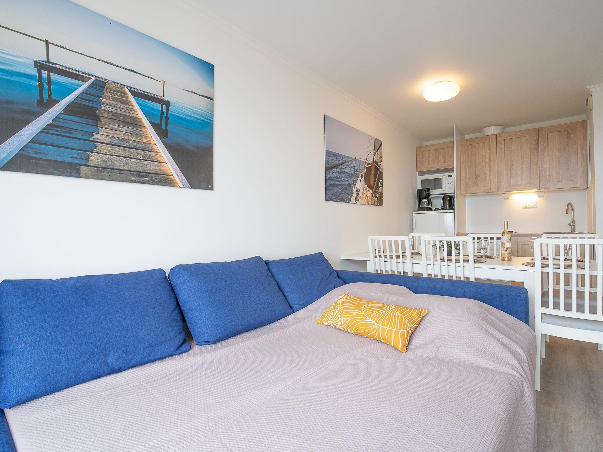 "Le Village (C4324)", 3-room apartment 39 m2 on 2nd floor. Living room with 1 double sofabed (140 cm, length 190 cm), TV (flat screen), fan. Exit to the terrace. 1 room with 1 french bed (1 x 140 cm, length 190 cm). 1 room with 1 x 2 bunk beds (80 cm, length 190 cm). Kitchenette (4 hot plates, dishwasher, toaster, kettle, microwave, freezer, electric coffee machine). Bathroom, shower/WC. Electric heating. Terrace 10 m2. Terrace furniture. View of the sea. Facilities: Internet (WiFi, extra). Parking space n 2018 (1 car), height 180 cm. Please note: non-smokers only. Smoke alarm. Offer by a private individual according to Art. 155, IV of CGI.