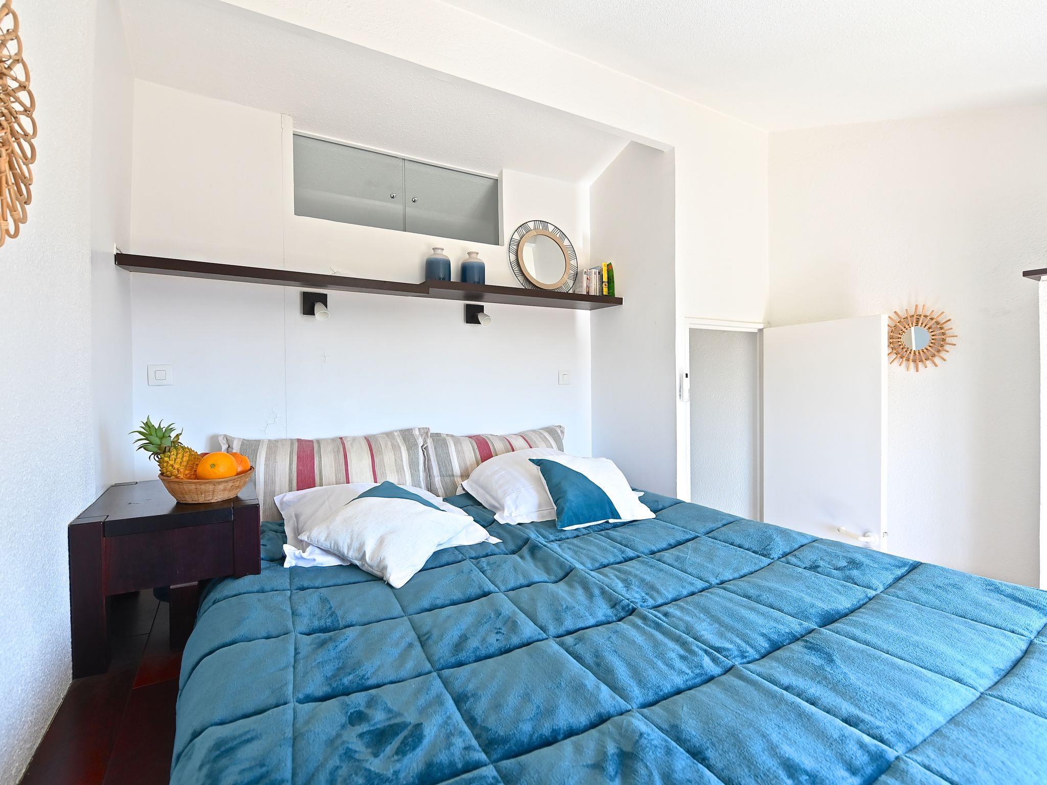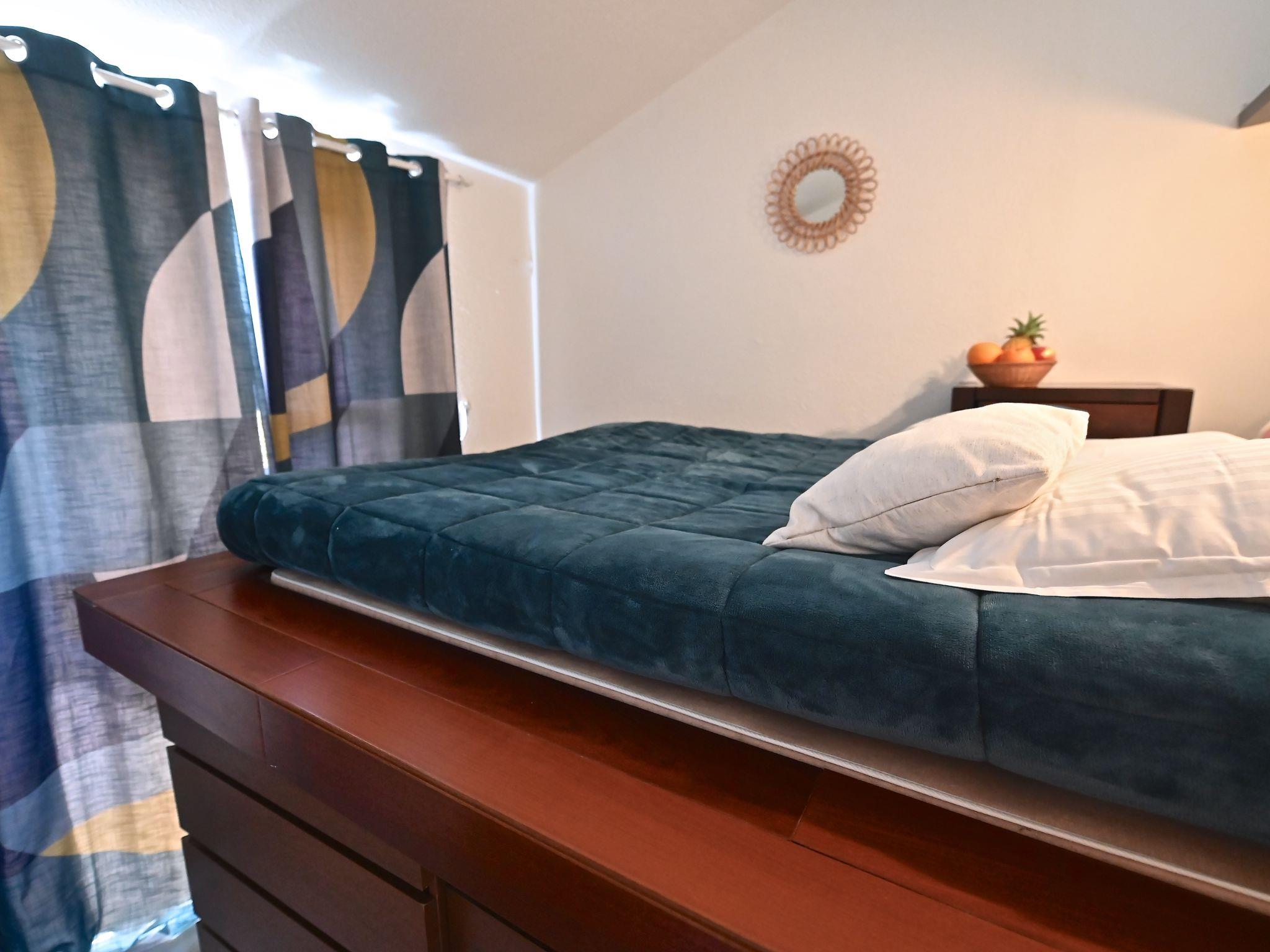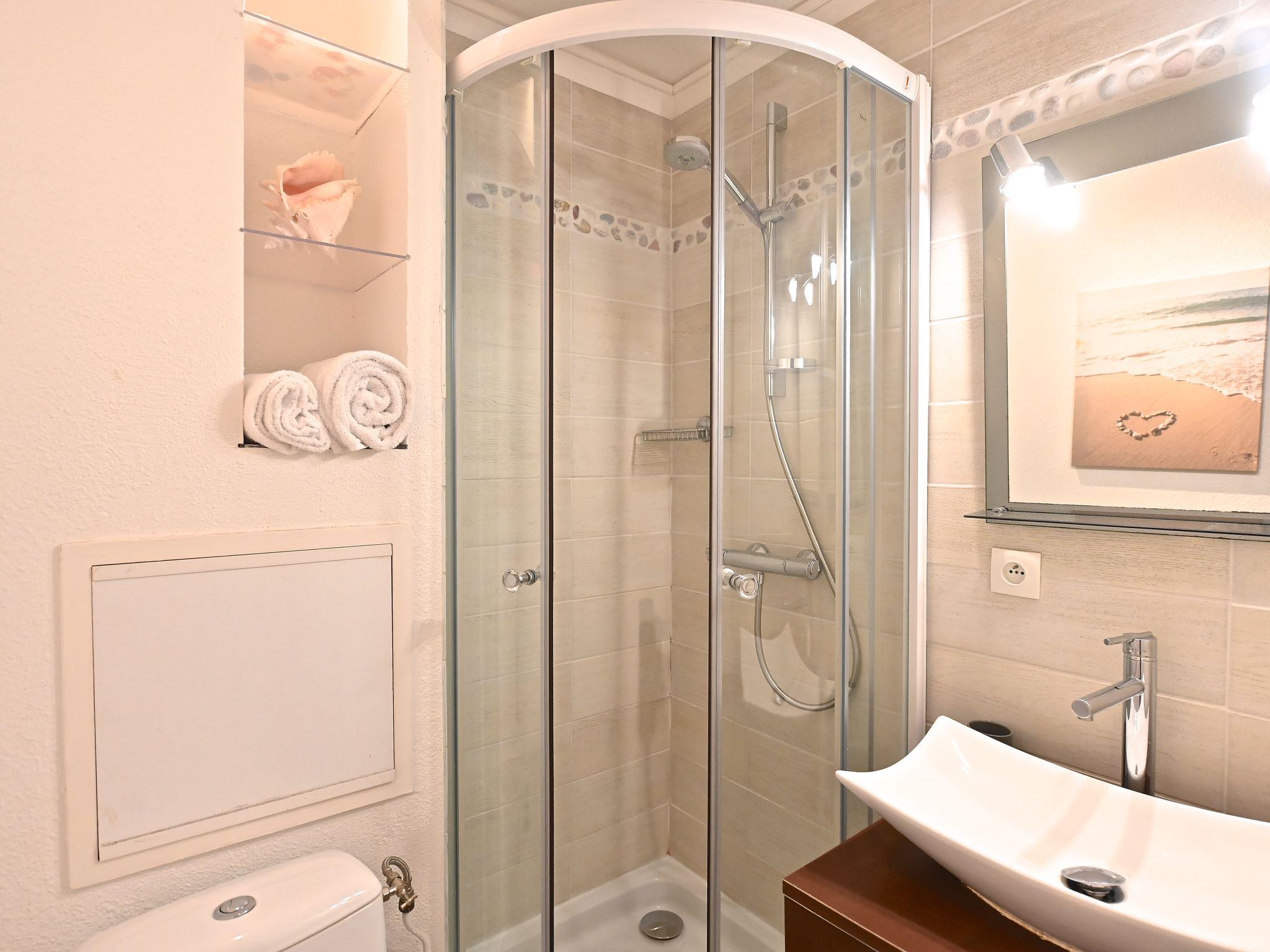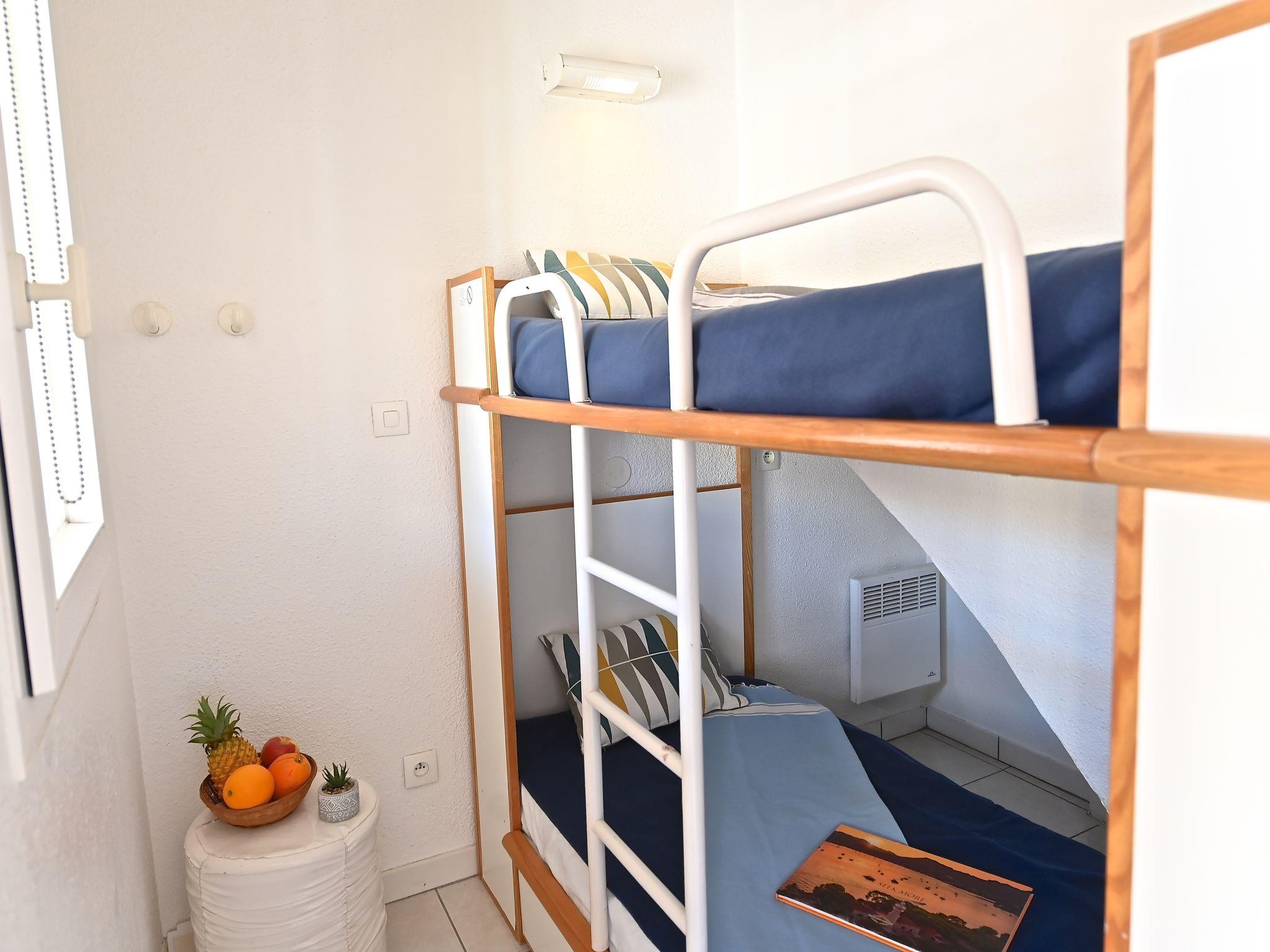 "Le Village (C0363)", 3-room apartment 40 m2 on 2 levels on 2nd floor. Living room with 2 sofabeds (80 cm, length 190 cm), TV (flat screen). Exit to the terrace. 1 small room with 1 x 2 bunk beds (80 cm, length 190 cm). Kitchenette (4 hot plates, mini-oven, dishwasher, toaster, kettle, microwave, freezer, electric coffee machine). Shower/WC. Electric heating. Upper floor: 1 room with 1 french bed (1 x 140 cm, length 190 cm), shower/WC. Exit to the terrace. 2 terraces 10 m2. Terrace furniture. Beautiful view of the sea. Facilities: Internet (WiFi, extra). Parking space n 2058 (roofed), height 180 cm. Please note: non-smokers only. Smoke alarm. Offer by a commercial proprietor according to Art. 155, IV, CGI
